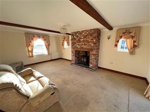 19' 4" x 13' 0" (5.90m x 3.97m) Full height brick chimney breast with multi fuel stove and raised hearth, triple aspect with UPVC windows to the front and side elevations, UPVC French doors to the rear, 2 radiators, ceiling light, coved cornice, 2 wall lights.