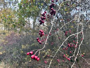The high canopy is mainly tall oak trees, as well as the russet-trunked Scots pines in scattered groupings, here and there.. A flourishing shrub layer of hawthorn and the odd holly gives a good deal of privacy, and along the tracksides, woodland edge shrubs, such as sloe bushes, offer up blossom in the spring as well as autumn fruits.