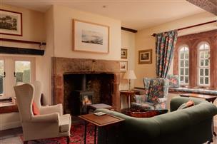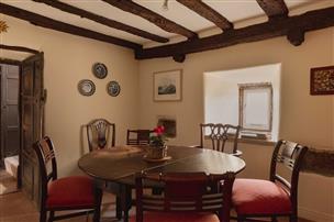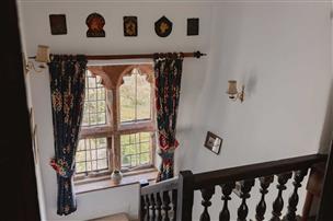 As you step inside, the stone flagged hall sets a confident tone, panelled oak doors quietly confirming the property’s period origins while the sightline leads to the original Tudor staircase and its double arched window at the half landing. To the right, a comfortable living room with windows on two aspects gathers seating around a wood burning stove set in a broad stone fireplace. Across the hall, the larger sitting room is defined by a deep fireplace, a broad mullioned window and exposed sixteenth century beams, well suited to evenings and company. Off the hall sits a dining room beneath oak beams; its deep-set window cut into thick stonework. It is well placed for intimate meals and works equally well as a study or occasional fourth bedroom, helped by the ground floor WC nearby.