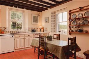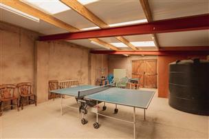 The kitchen diner is bright and practical. Dual aspect sash windows look over the garden to the fells, while exposed timber beams and quarry tiles lend an authentic, durable finish. A deep blue electric Aga provides the focus of a run of cream cupboards with generous worktops, an integrated fridge and a dishwasher. There is ample space for a family table. From here a back hall leads out to the stone terraces and side garden. Along the way are hanging and shelving for coats and boots, a generous store cupboard and a ground floor WC. The route then continues to the service outbuildings shown on the plan, the utility and boot room, a garden store and a small workshop, with external steps rising to the large barn beyond.