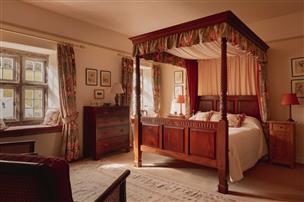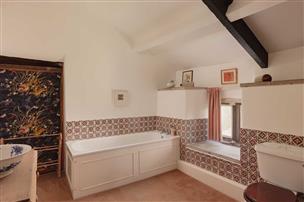 At first floor level the landing opens to three bedrooms and the family bathroom. The principal bedroom is exceptional in scale and character. Two broad mullioned windows, each with a deep stone seat, draw in soft light and frame the view, while a decorative cast iron fireplace anchors the room. It takes a four poster bed with space to spare. The en suite is well proportioned and arranged with bath, basin and WC, retaining pleasing period detail. A second double shares the same front aspect and early fabric, while a third double sits to the back of the house, with fitted wardrobes and a long view over a sandstone terrace and garden towards the fells, and is reached up a short rise. The family bathroom is next to it and includes decorated handmade tiling, a bath with electric shower over, basin and WC. A linen cupboard completes the arrangement.