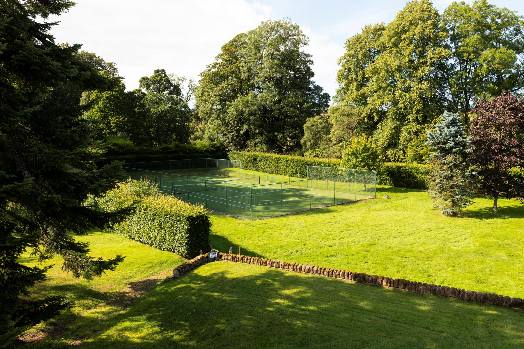 The 29.28-acre grounds feature formal lawns, gardens, parkland, paddocks, a walled garden with greenhouses, raised beds, orchard, pond, and a tennis court.