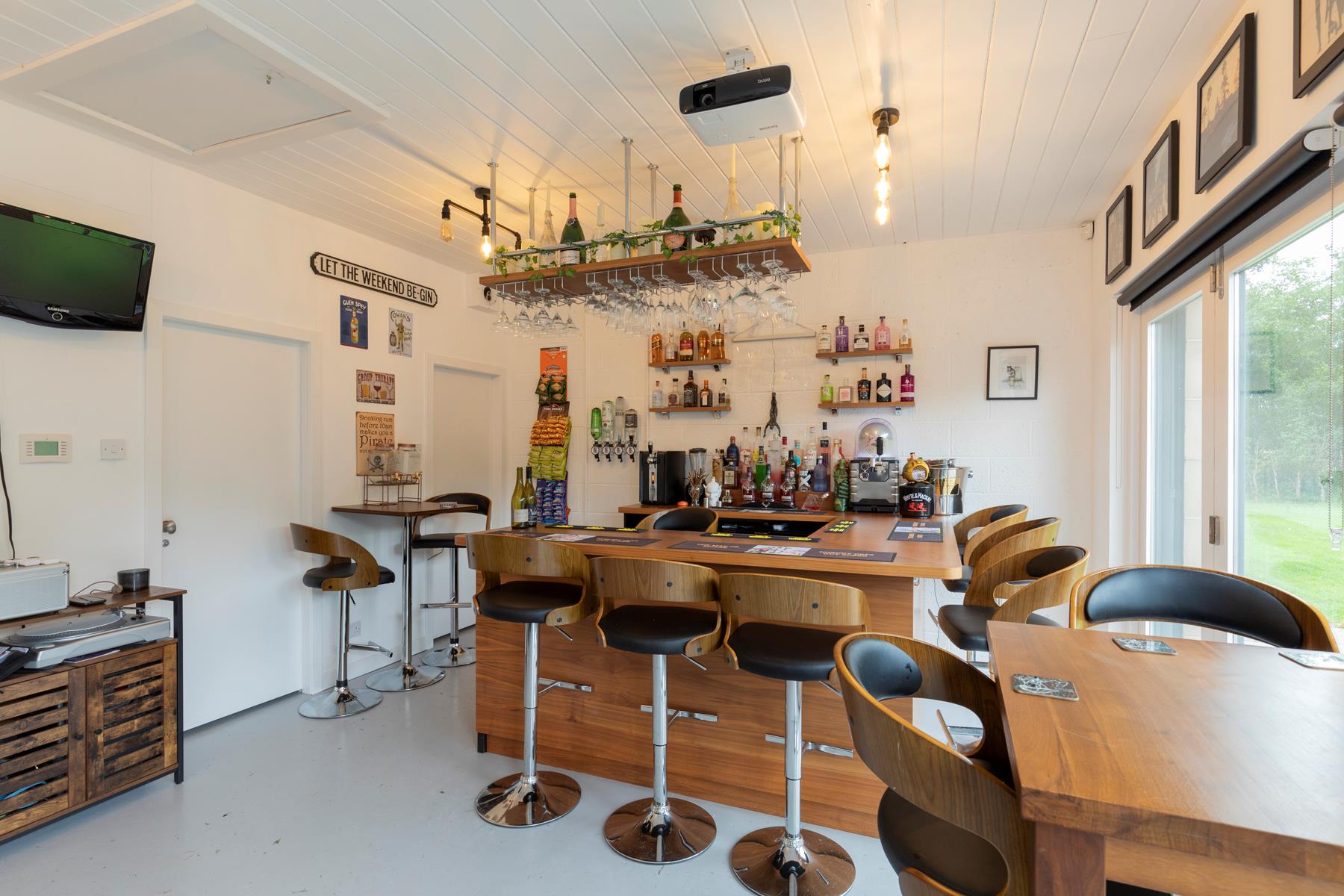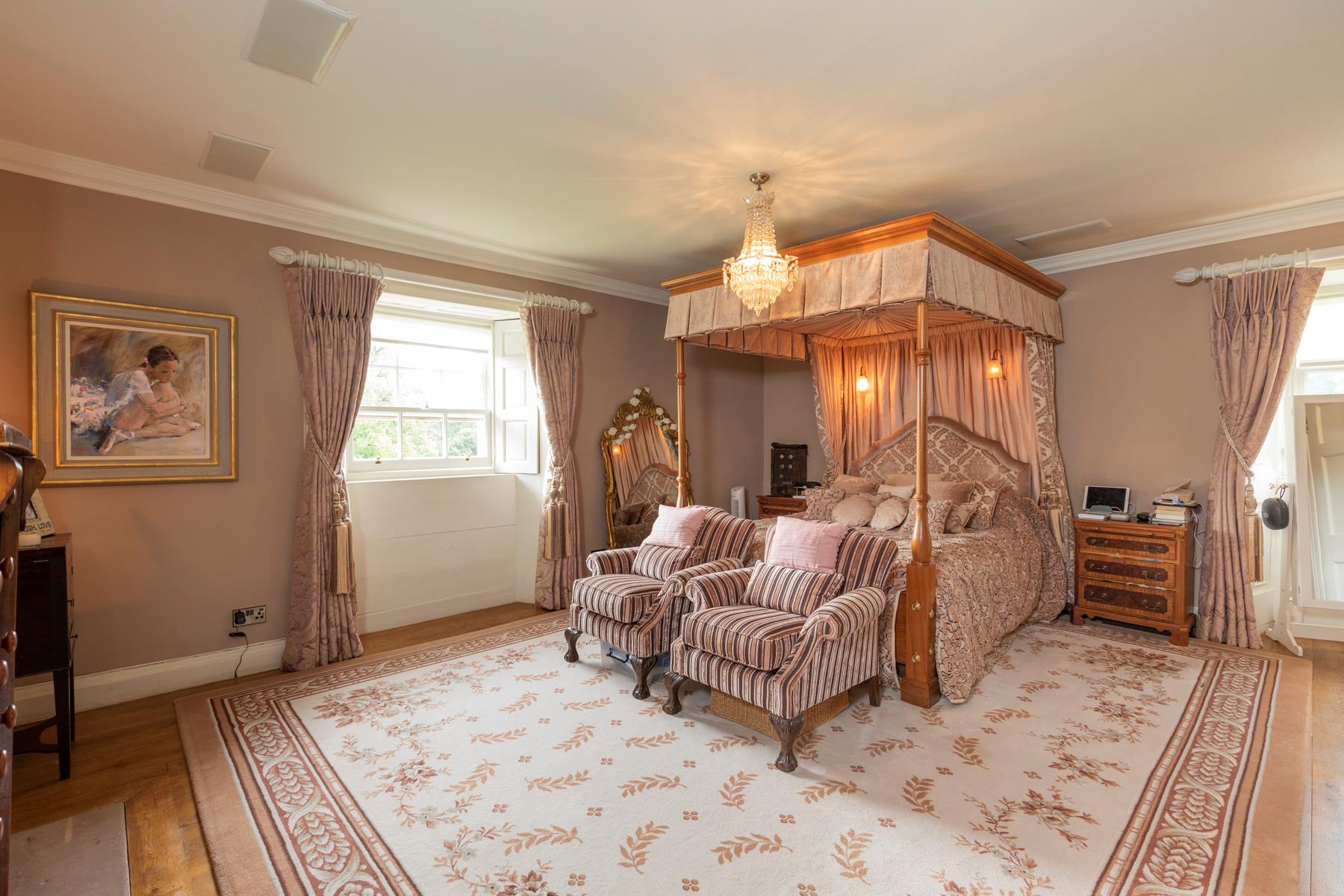 Modern enhancements include ground source heating and an integrated surround sound system throughout the principal rooms, including the kitchen/dining room, living room, drawing room, dining room, and principal bedroom suite.