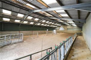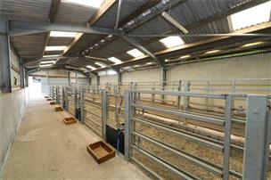 Steel portal frame construction, concrete panels/ breeze block walls, box profile cladding, fibre cement roof, concrete floor. Split into cattle pens.