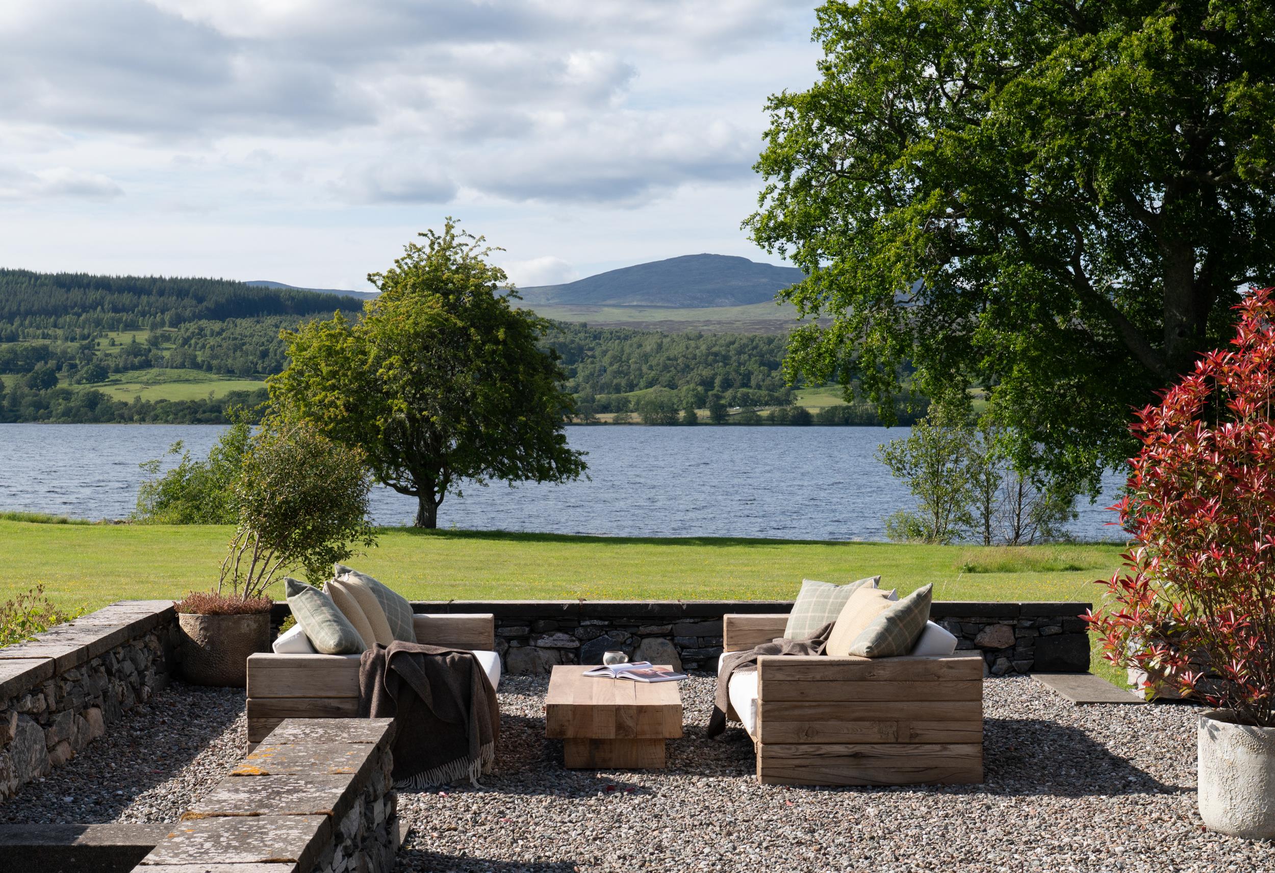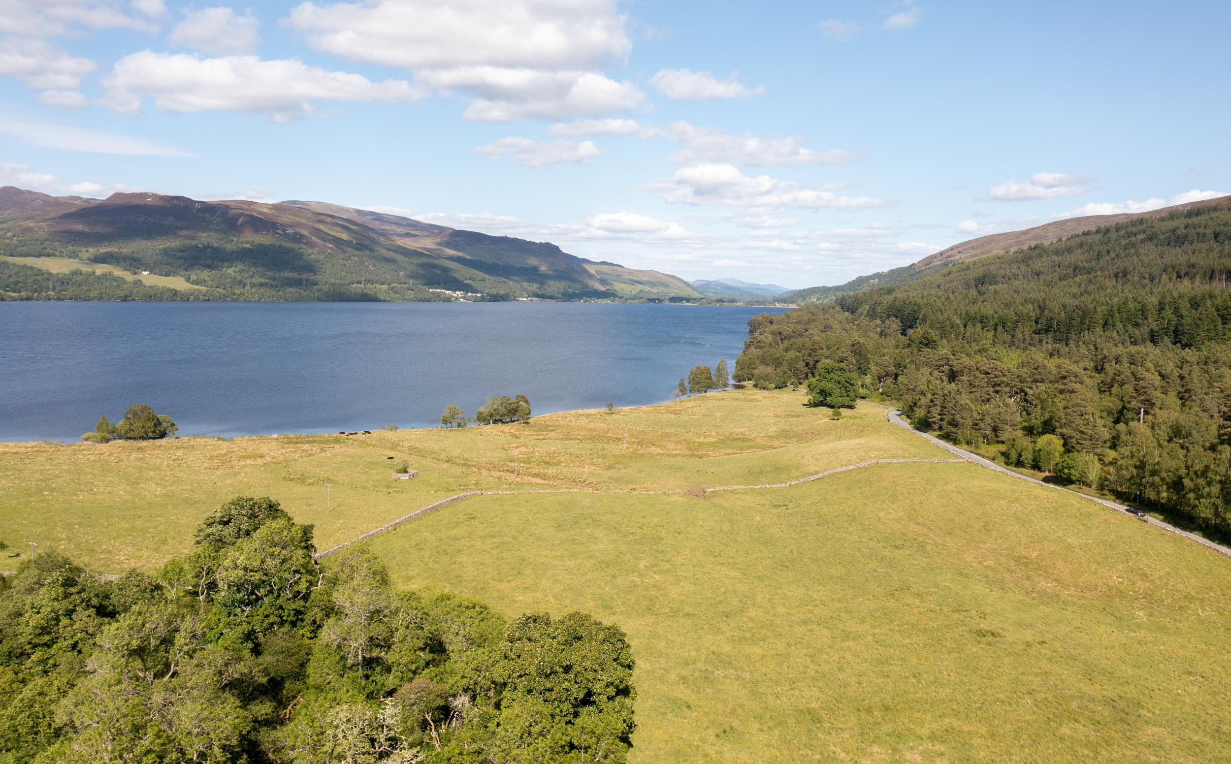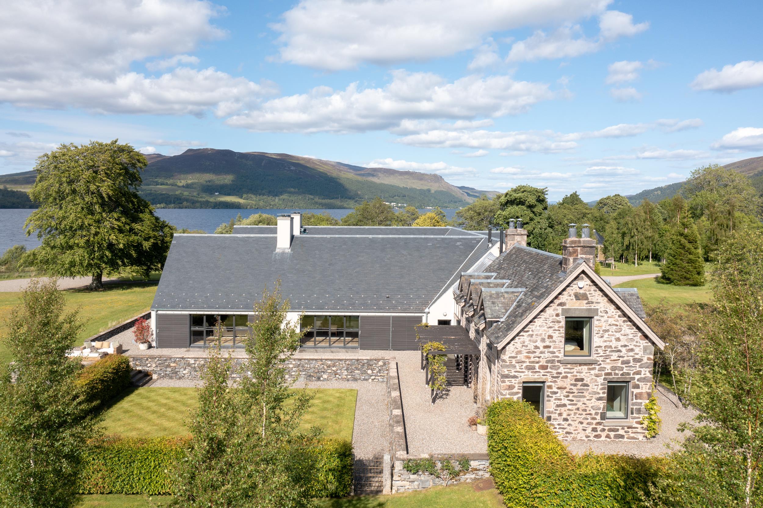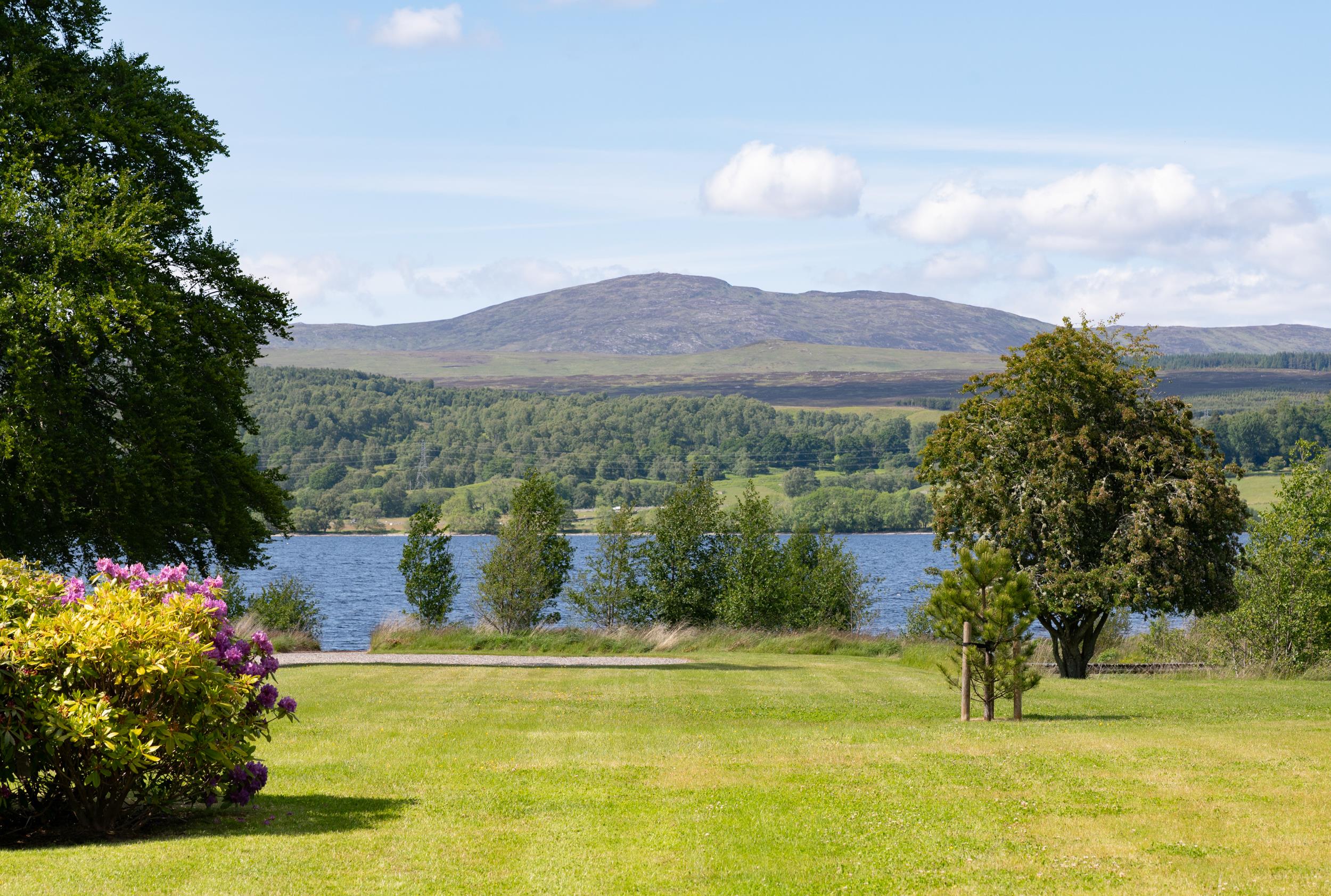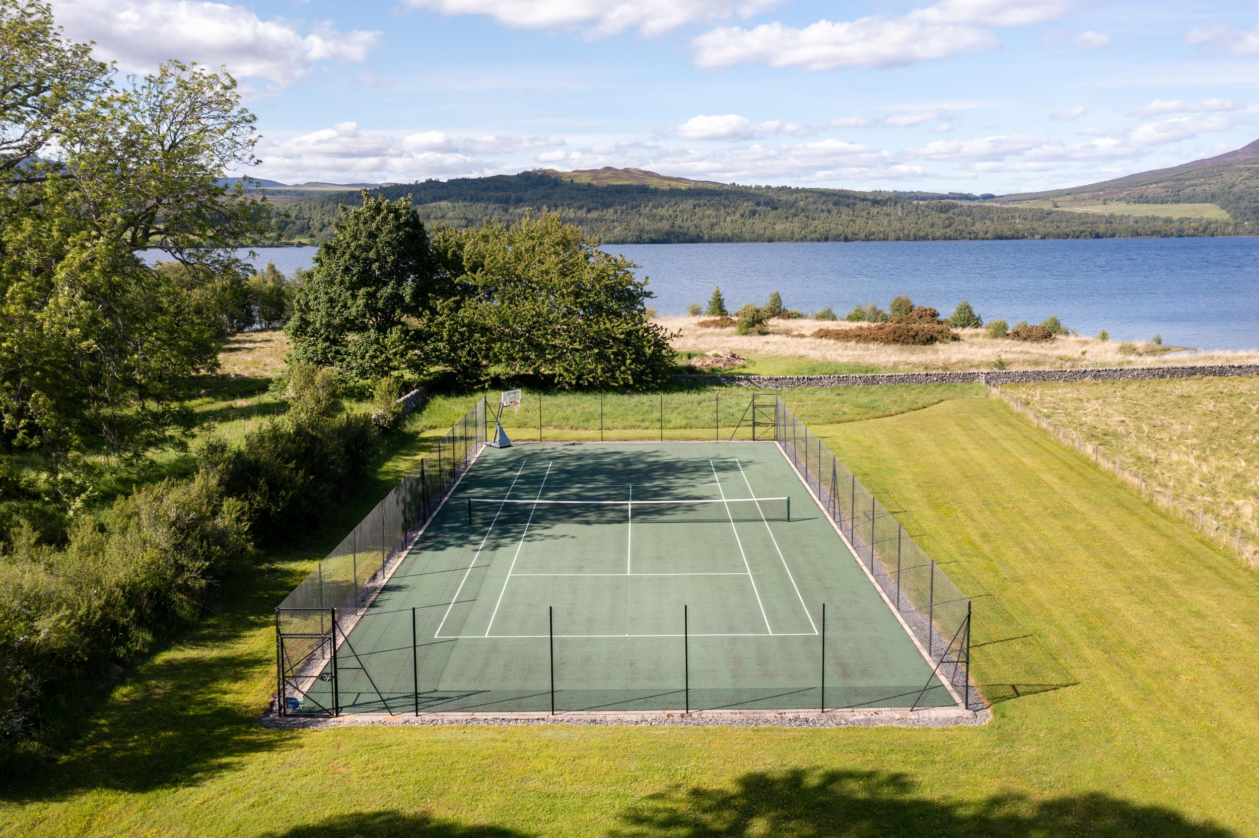 The gardens blend formal and natural landscapes with clipped hedges, pleached Malus Everest, and over 16,000 spring bulbs. Indigenous trees, lawns, and mature woodland frame the grounds, which extend to 58.18 acres: 37.31 acres of pasture, 6.86 of gardens and buildings, 6.44 of rough grazing, and 4.83 of woodland. Amenities include a tennis court, a jetty, slipway, and over 1,000 metres of loch frontage with riparian rights for fishing.