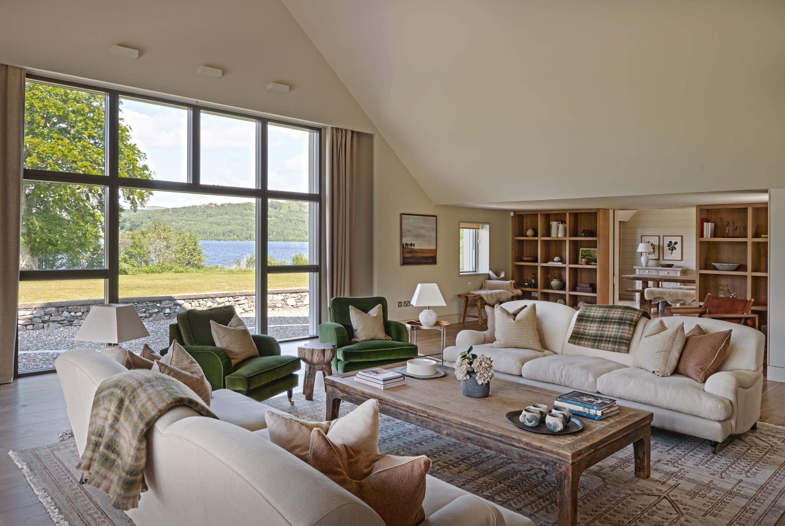 The vaulted entrance hall features engineered oak flooring, tongue and groove panelling, and full-height windows overlooking the loch. Reception rooms benefit from pocket sliding doors and dual-aspect views. The vaulted kitchen includes Bulthaup units, oak flooring, a Morso wood-burning stove, a large island, Caithness stone worktops, and premium Miele and Gaggenau appliances. A pantry offers additional fridges, freezers, oak-lined larder storage, and a butler's sink.