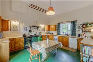 The kitchen/dining room is an excellent size, with double height ceiling and a dual aspect, as well as glazed doors leading to both the inner courtyard and to the front terrace and garden. The kitchen is fitted with a range of solid wood units and complementary worksurfaces, and there is an electric Aga (connected to the solar and hydro systems). Adjacent to the kitchen is a useful pantry/store area, with WC off.