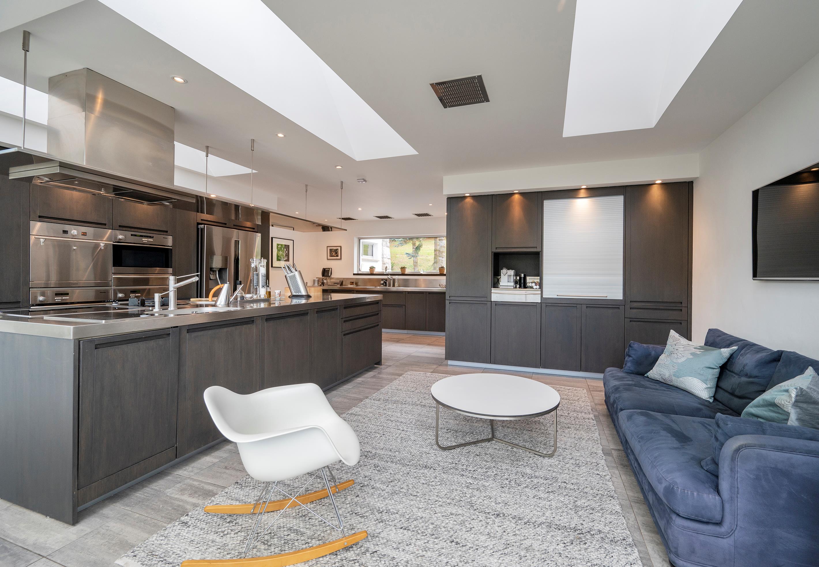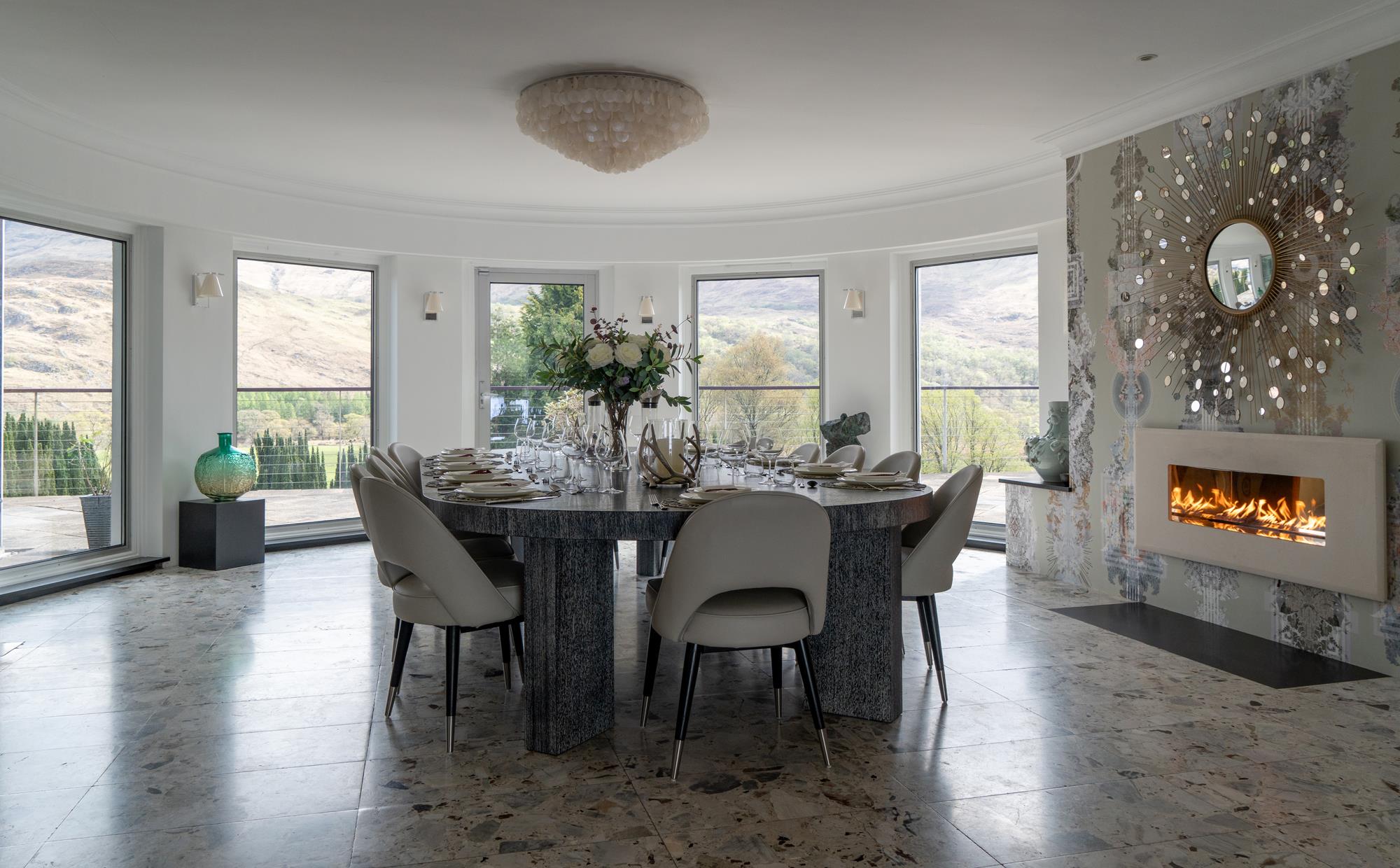 Invercreran House is constructed of concrete and harled brick under a slate roof. The house, with a south facing setting, has a number of unusual features including Italian marble floor and a south-facing terrace running the full length of the house. The house is approached by a tarmac driveway which is flanked by a mature Yew avenue. The drive ends in a sweep behind the house. A particular feature of the house is that all the principal rooms have south-facing views across Glen Creran to the hills beyond. An impressive arched granite entrance has steps leading up to the entrance hall forming the upper ground floor of the property. The property has many internal features, including the dining room with a feature gas fireplace and an Italian marble floor. A curved wall of French windows open up onto the terrace. The magnificent drawing room, which is over 12 metres in length, has stunning views across Glen Creran. The room includes parquet flooring, a feature gas fireplace with stone surround, and three floor-to-ceiling windows open out onto the terrace. The Boffi design dining kitchen is another wow-factor room with a large central island and a dining area within a glass-enclosed area that overlooks the terrace.