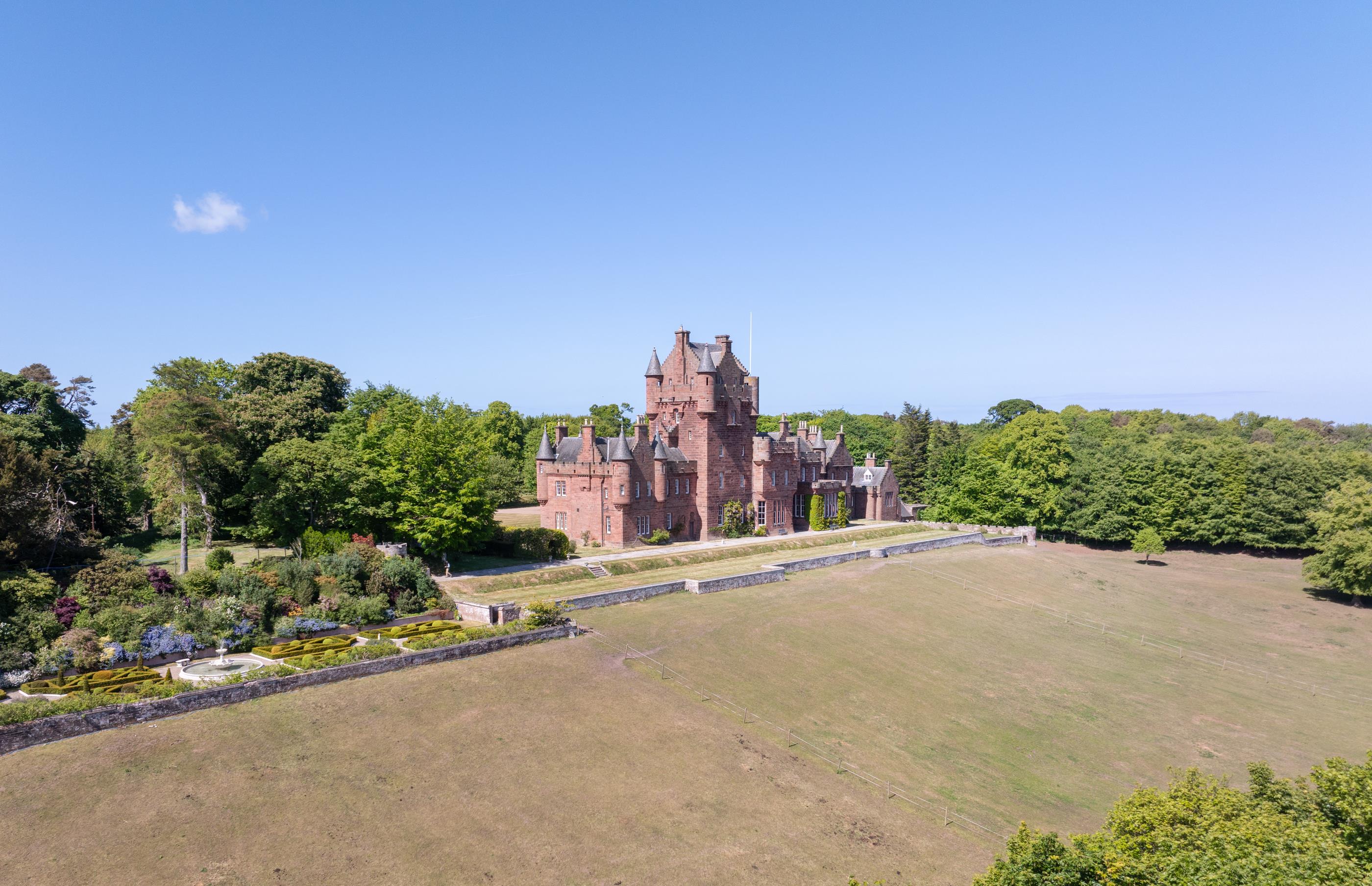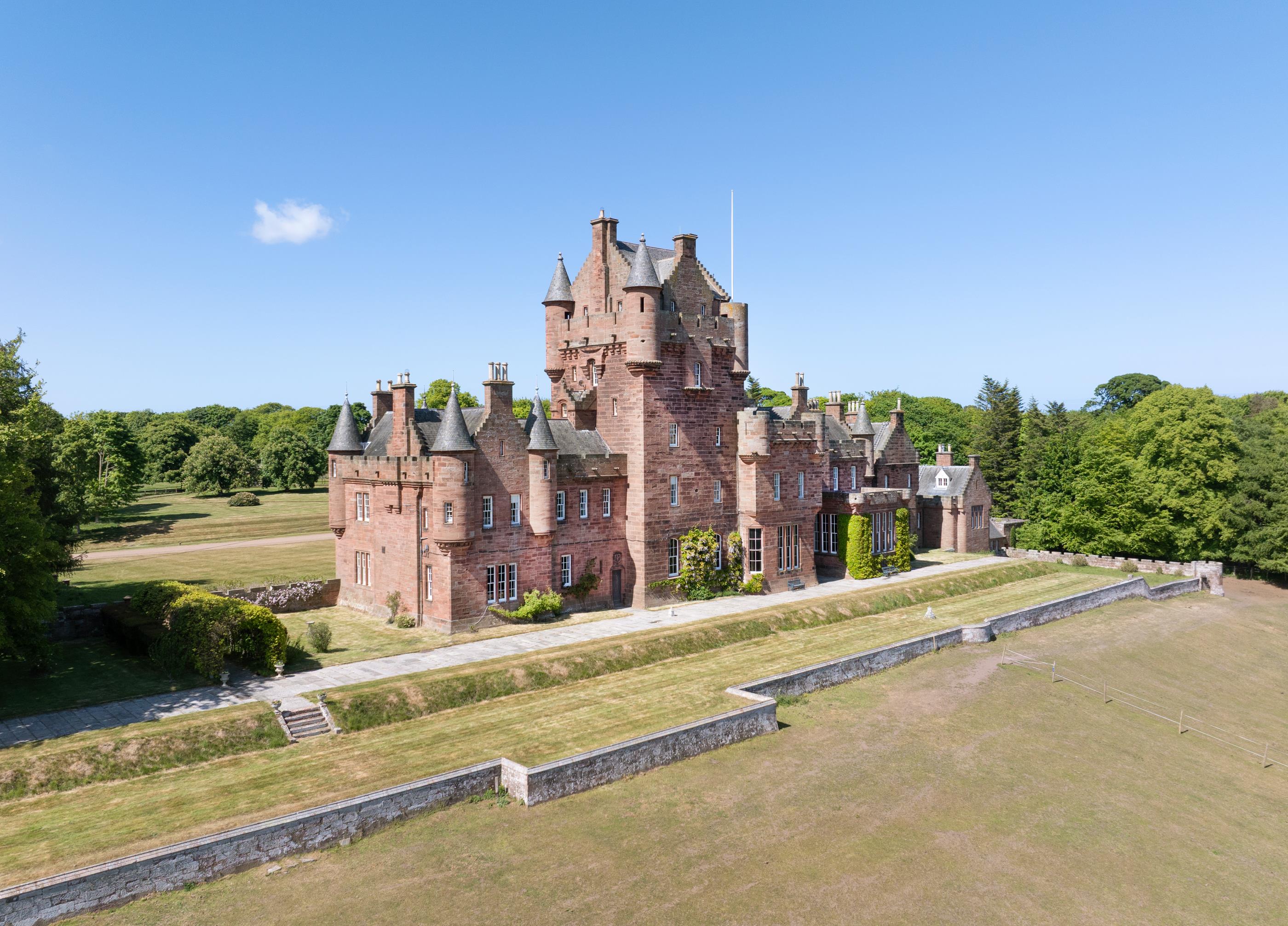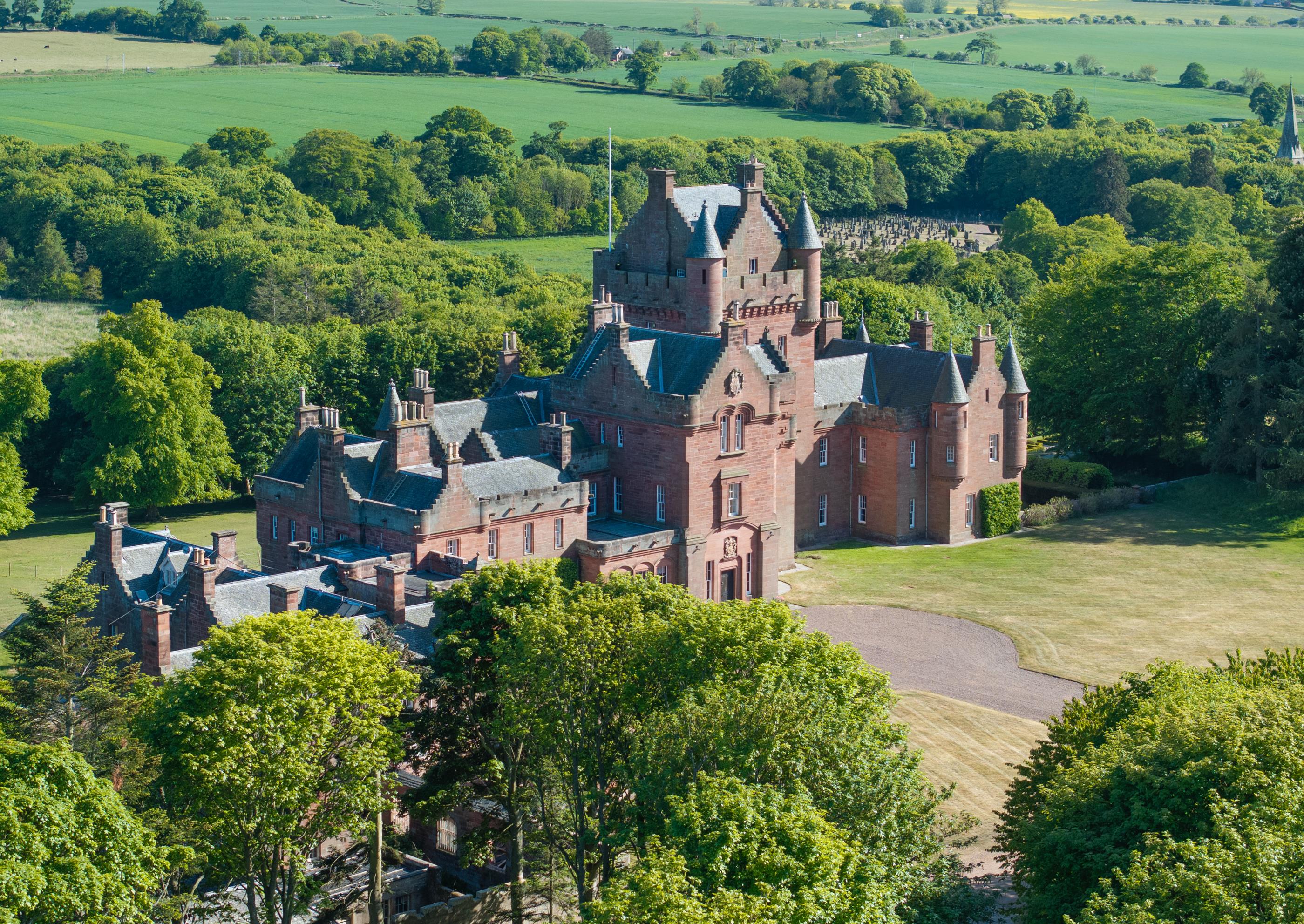 Ayton Castle is widely regarded as Scotland's finest baronial-style building and was designed by James Gillespie Graham, Scotland's leading Gothic revival architect of the early 19th century. The castle is a magnificent example of a Scots baronial house, primarily over two storeys, with a five-storey Great Tower. The castle is built of squared and snecked red sandstone with sandstone ashlar dressings, corbelled eaves with rope moulded corbelling to the turrets, crenelated parapets, crow-step gables and roll-moulded stone sills. Since the last sale in 2014, the current owners have undertaken significant improvements. These include significant building works, partial rewiring, re-plumbing and the redecoration of several of the principal rooms. They have also created a formal garden to the southern front of the house and installed a 10?-inch gauge railway which winds through part of the grounds. Ayton Castle is accessed primarily via South Lodge, from where the gravel driveway winds through mature policy woodlands before opening out into a broad gravel car parking area flanked by extensive lawns adjacent to the principal entrance on the northern front. The entrance opens into the main hall with its adjacent inner hall, and from there the gallery forms a ground floor spinal corridor running from northeast to southwest to the formal reception rooms.