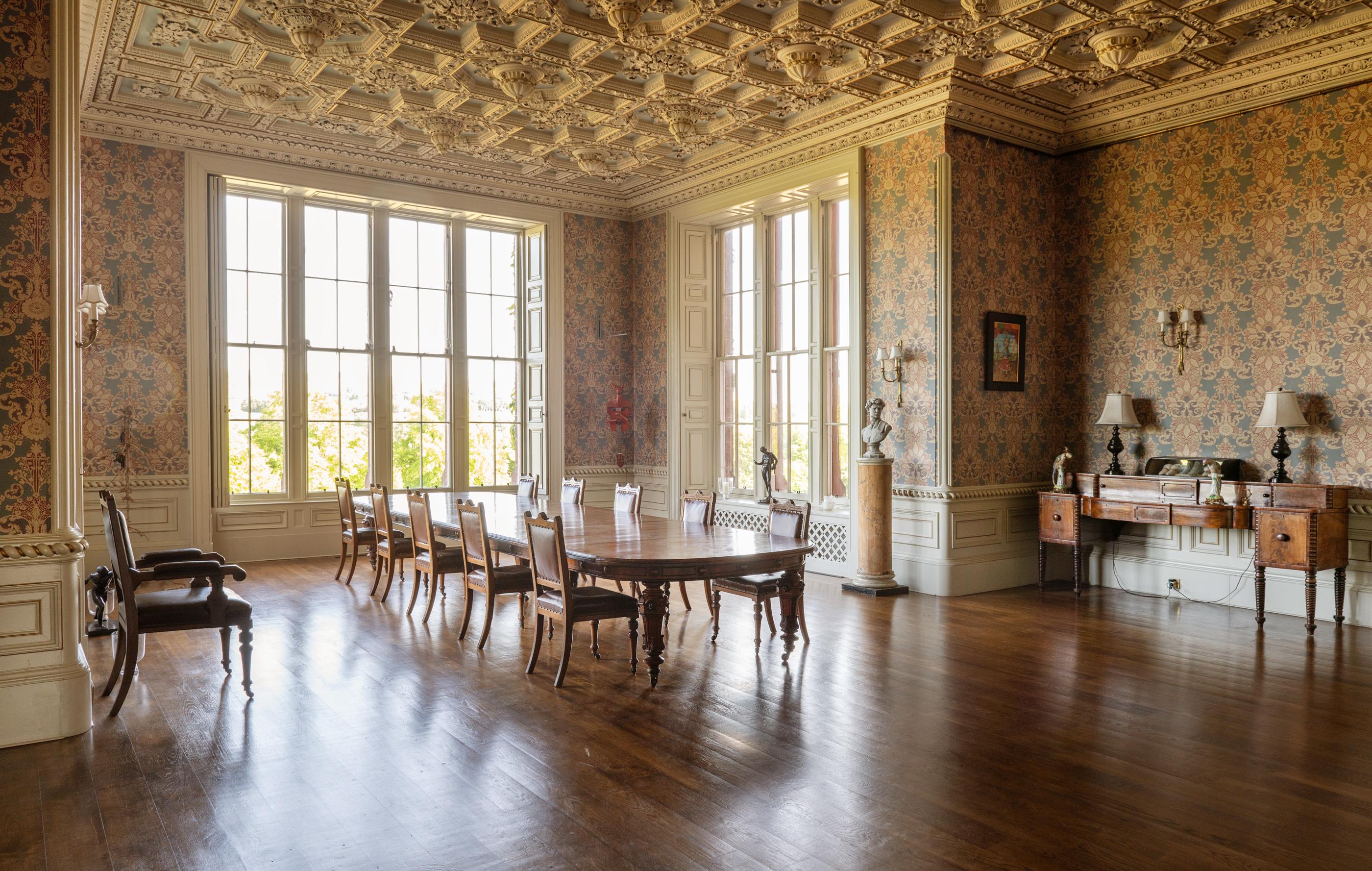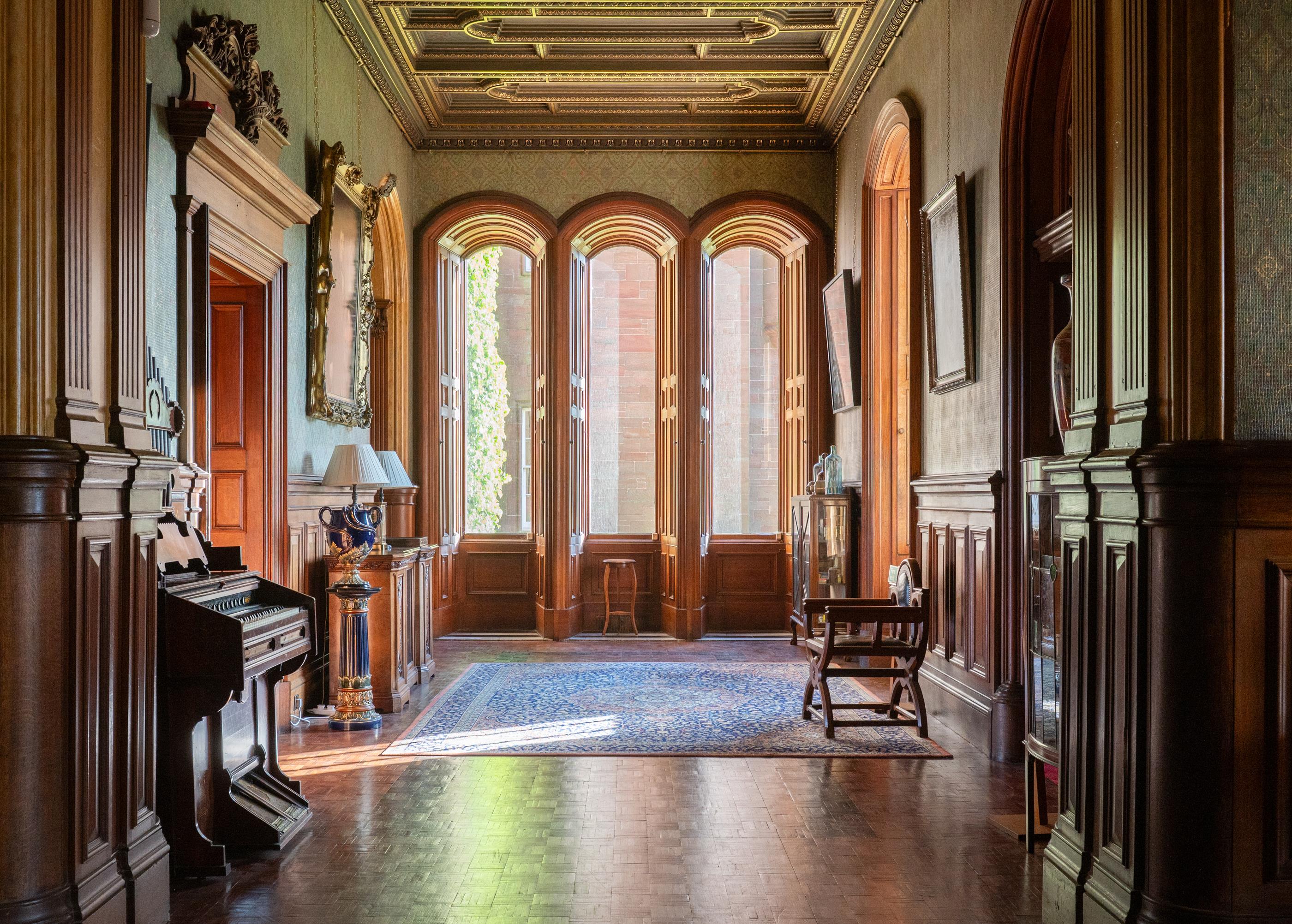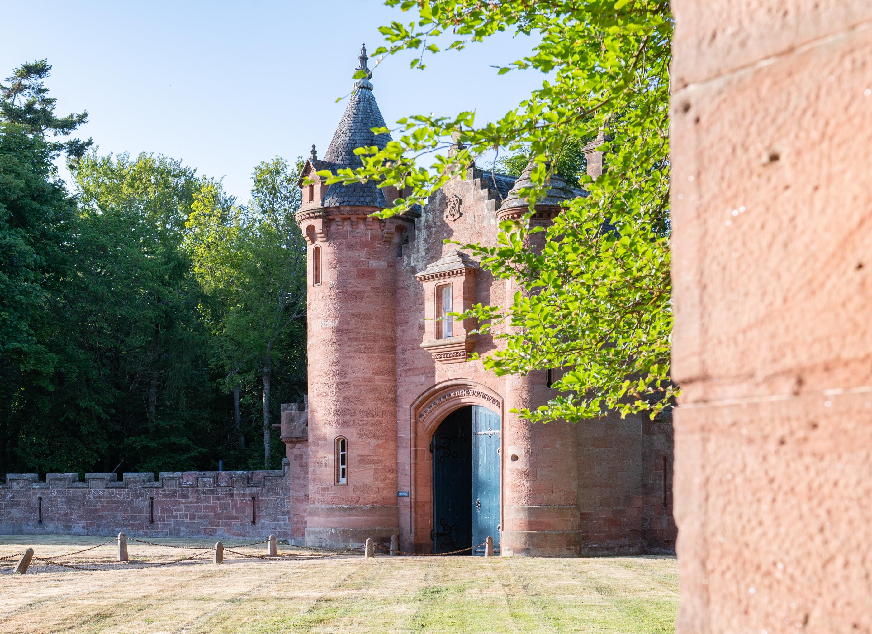 Ayton Castle is widely regarded as Scotland's finest baronial-style building and was designed by James Gillespie Graham, Scotland's leading Gothic revival architect of the early 19th century. The castle is a magnificent example of a Scots baronial house, primarily over two storeys, with a five-storey Great Tower. The castle is built of squared and snecked red sandstone with sandstone ashlar dressings, corbelled eaves with rope moulded corbelling to the turrets, crenelated parapets, crow-step gables and roll-moulded stone sills. Since the last sale in 2014, the current owners have undertaken significant improvements. These include significant building works, partial rewiring, re-plumbing and the redecoration of several of the principal rooms. They have also created a formal garden to the southern front of the house and installed a 10?-inch gauge railway which winds through part of the grounds. Ayton Castle is accessed primarily via South Lodge, from where the gravel driveway winds through mature policy woodlands before opening out into a broad gravel car parking area flanked by extensive lawns adjacent to the principal entrance on the northern front. The entrance opens into the main hall with its adjacent inner hall, and from there the gallery forms a ground floor spinal corridor running from northeast to southwest to the formal reception rooms.