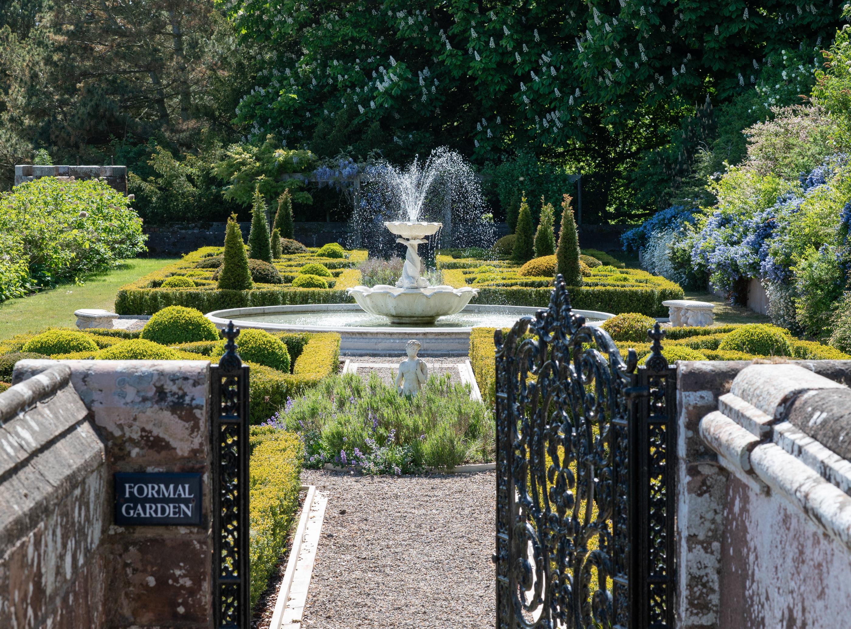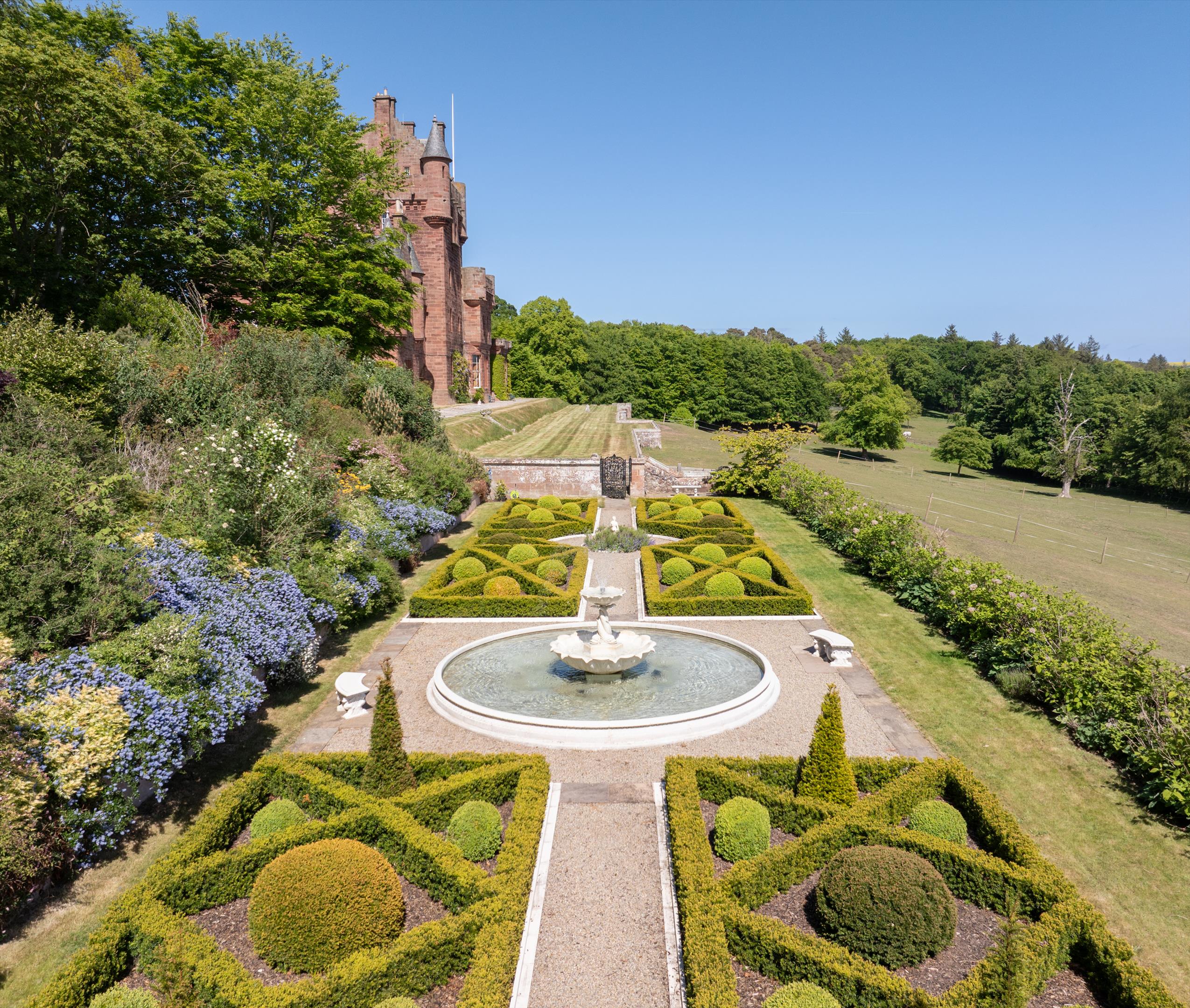 The gardens and parklands form part of a Category B-listed designed landscape incorporating the Upper and Lower Pinetums. Adjoining the southern front is the formal terraced garden with sandstone retaining walls, gravel paths, box hedges and an impressive fountain. Generous lawns frame the driveway turning circle to the north. Concealed within the grounds is a 16th century dovecote, restored in the 18th century, and a subterranean ice-house.