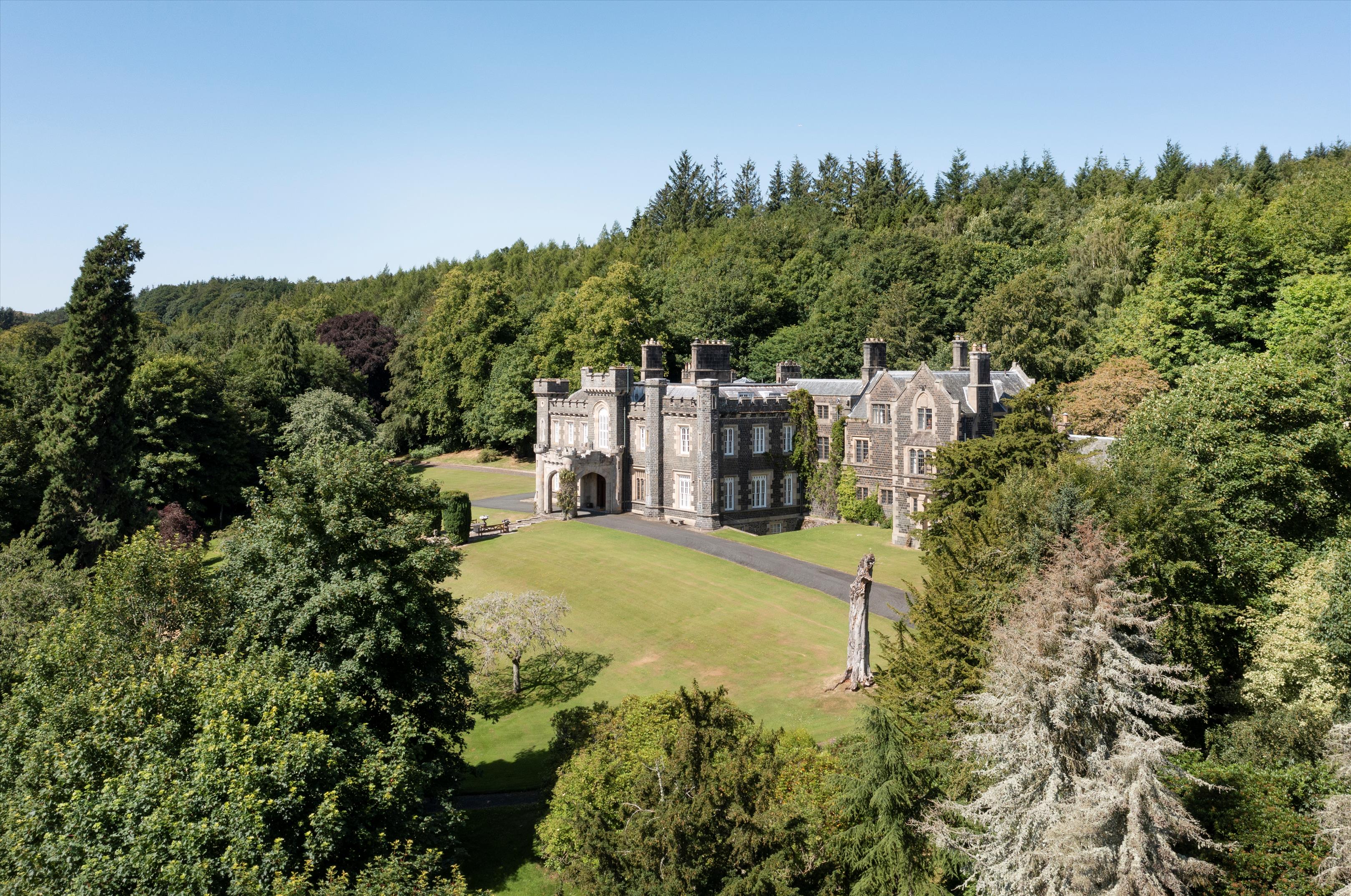 Bowland House is a castellated Tudor-Gothic mansion built around 1813-15 to designs by James Gillespie Graham, set with far-reaching views across an attractive mosaic of green sloping parkland and mature trees.