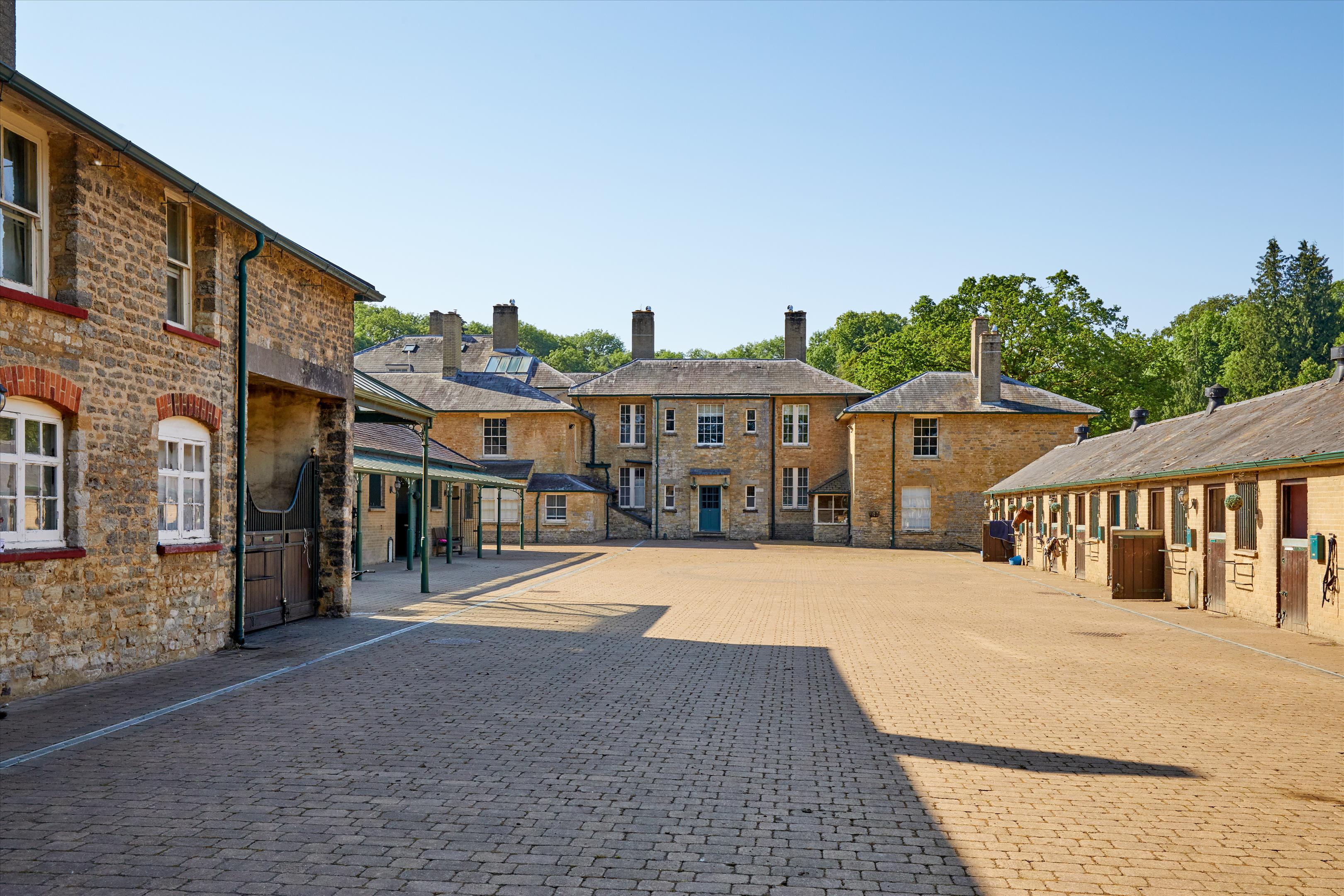 Arranged around a large, enclosed stone paved courtyard area is an arrange of 14 stables, with two wash rooms, a tack room, rug room, stock area, feed area and yard WC. Close by is the six-horse walker, a boiler room and two car ports and a garage.