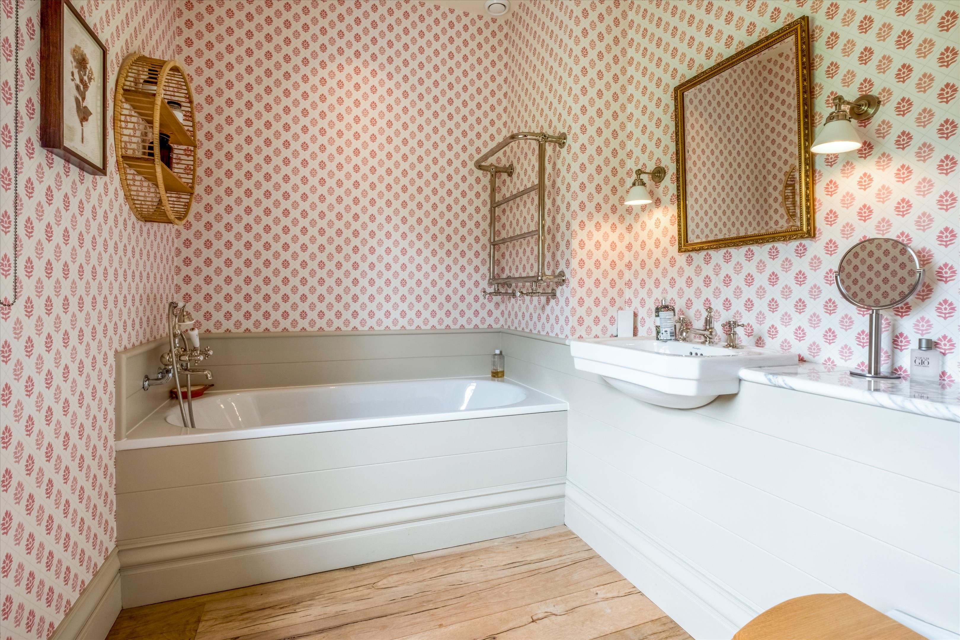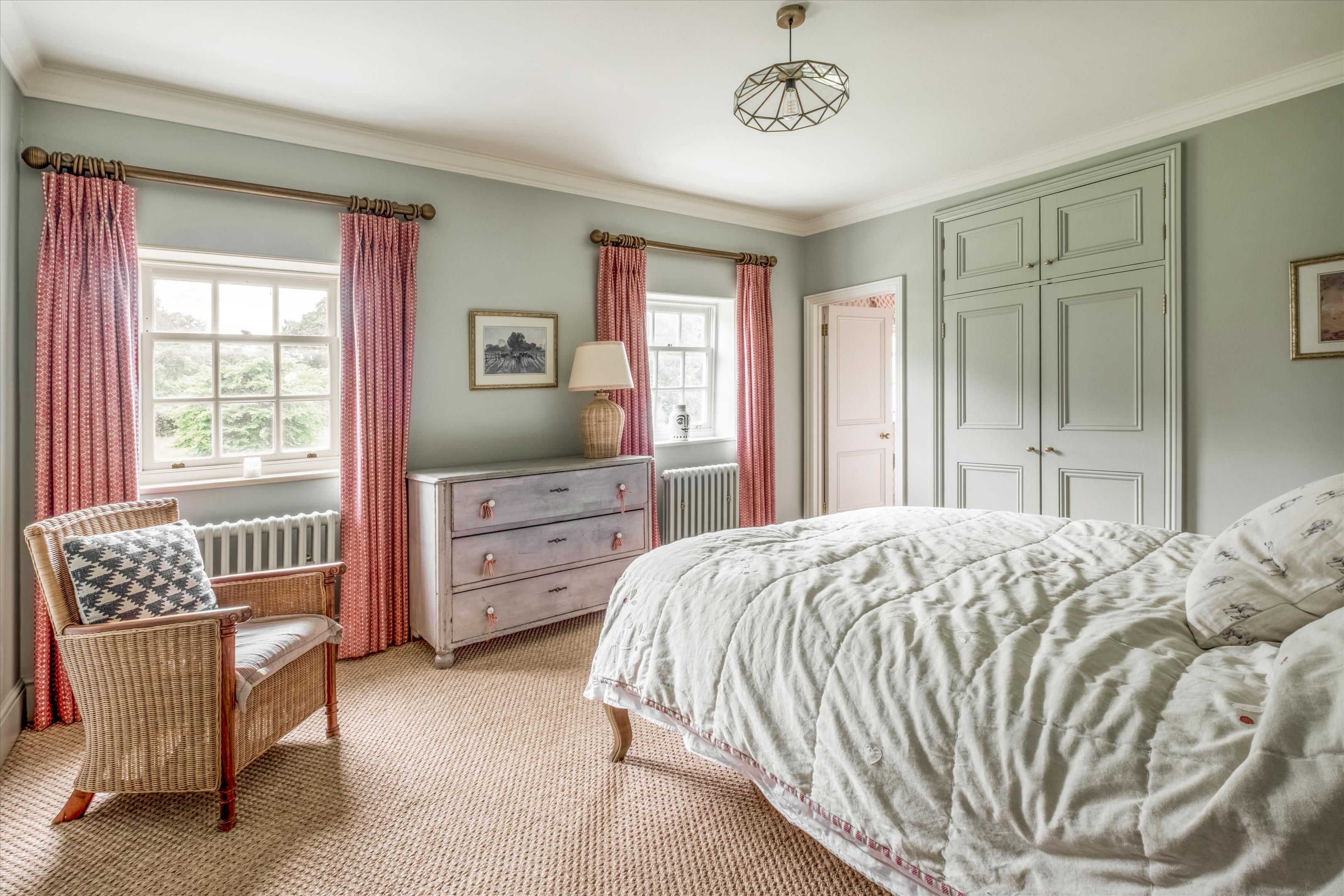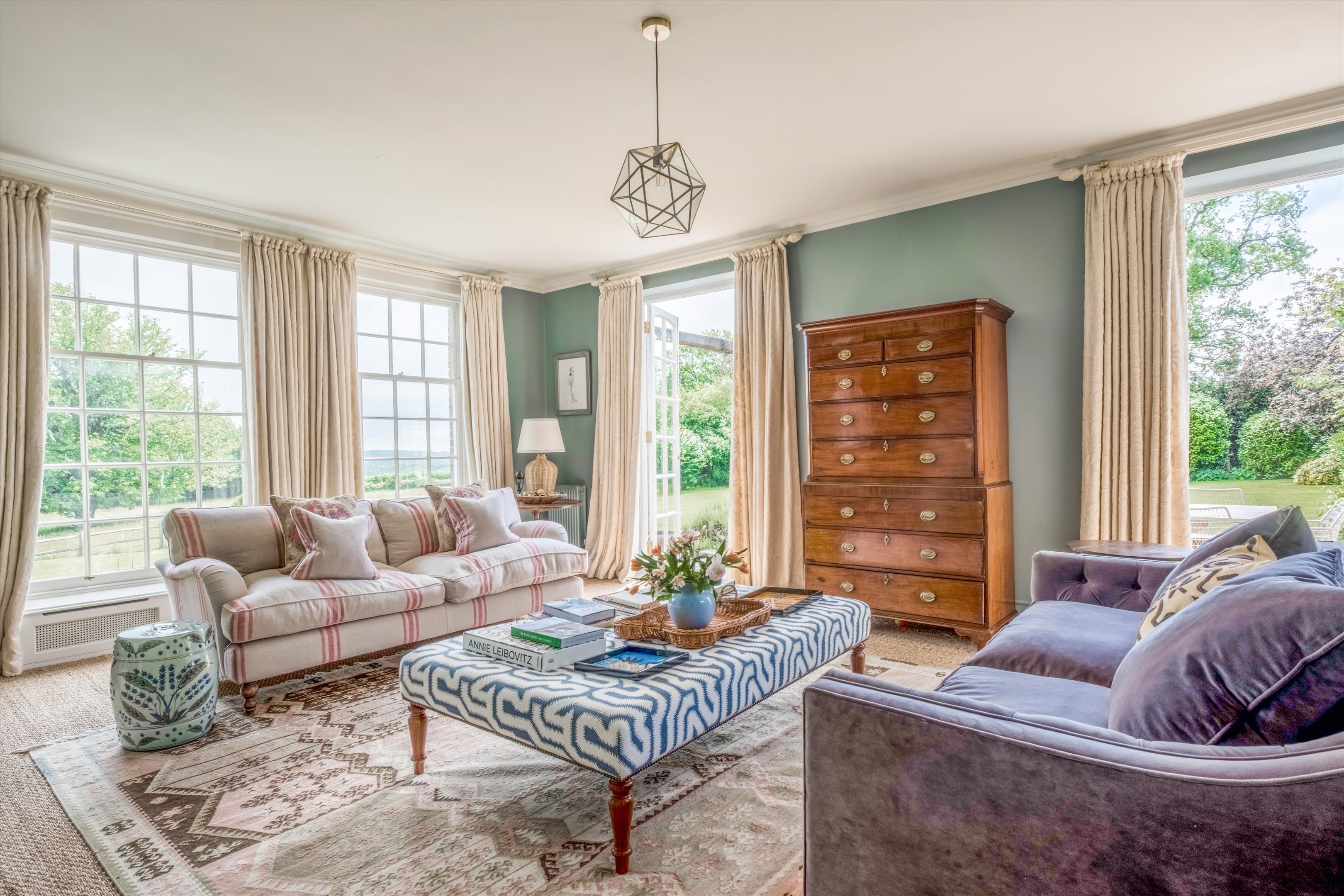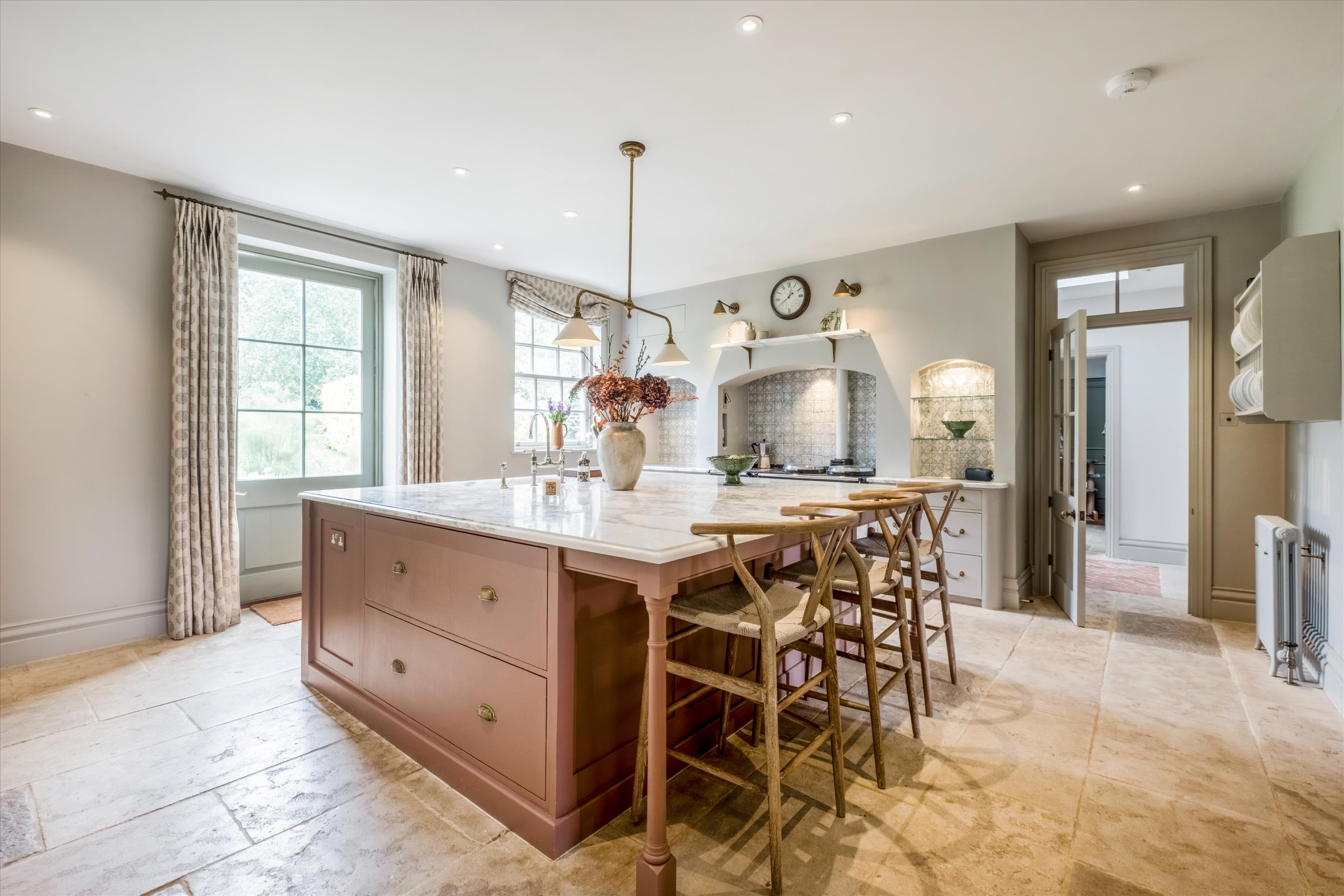 The well-appointed kitchen is the heart of the house and includes extensive bespoke fitted cupboards, marble worktops, a large kitchen island with breakfast bar, an Aga, pantry and large stone tile flooring. A door leads out to the rear garden. Adjacent to the kitchen is a dining room with sash windows framing the wonderful views over the surrounding countryside. The sitting room has a newly installed log burner and sash windows overlooking the rear garden.