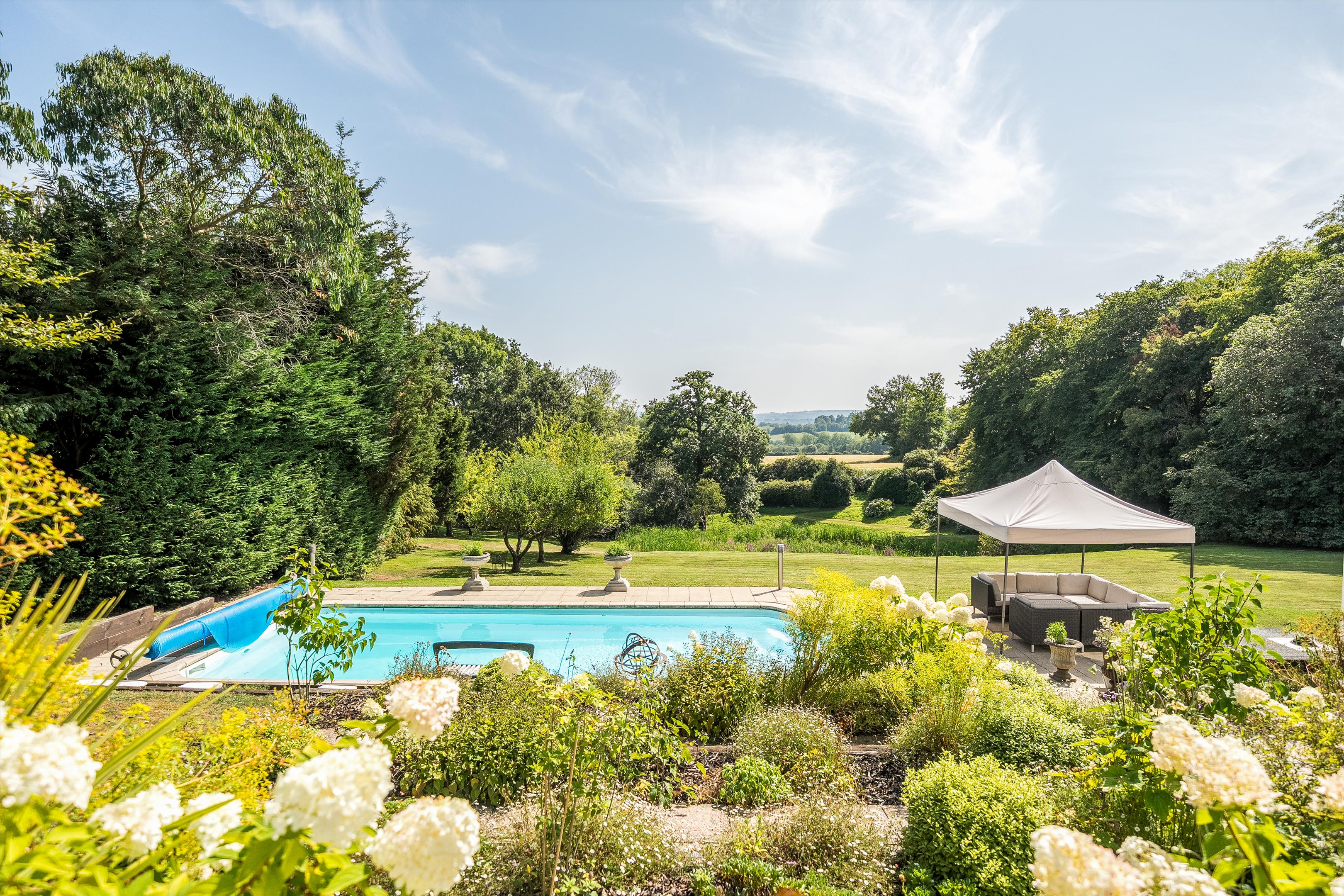 Outside, the property is approached via a private drive with electric gates that leads to a large parking area for several cars. The wrap around garden has been beautifully landscaped and extends to approximately five acres with a heated swimming pool, large pond, woodland area and majestic lawns with southerly views across the beautiful surrounding countryside. There are a variety of outbuildings including a garage and brick built potting shed.