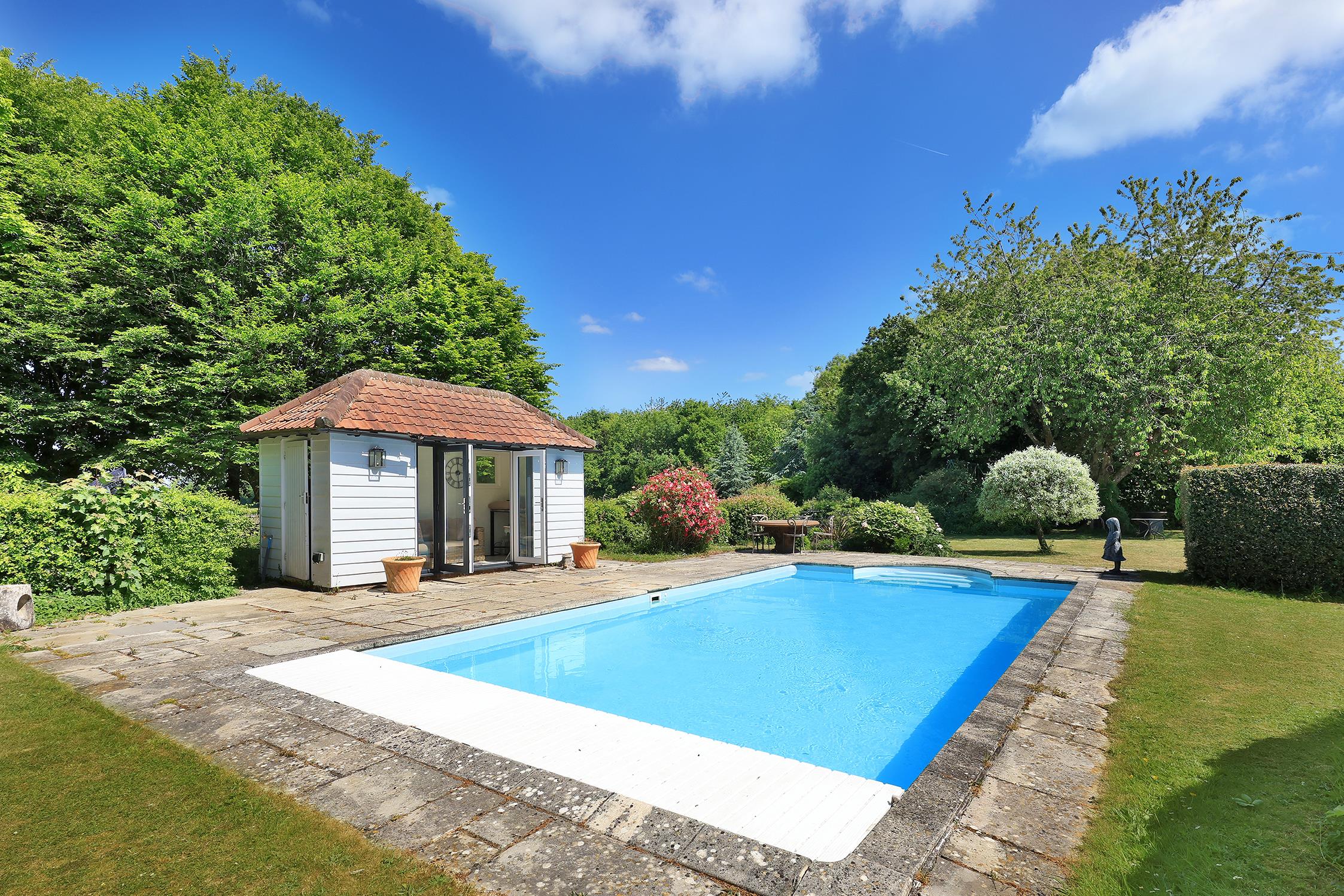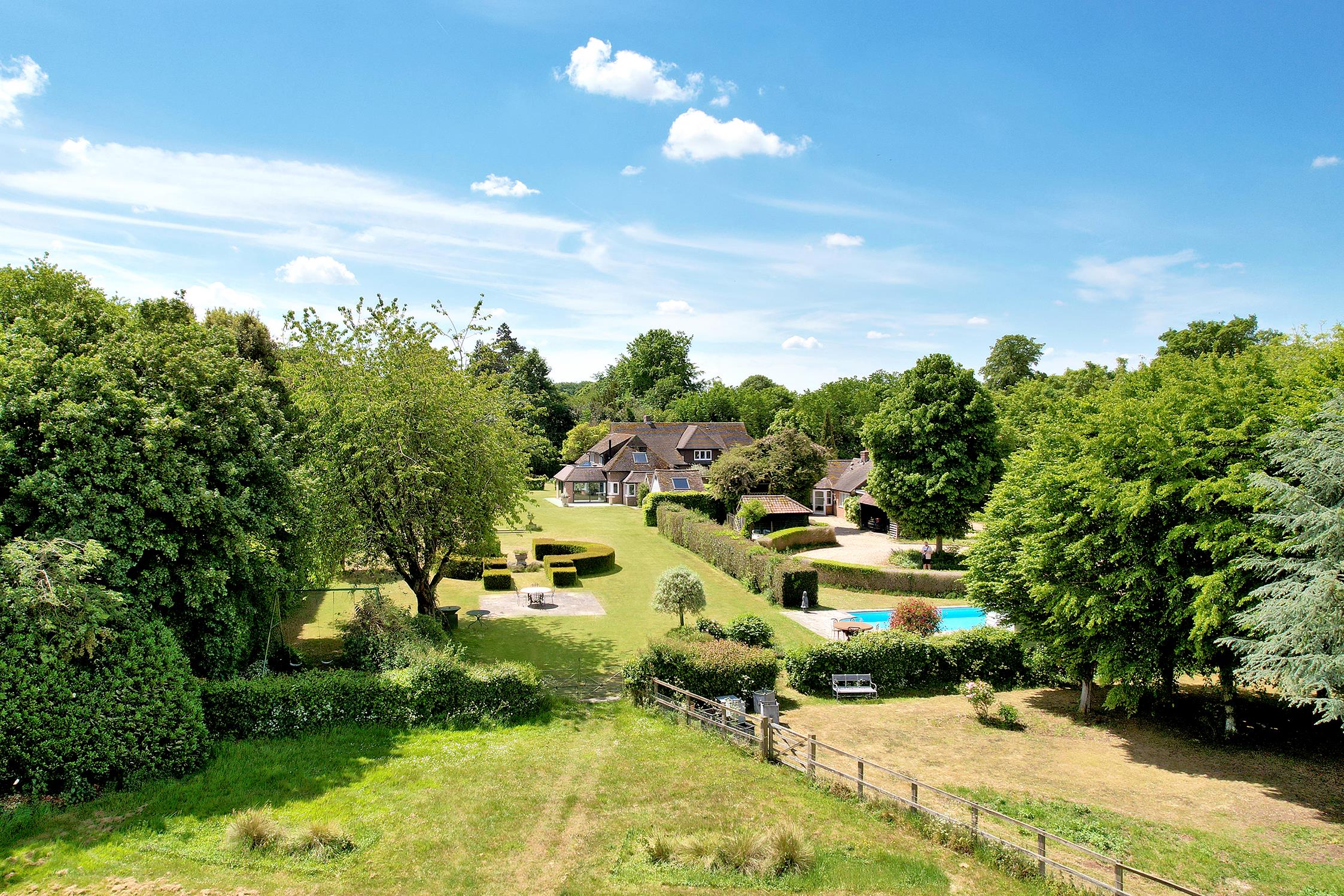 The house is approached via a gated driveway with a turning circle, ample parking, and a two-bay garage. The beautifully landscaped gardens include a heated swimming pool, pool house, ornamental pond, woodland garden, vegetable plot, tool sheds, and a gardener's WC. The paddock, extending to approximately 8 acres and formerly licensed as a private airstrip, includes a substantial barn or hangar and is encircled by mature woodland belonging to the property, ensuring exceptional privacy.