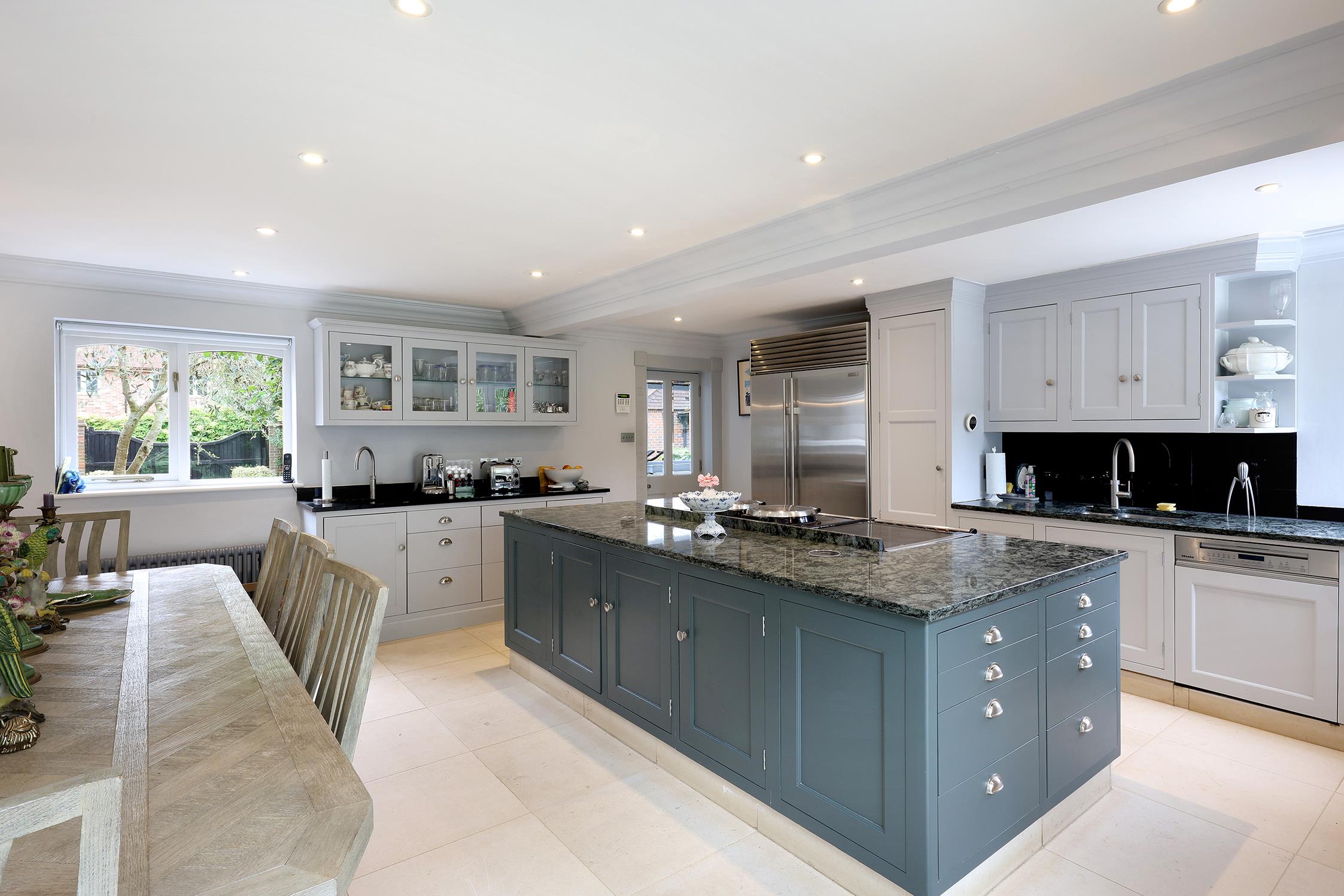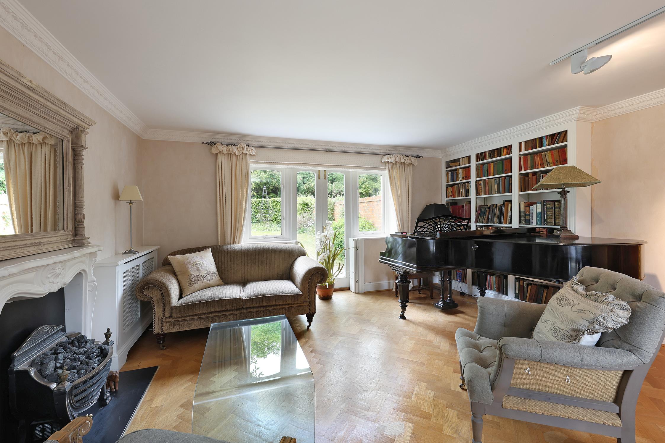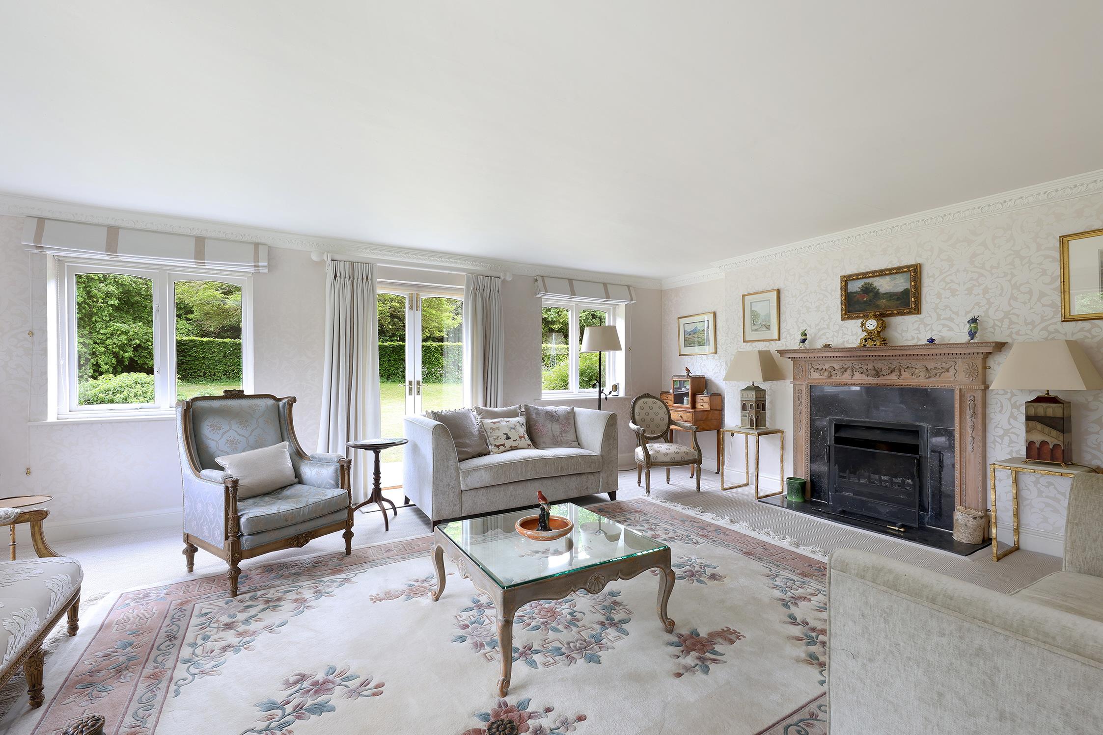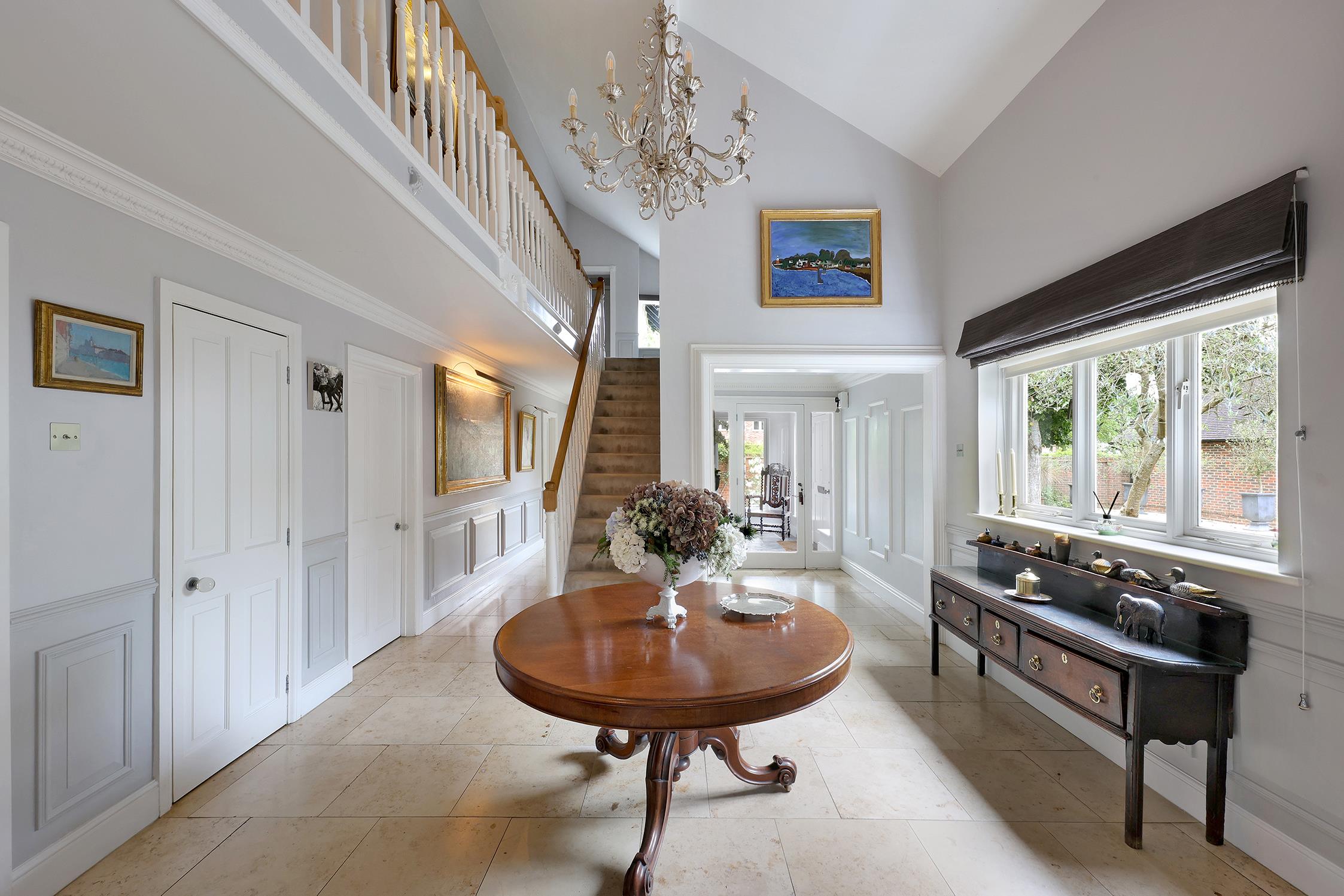 The impressive entrance hall, with its gallery staircase and double-height ceiling, sets the tone for the home. The double-aspect drawing room overlooks the gardens through French doors and centres around a handsome fireplace. A garden/music room, also with French doors, provides ideal entertaining space, while a separate study offers a peaceful retreat. The dining room flows into a spacious kitchen and garden room extension, added in 2019, featuring a large island, electric AGA, and space for everyday family life.