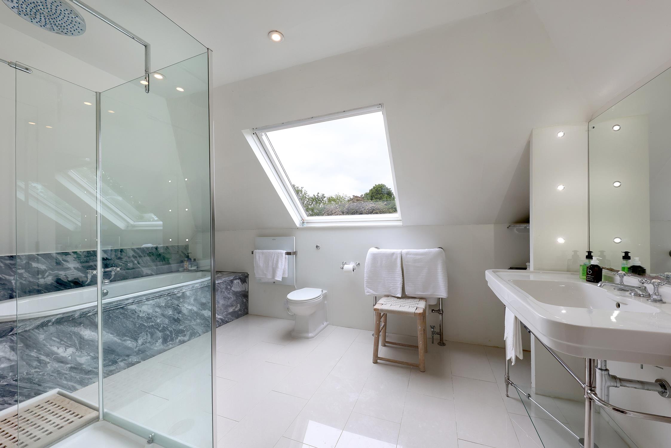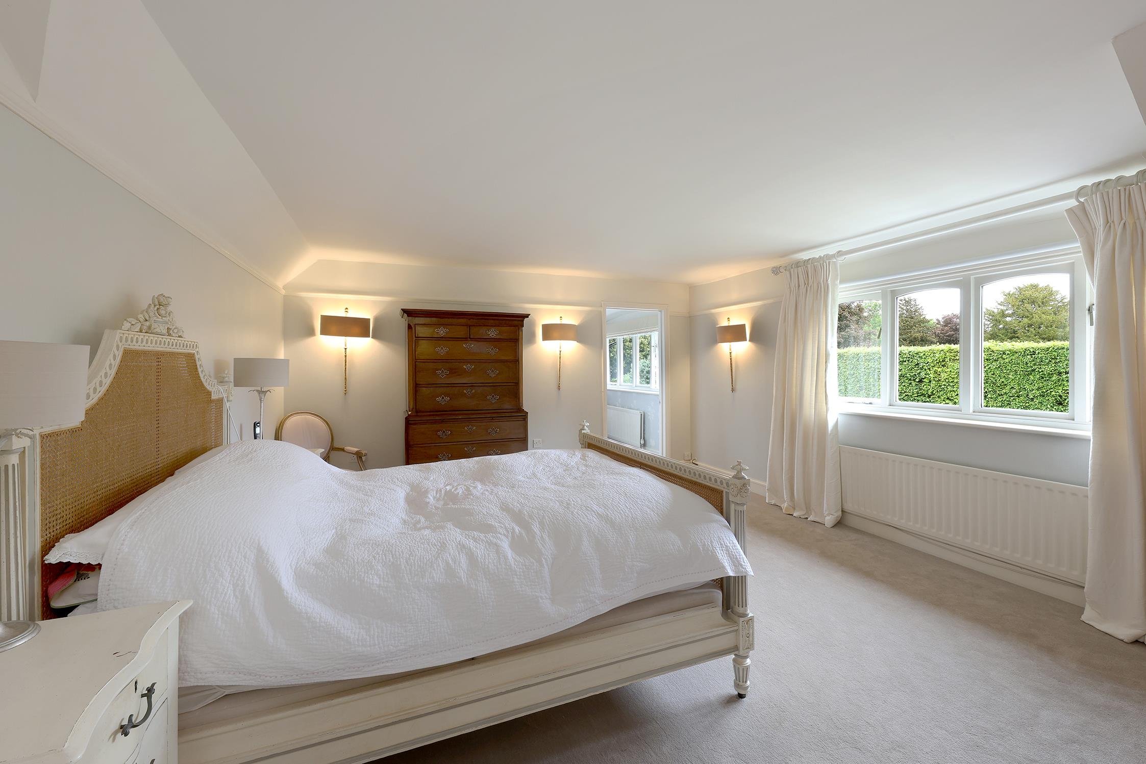 Upstairs, the galleried landing leads to the principal suite with dual-aspect views, a dressing room, and a luxurious ensuite. Four further bedrooms, including one ensuite, are served by a stylish family bathroom.