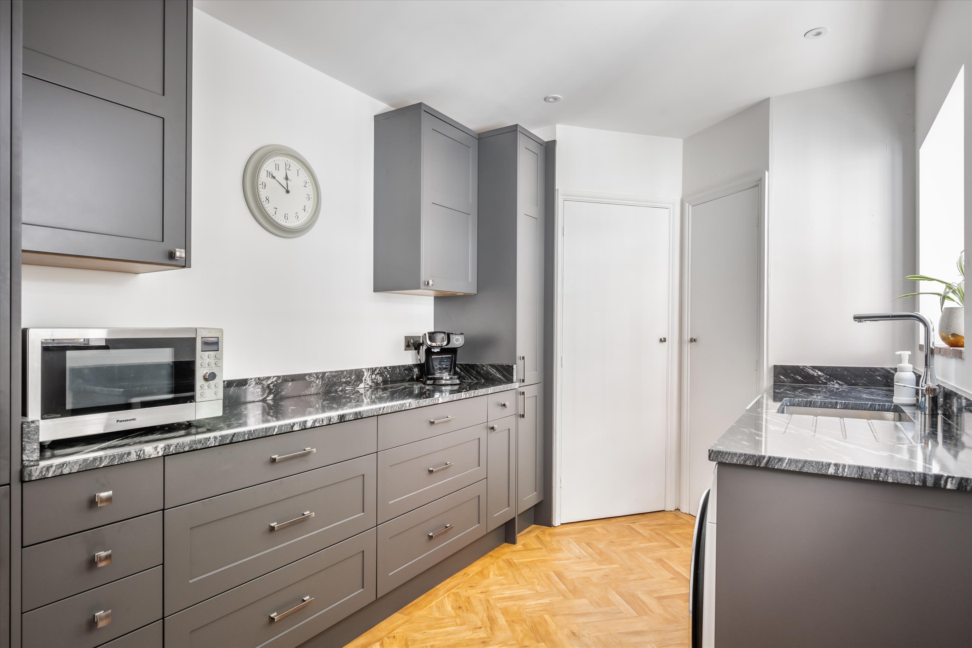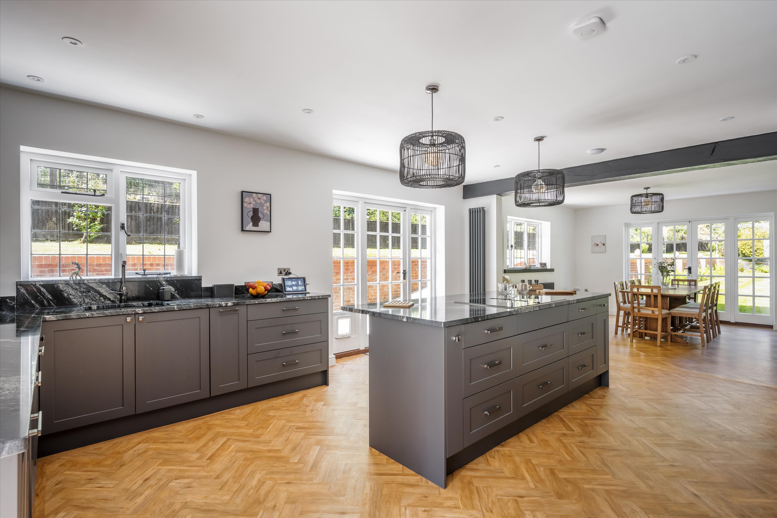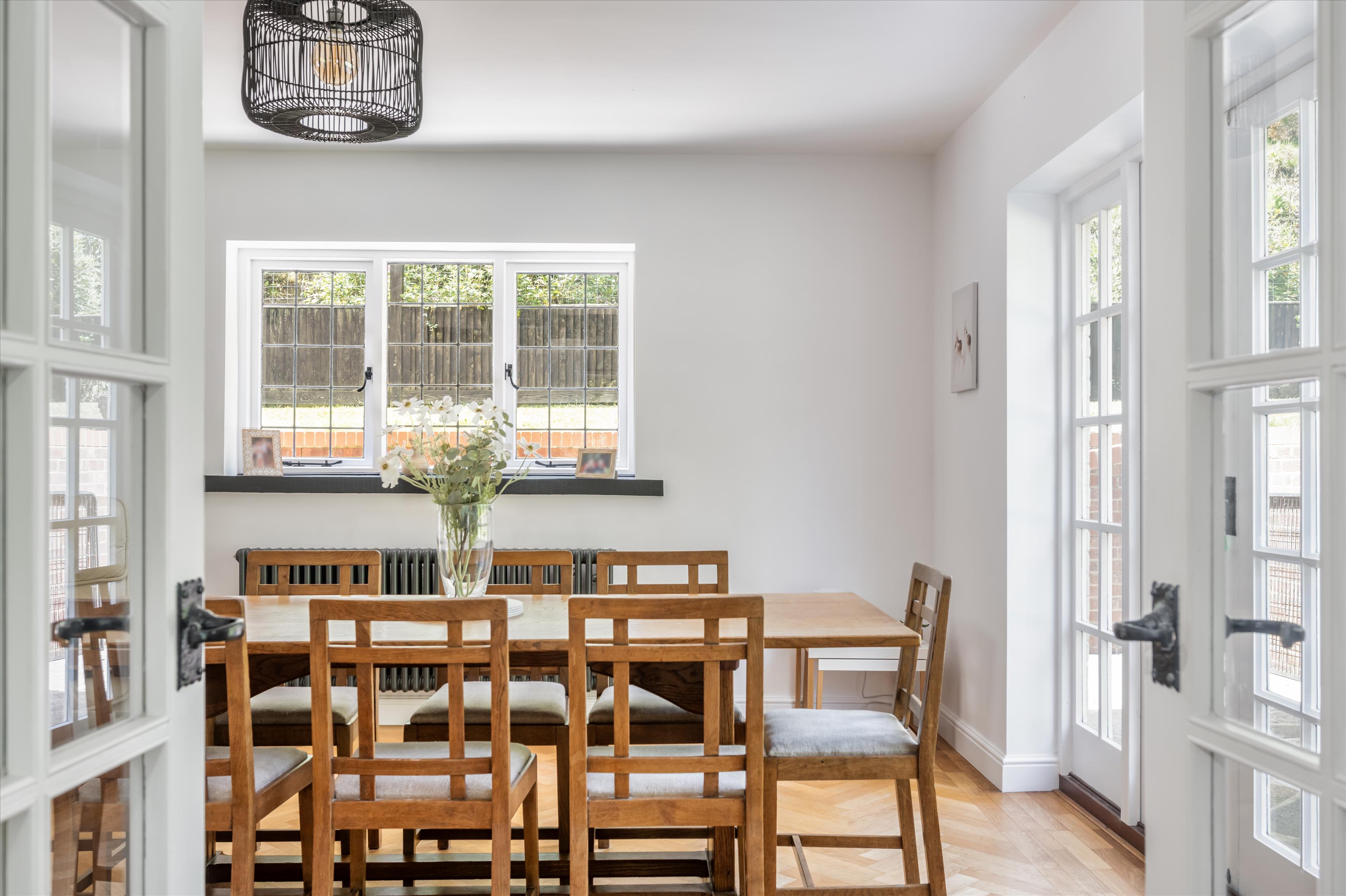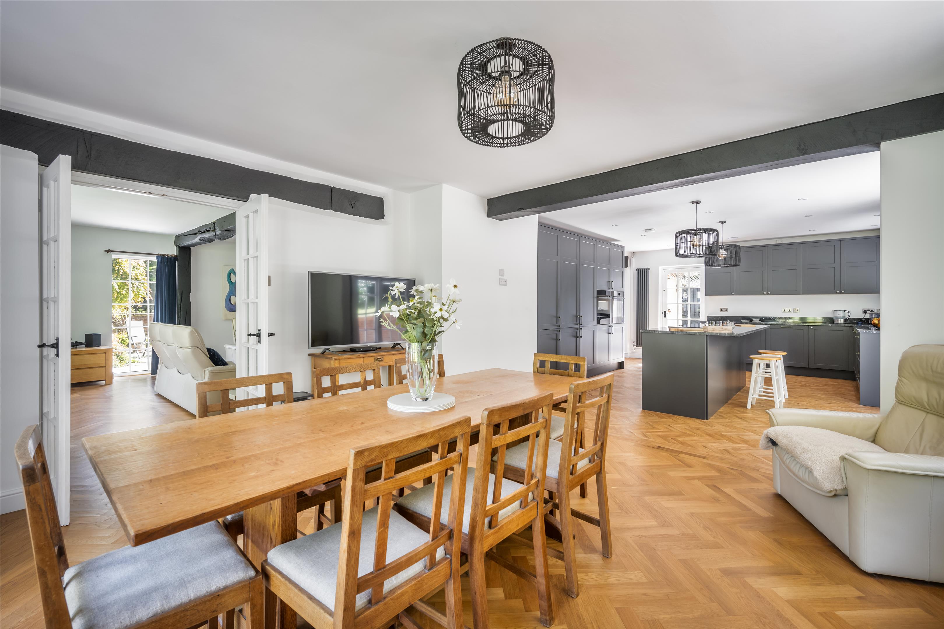 Accessible from here is the dining room (open plan to the kitchen), which is also a large space and provides direct access via French doors onto the front terrace and gardens beyond.