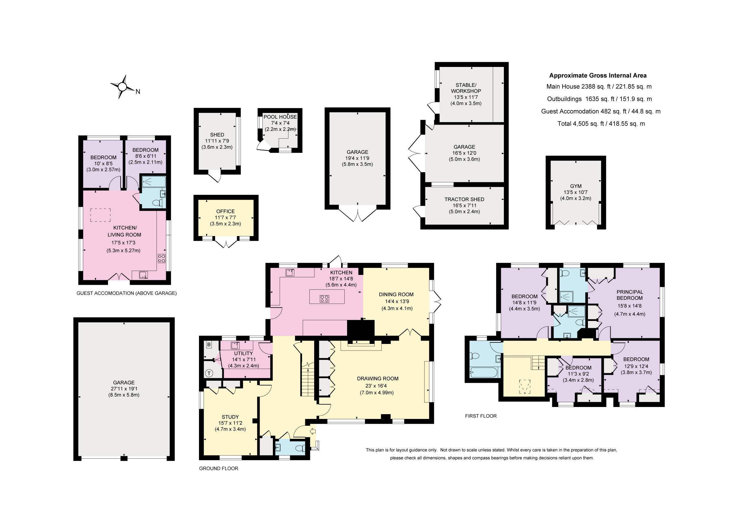 The grounds also provide the incoming purchaser with an array of outbuildings. In addition to those mentioned, there is a gym adjacent to the annexe, an office, a barn comprising further garaging, a log store, stable, and machine store. There is also a large garage further to this, another wood store and log store to its rear.