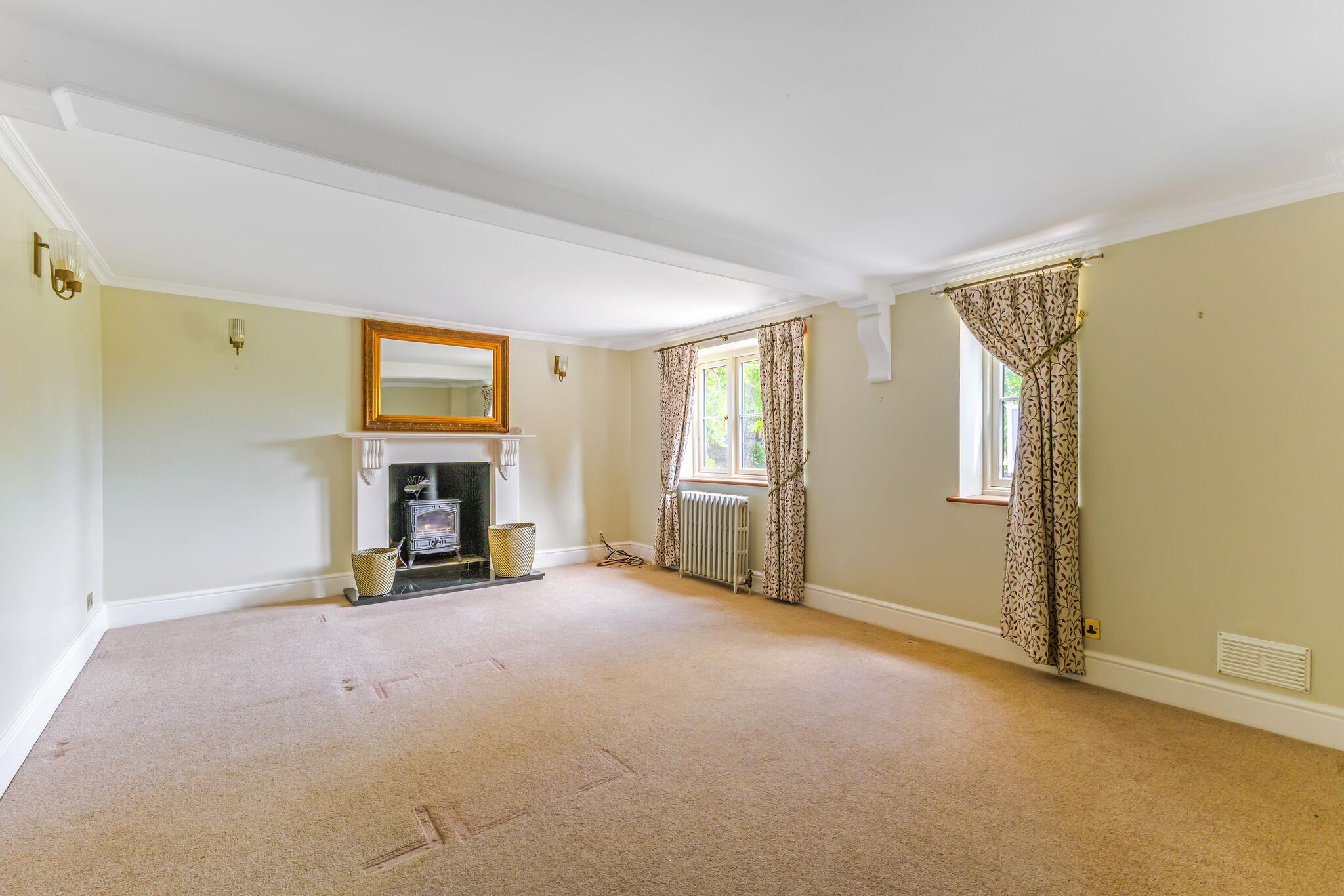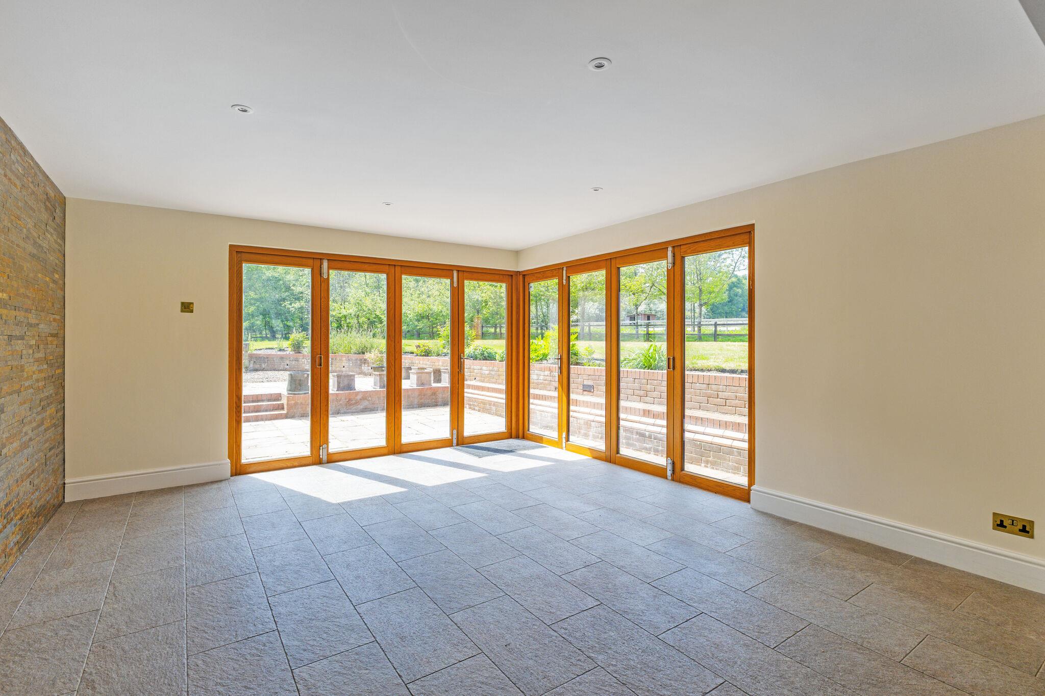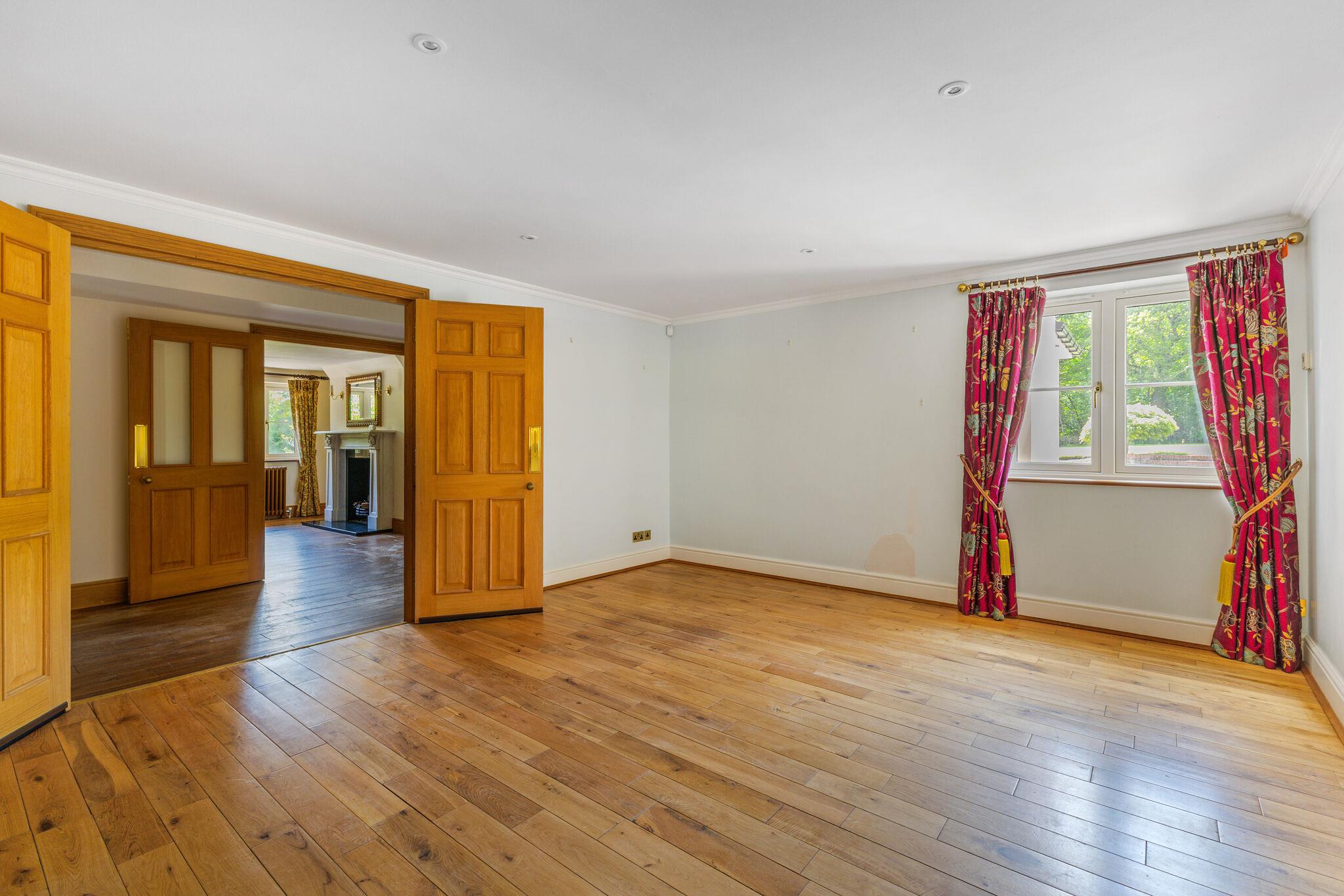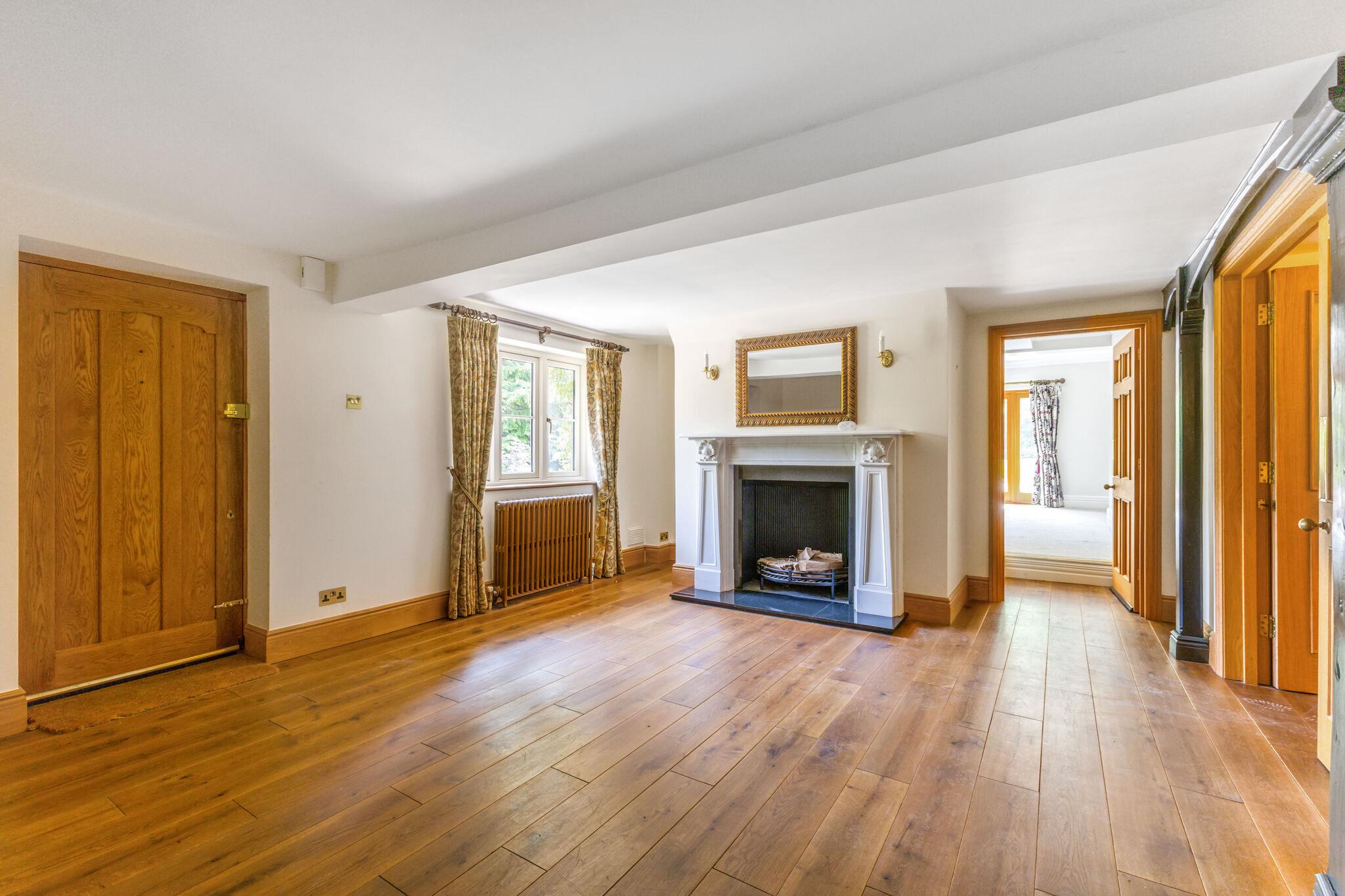 At the heart of the home is an open-plan family kitchen and dining area, fitted with Neptune cabinetry, a bespoke island with Everhot range cooker, walk-in pantry and adjoining utility/boot room. Full-height oak and glass doors open to the garden, creating a seamless flow between indoor and outdoor living. There is also a lower ground level room/basement.