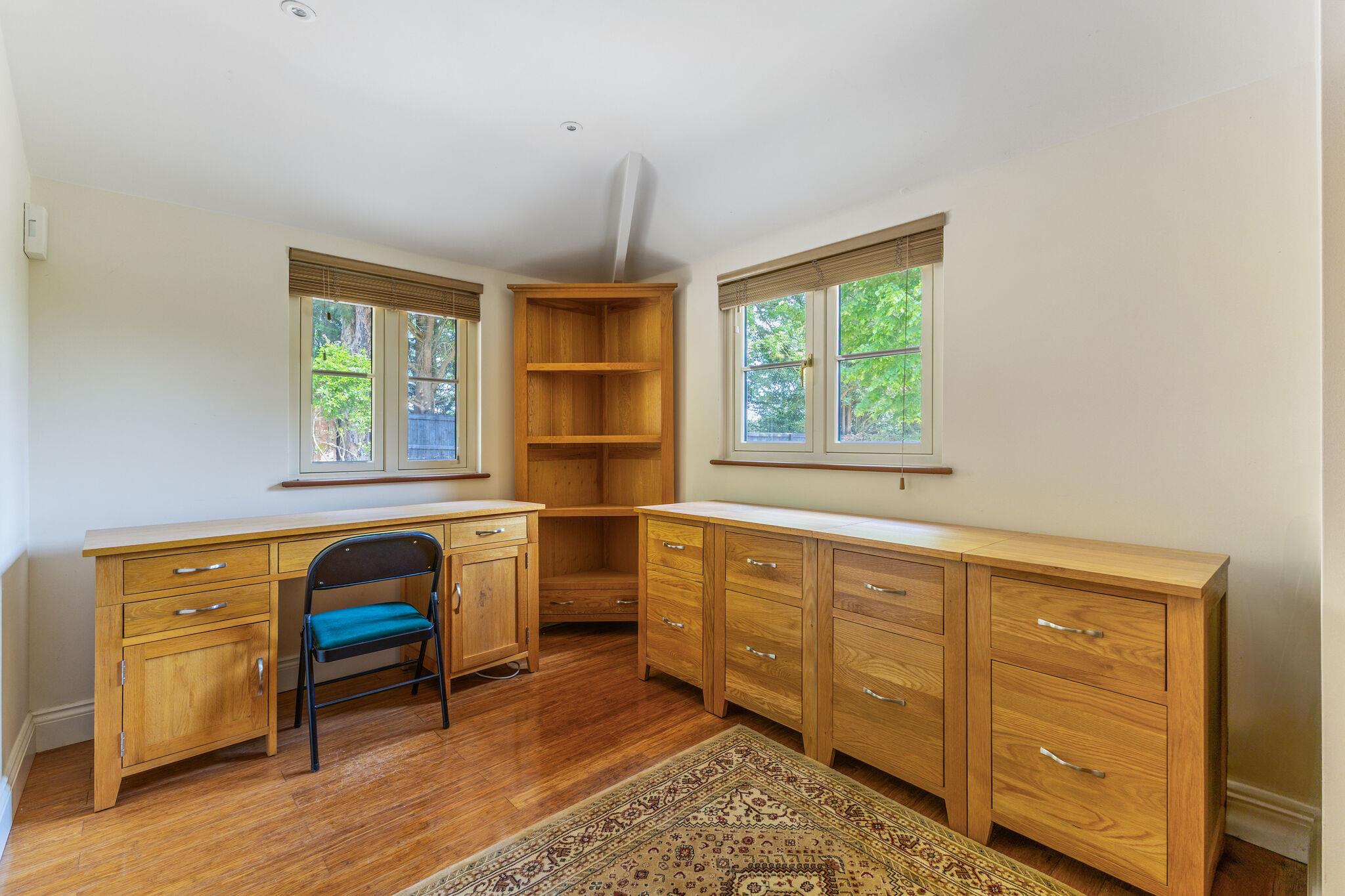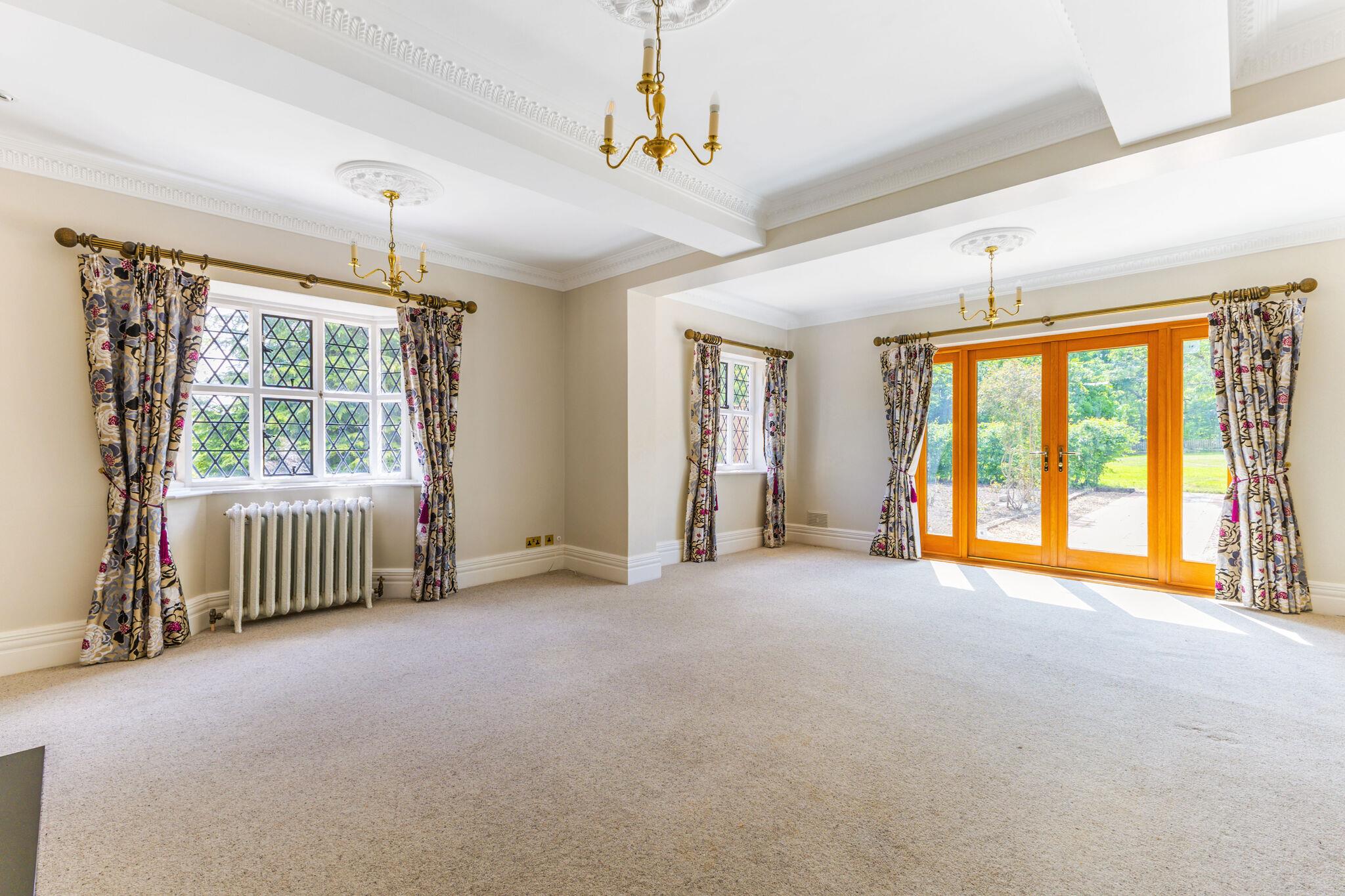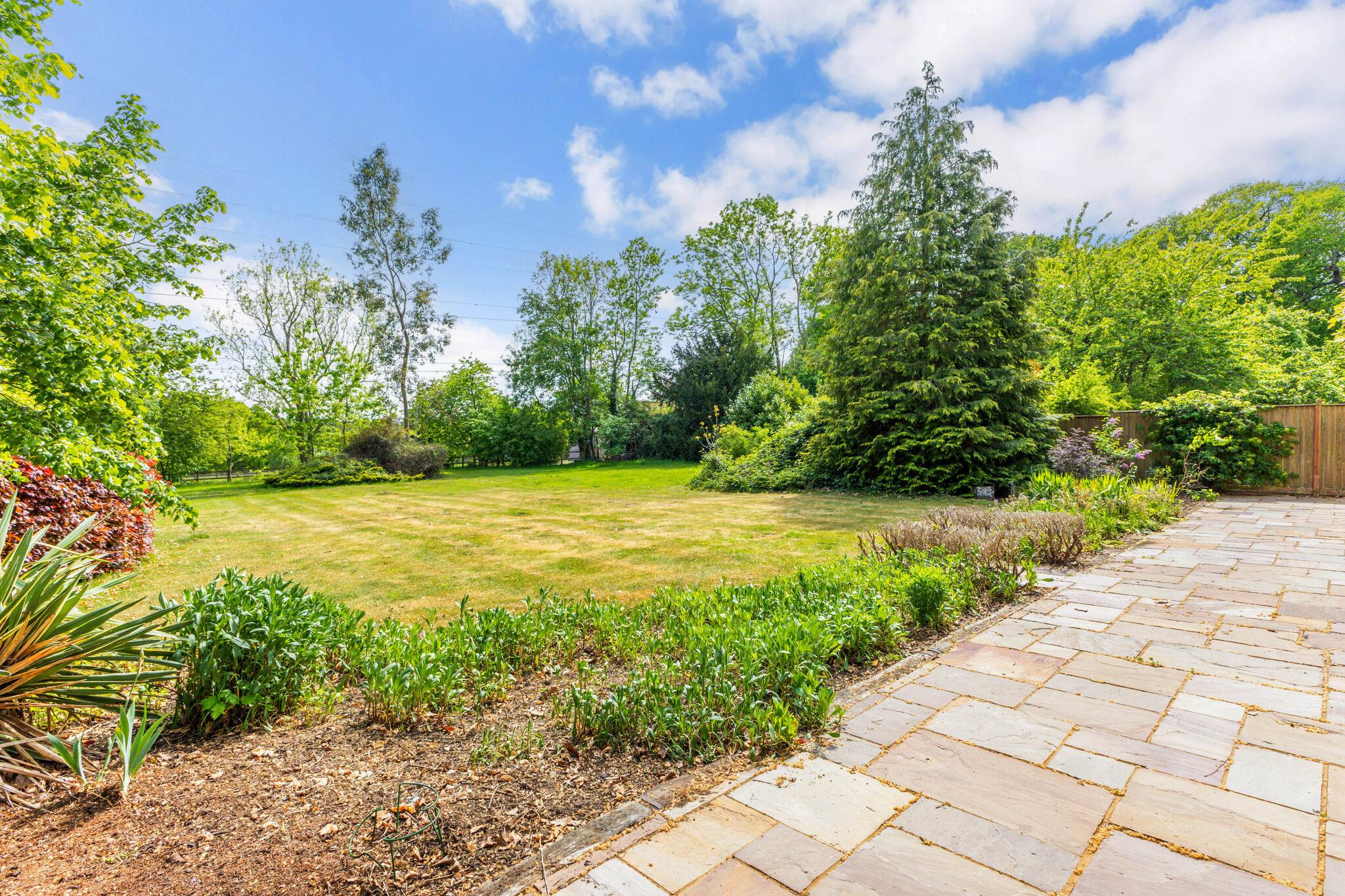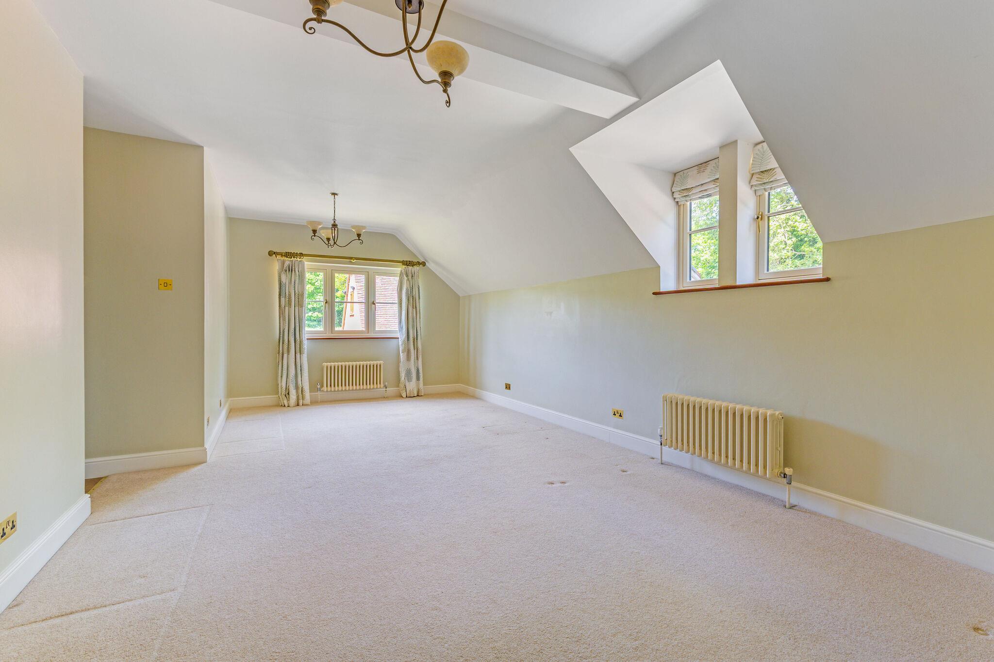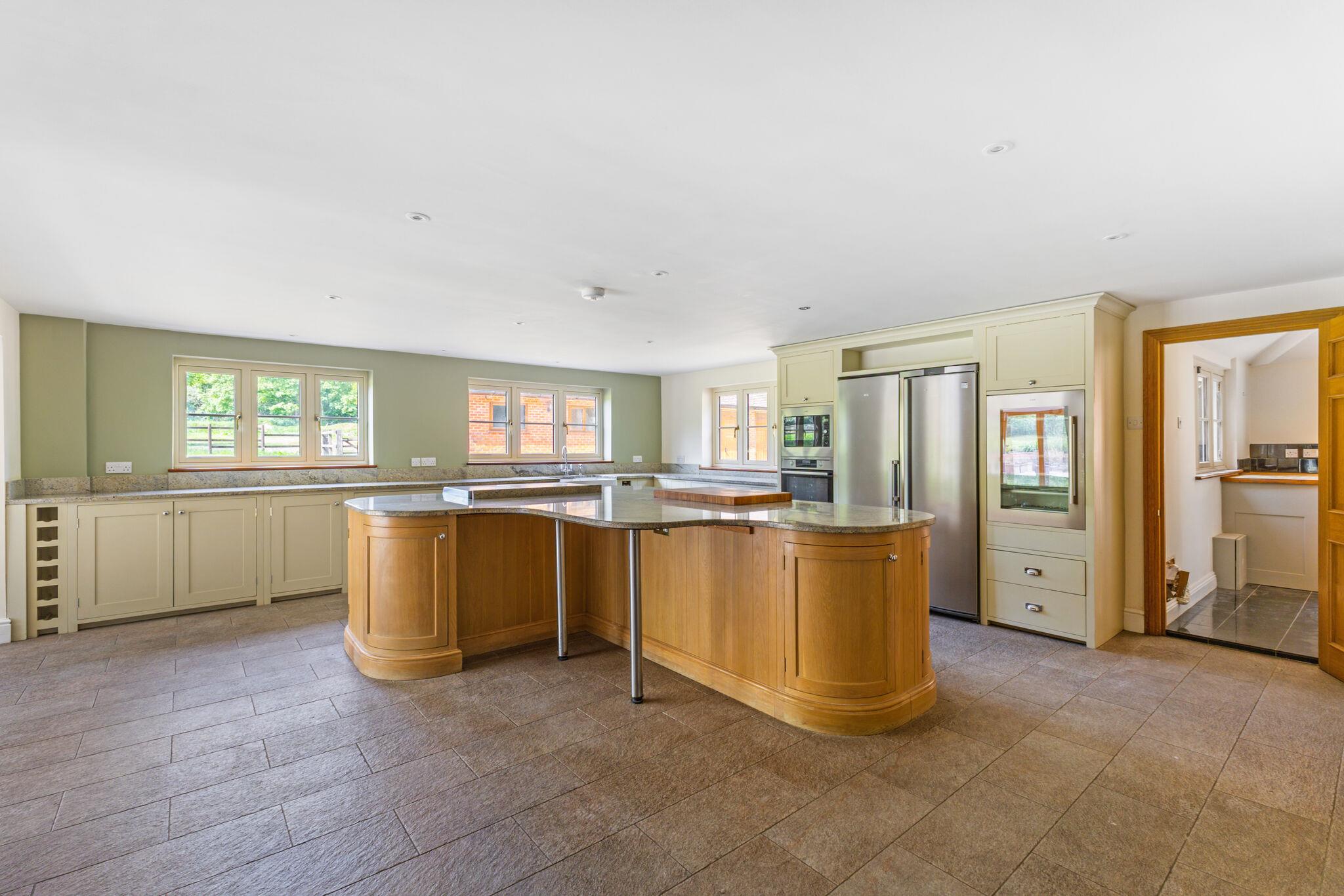 At the heart of the home is an open-plan family kitchen and dining area, fitted with Neptune cabinetry, a bespoke island with Everhot range cooker, walk-in pantry and adjoining utility/boot room. Full-height oak and glass doors open to the garden, creating a seamless flow between indoor and outdoor living. There is also a lower ground level room/basement.