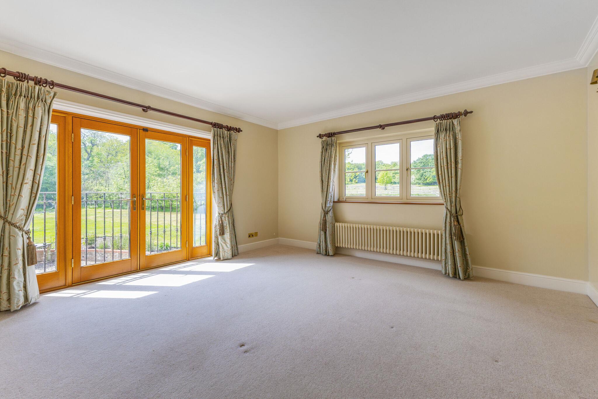 The first and second floors offer seven generous ensuite bedrooms. The principal suite includes a Juliet balcony with garden views, a walk-in dressing room, and spacious bathroom.