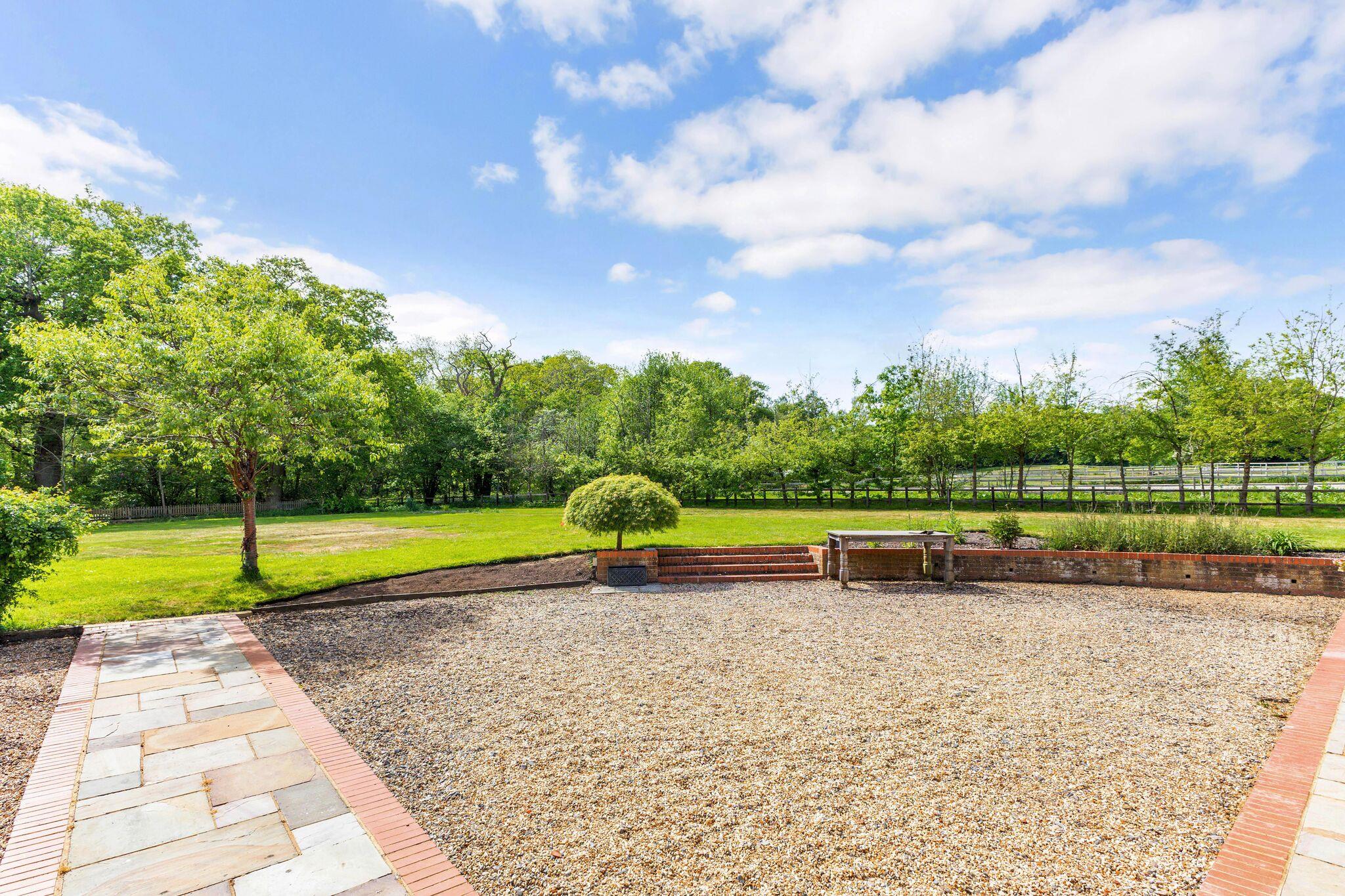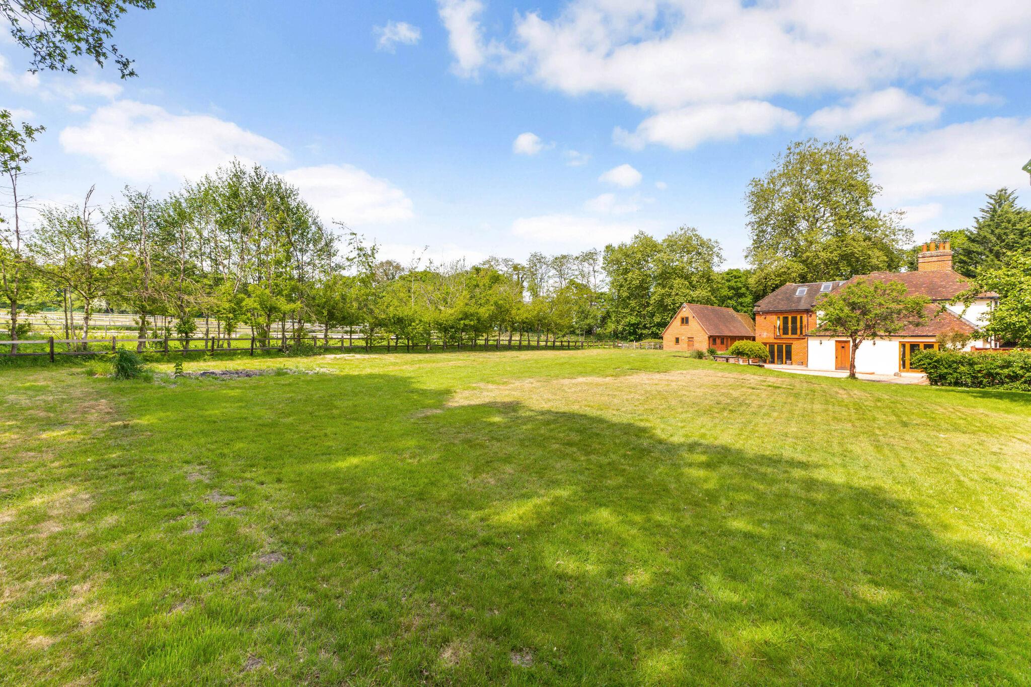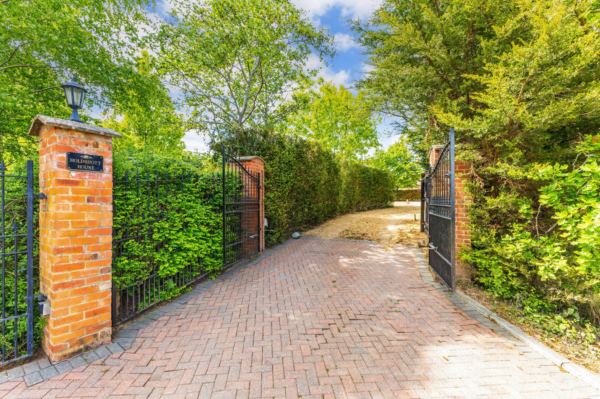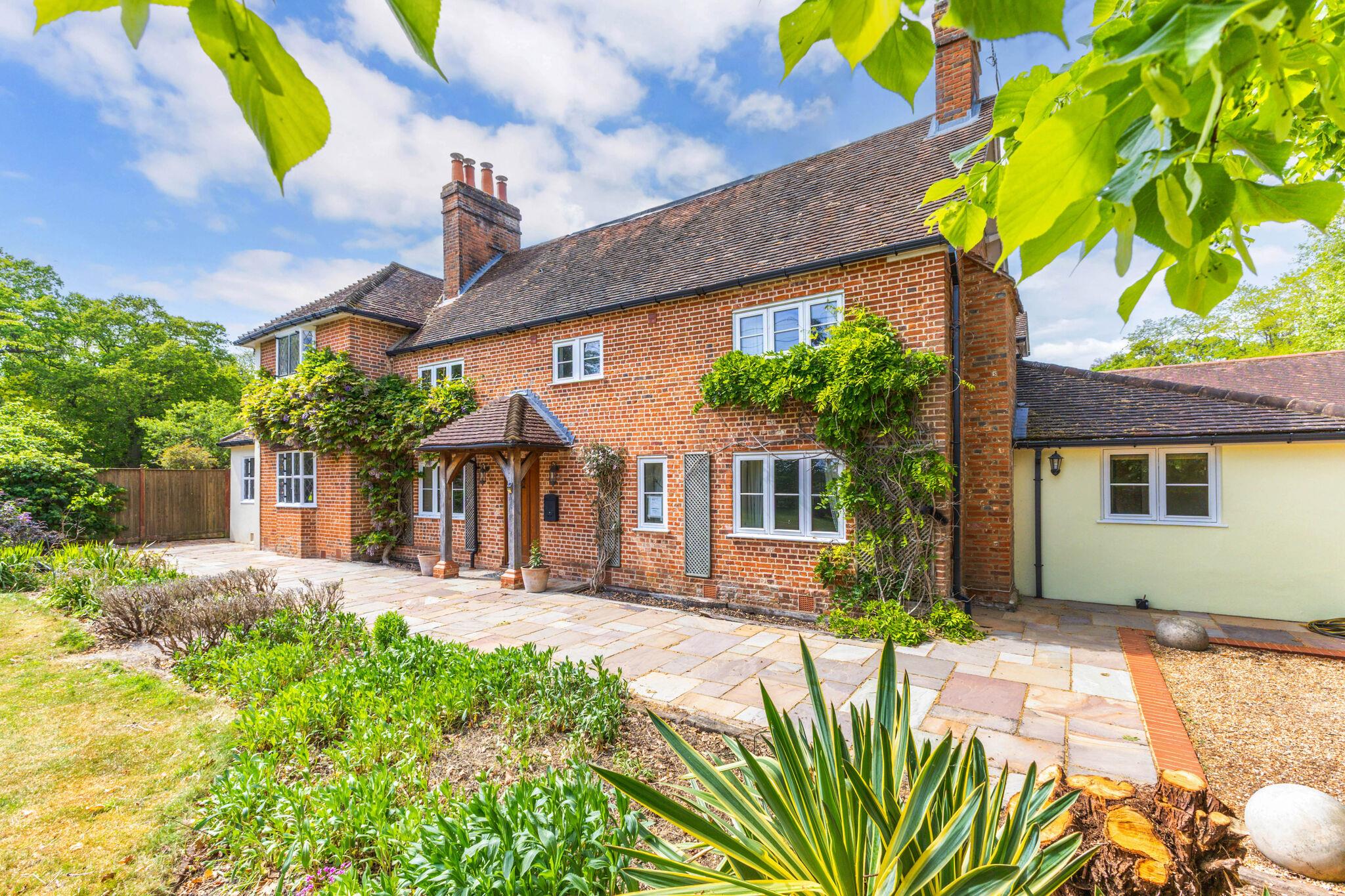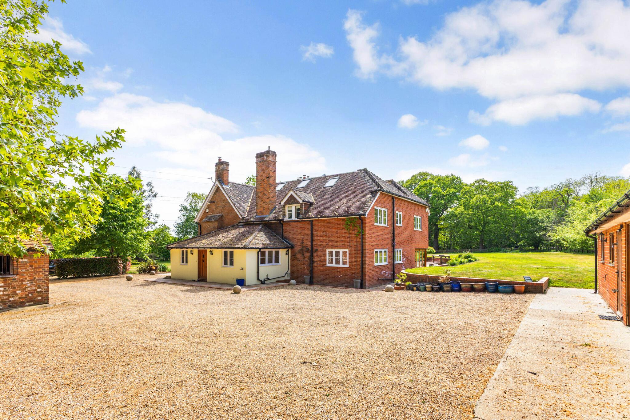 Holdshott House is a striking red brick country home, approached via a gated gravel driveway and offering excellent privacy. Adorned with mature wisteria, the property blends period charm with extensive modern living and equestrian facilities.