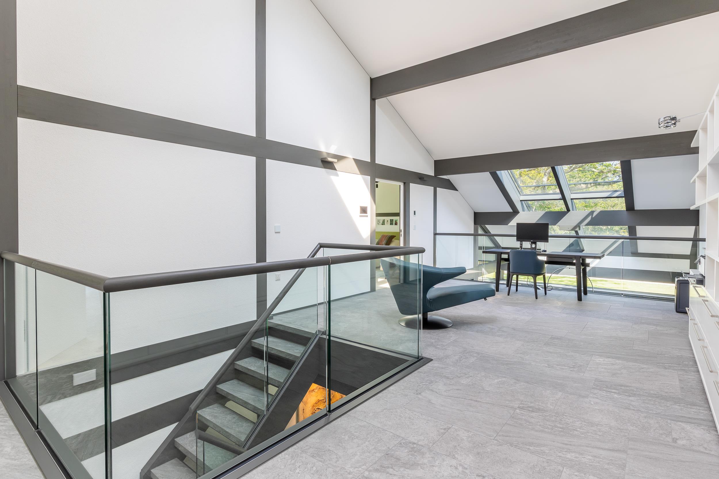 An impressive automatic locking door with alternative keycode option, opens to a striking reception hall. Leading through to the remarkable open-plan kitchen dining and living space. This triple aspect room provides a stunning outlook over the landscaped gardens and a vaulted space over the dining area with roof lights allowing dappled light filtering through the trees to flood the space.