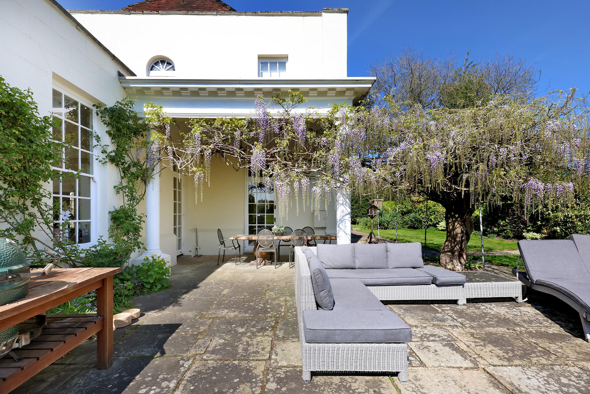 The garden and grounds surround the house and include a swimming pool and tennis court, both in need of an update. There is a large garage block attached to a self-contained one bedroom annexe and integral carport. There is also a substantial former three bay car garage, which the current owners have converted into a gym with further parking by the rear entrance. The original stable block, including the store room, could have development potential, subject to the necessary planning consent. There is also wooden stabling close to the pastureland.