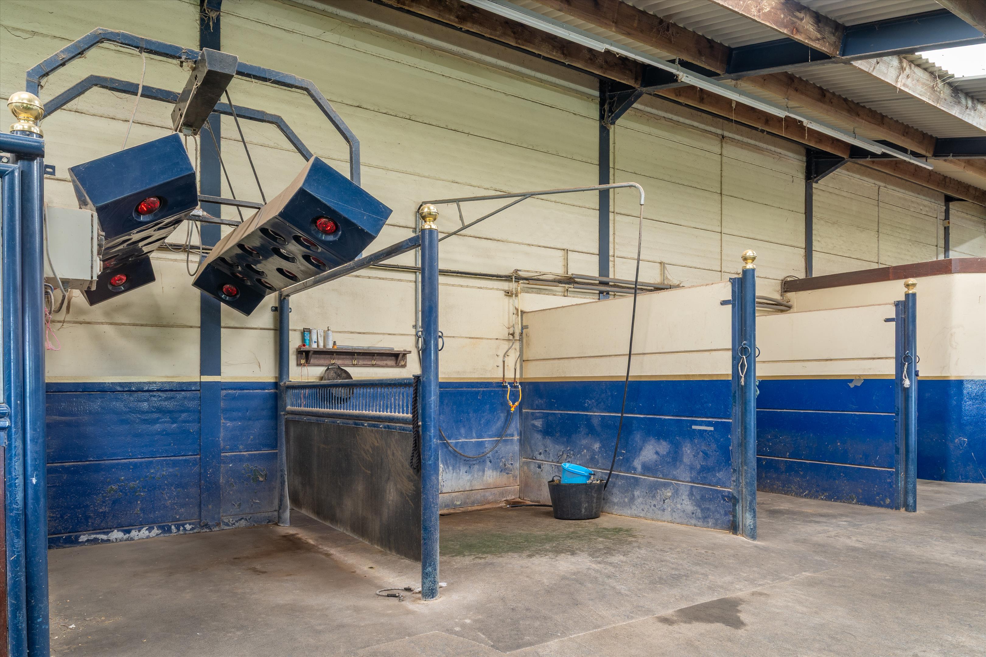 The central building is the heart of the equestrian operation in which the 47 stables are positioned to the southwest and north of the indoor school (48m x 25m) with a Martin Collins surface. To allow for flexible use there are 4 bays set up for wash downs with solariums, 4 grooming bays, 4 tack rooms, 3 feed stores, 2 laundry rooms, and a separate staff