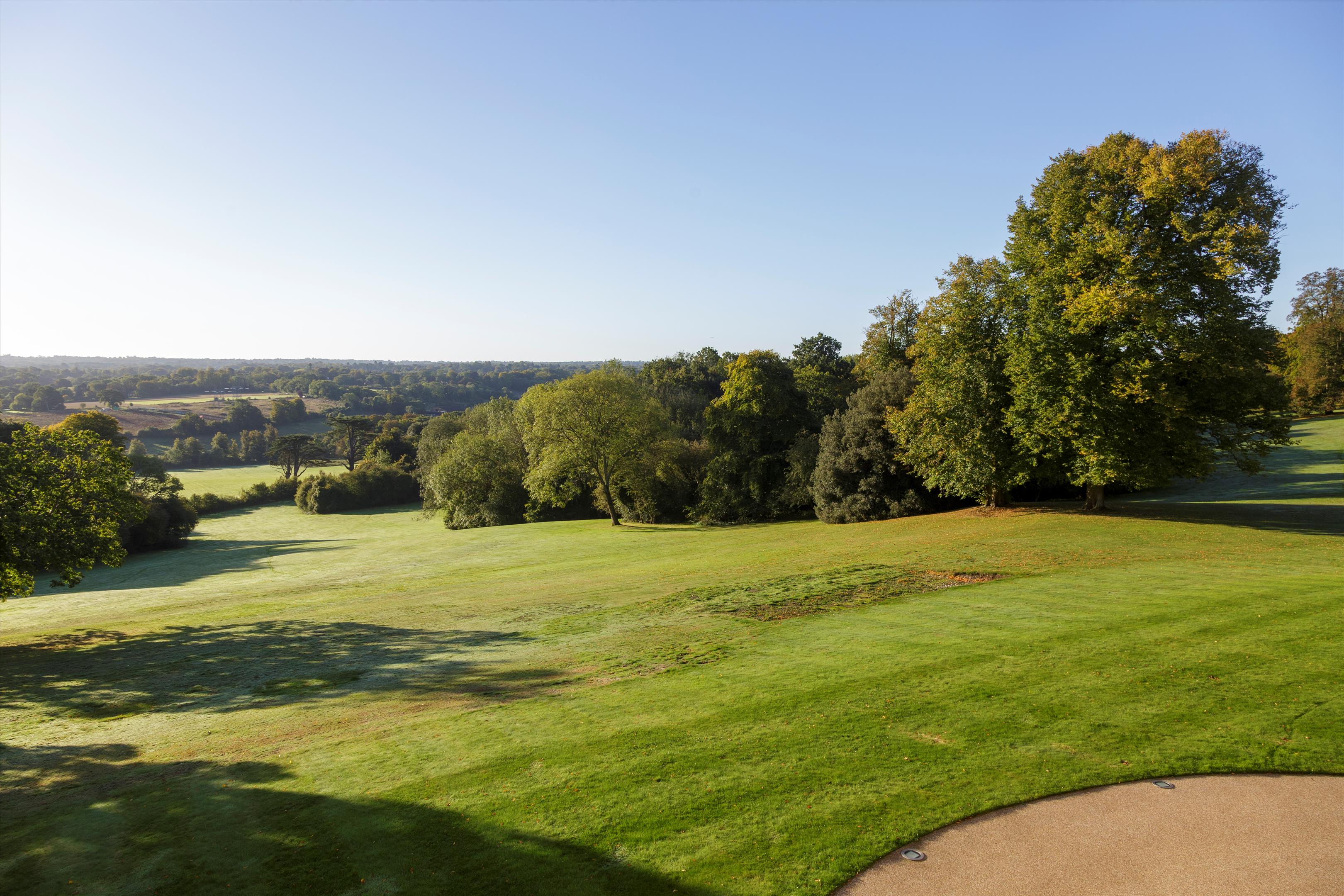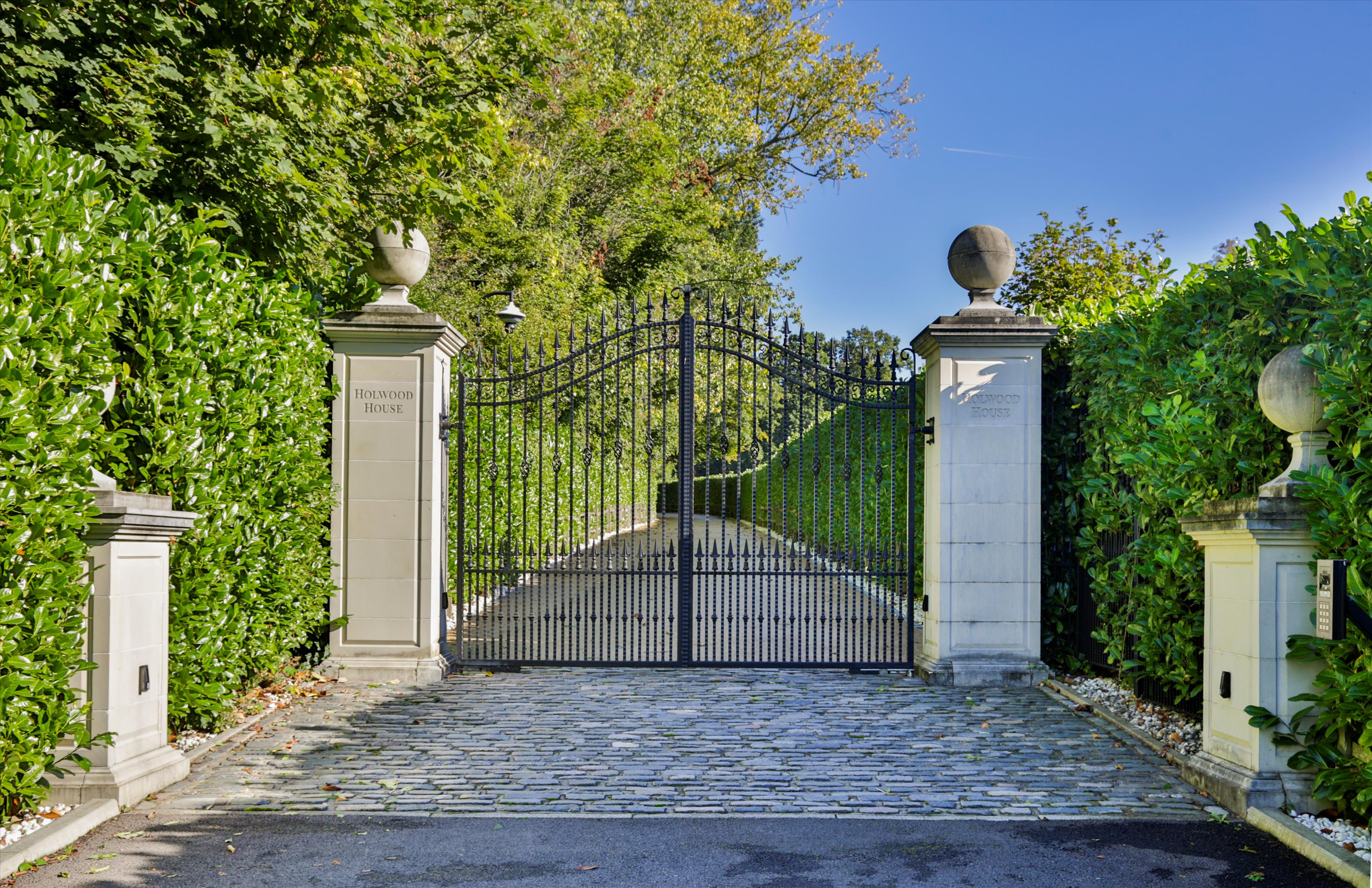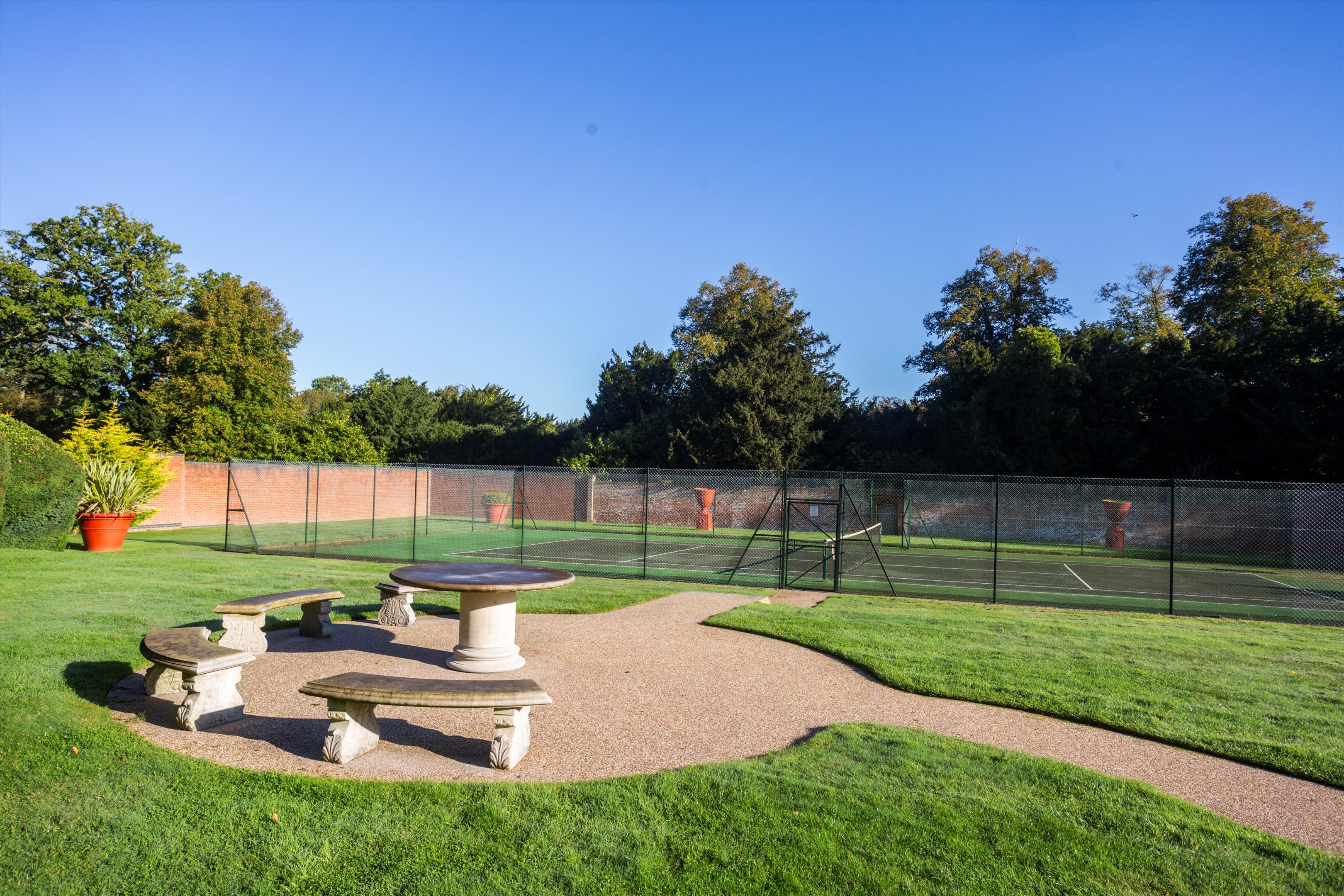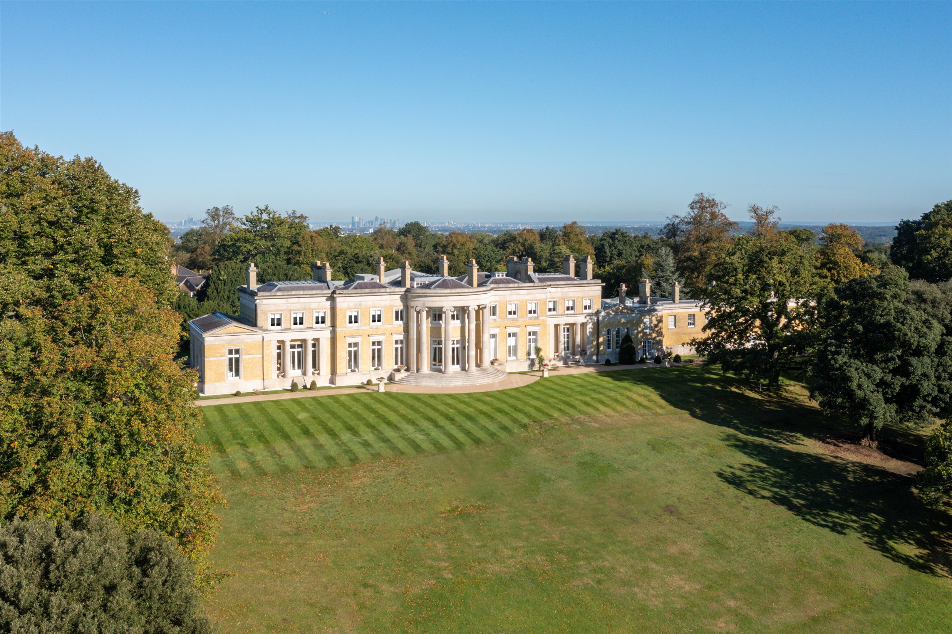 The house is approached by a long drive meandering through parkland, a particularly special feature of the property. Sculpted and laid out by Decimus Burton, Holwood's elevated position ensures fabulous views to the south. Two areas of woodland cradle the property to the left and right forming an avenue and delightful vista, down which the eye is drawn from the principal reception rooms and bedrooms. To the rear there is the secondary drive, tennis court and walled garden with the garden pavilion set to the west. A new machinery store/helicopter hangar has recently been built to the east of the house.