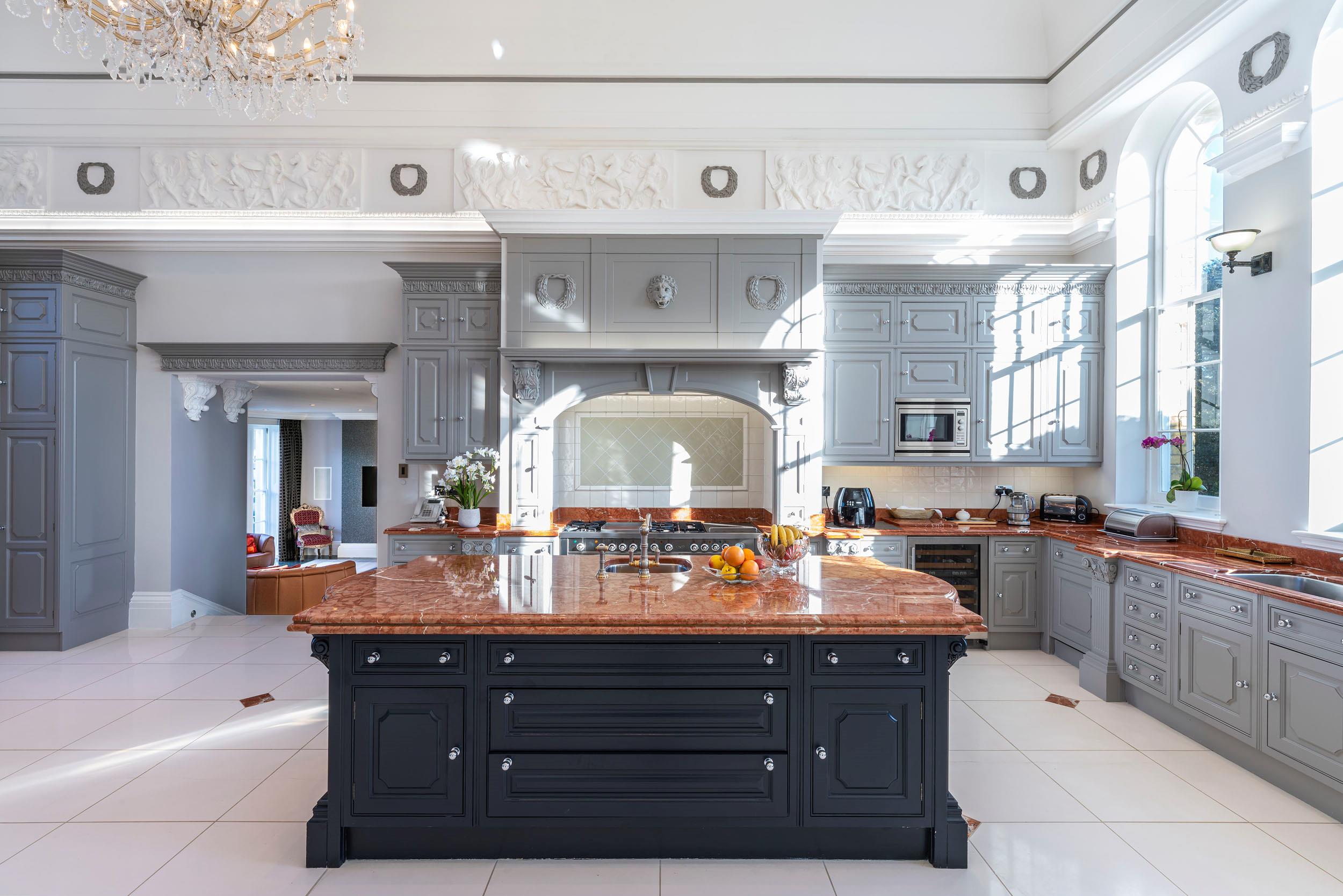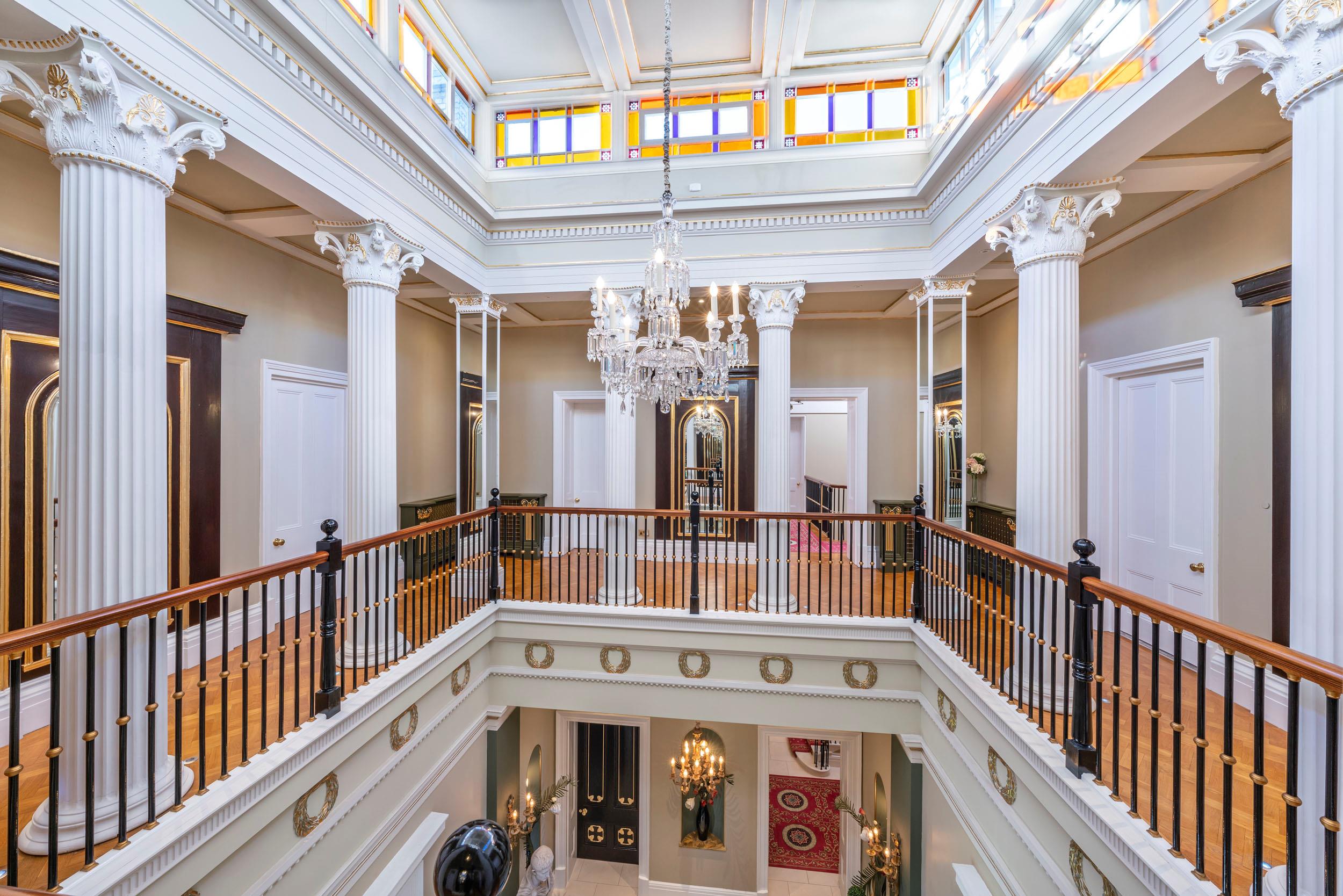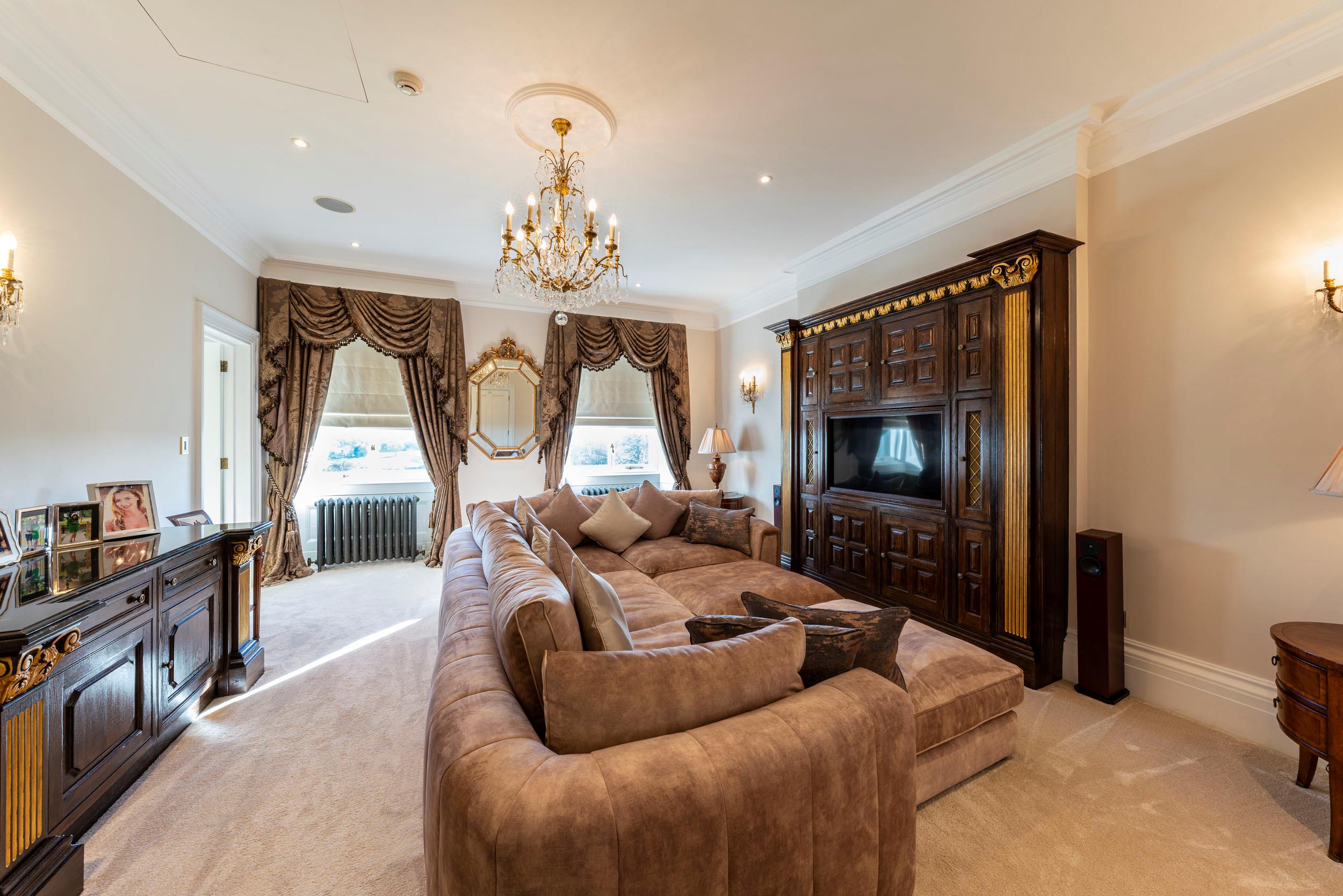 A stately entrance hall and inner hall occupy the heart of the property, from which all primary reception rooms flow. These two rooms are spectacular, with double height ceilings to the first floor gallery, intricate cornicing and fine limestone floors. They lead to the music hall with its parquet flooring and a breathtaking panoramic southerly view over the parkland. Sharing in these views are the games room, drawing room, dining room and kitchen/breakfast room, all with large sash windows, French doors and an abundance of natural light. The Clive Christian kitchen has a double height ceiling with two large window lights. The first floor library mezzanine sits over half of the adjacent breakfast area. From the kitchen, the large family room leads both outside and into the newly refurbished swimming pool complex and annexe. In addition on the ground floor there is a study, cloakroom, powder room and insulated cinema room with full surround sound.