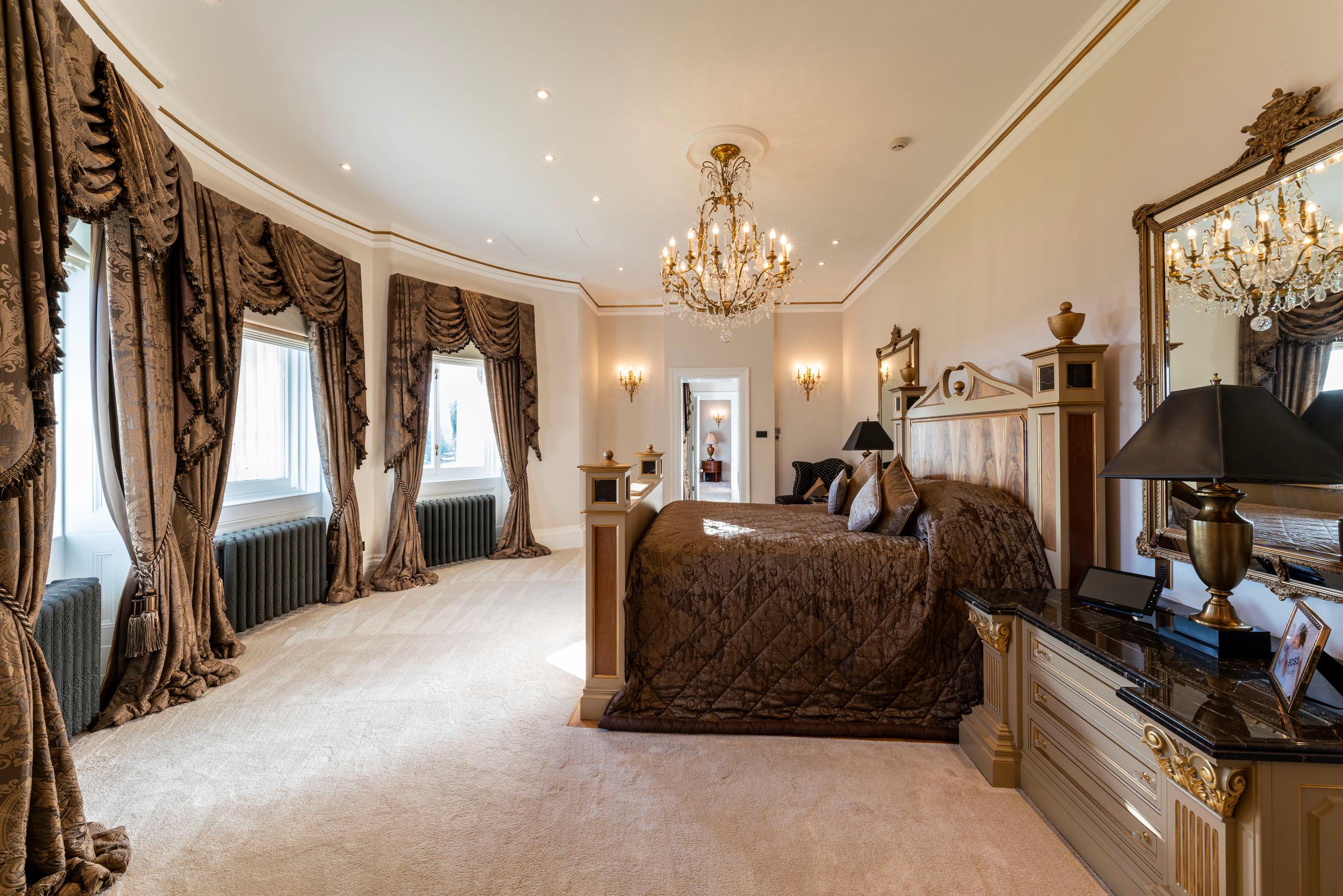Accessed by a grand sweeping staircase, the first floor family wing comprises spacious accommodation. The master suite has two dressing rooms, an en suite bathroom and private sitting room, all with spectacular views over parkland and the valley beyond. Two further bedrooms interlink in this wing and share a bathroom. The pillared central gallery overlooks the inner hall and provides access to a further bedroom suite, a nursery and the guest wing which comprises two further bedroom suites. A landing from the gallery leads to the library mezzanine over the breakfast room and down to the ground floor.
