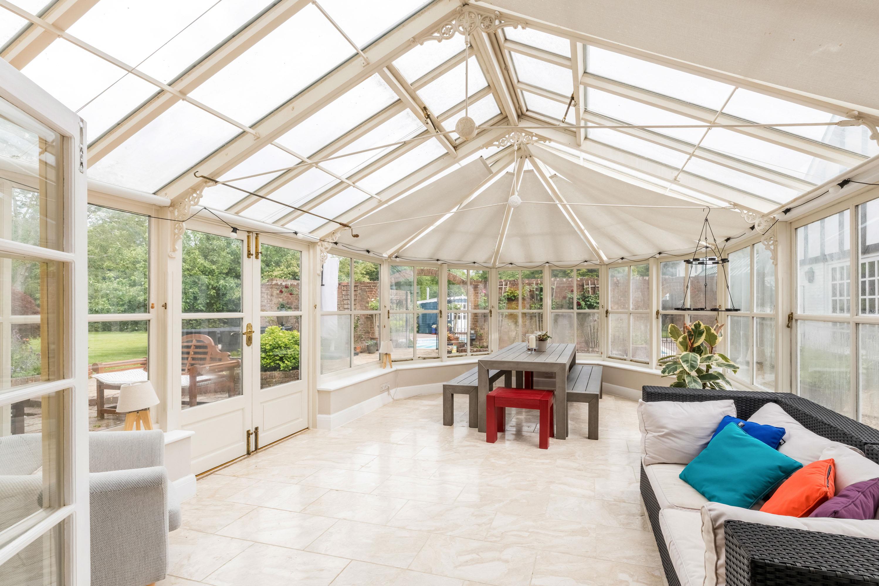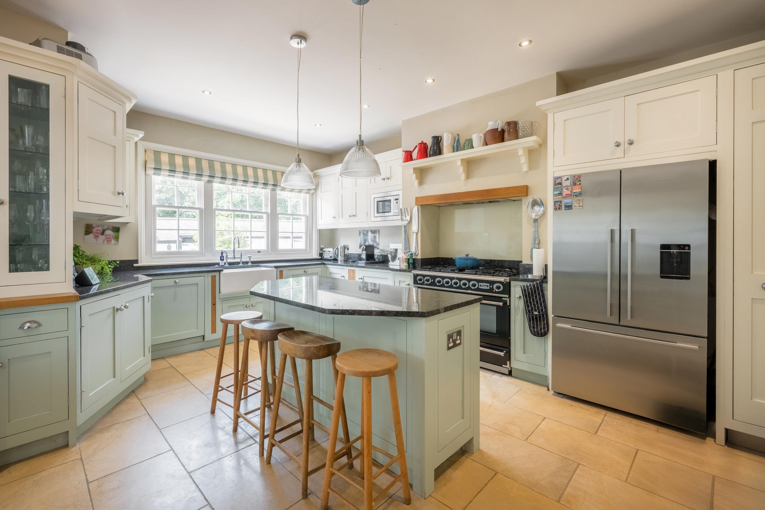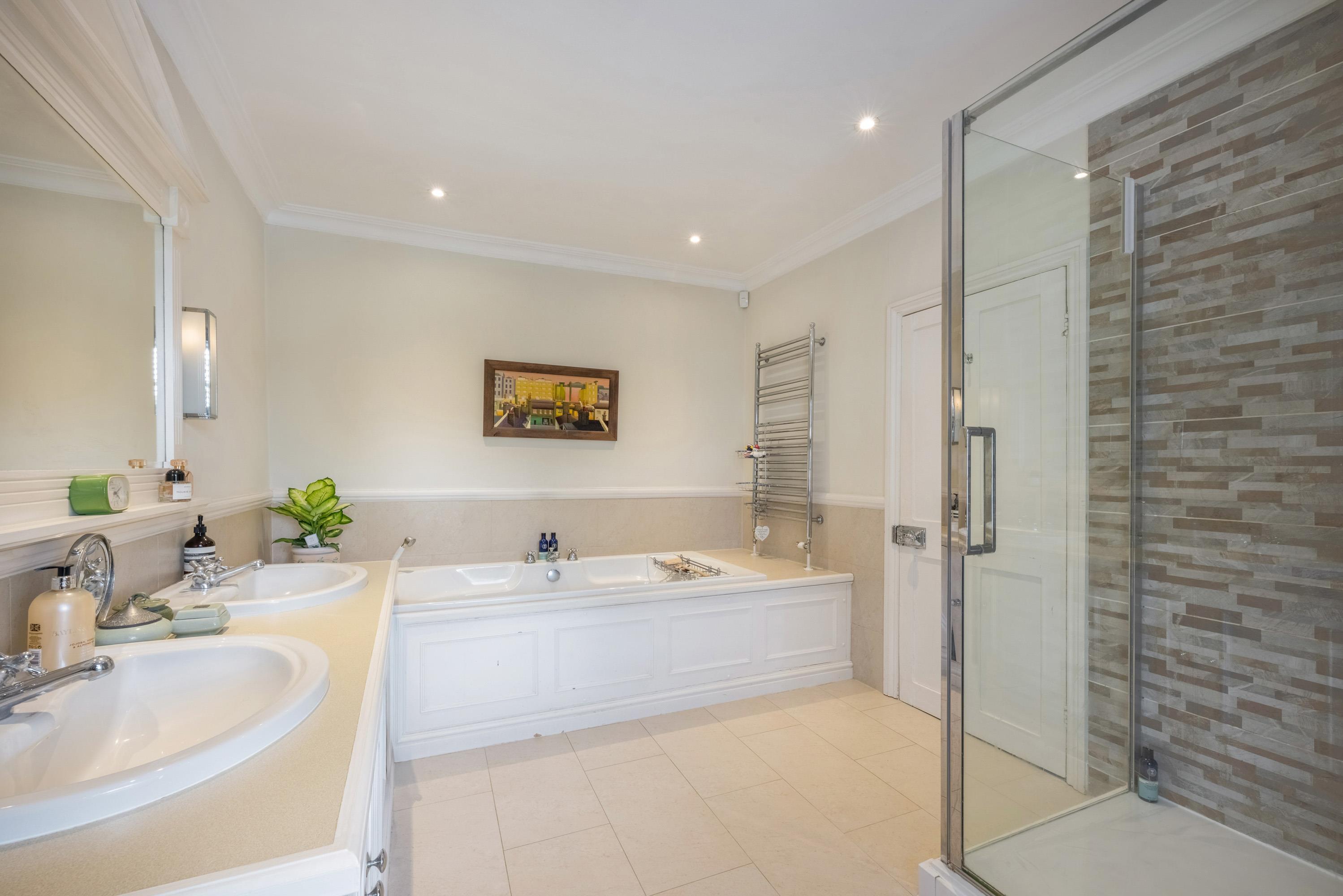 The ground floor is arranged to provide flexible, light-filled living space, with a welcoming entrance hall leading through to a bespoke kitchen and breakfast area, adjoining a relaxed family room. A formal dining room and elegant drawing room offer ideal entertaining spaces, while a conservatory provides a tranquil spot to enjoy views over the gardens. A separate study, utility room, and downstairs cloakroom/WC complete the ground floor.