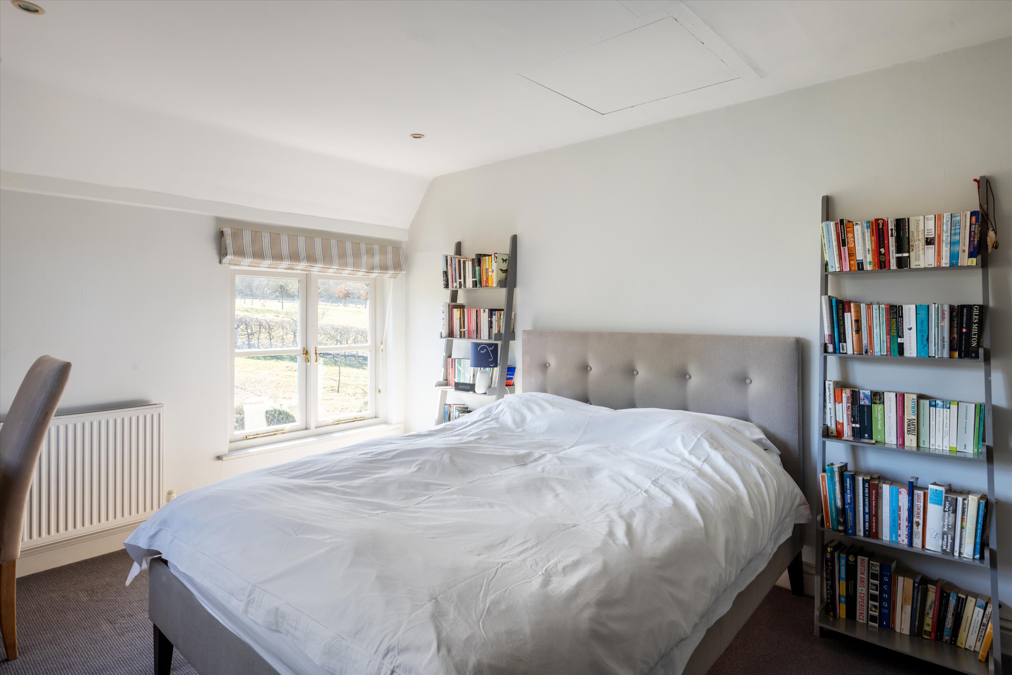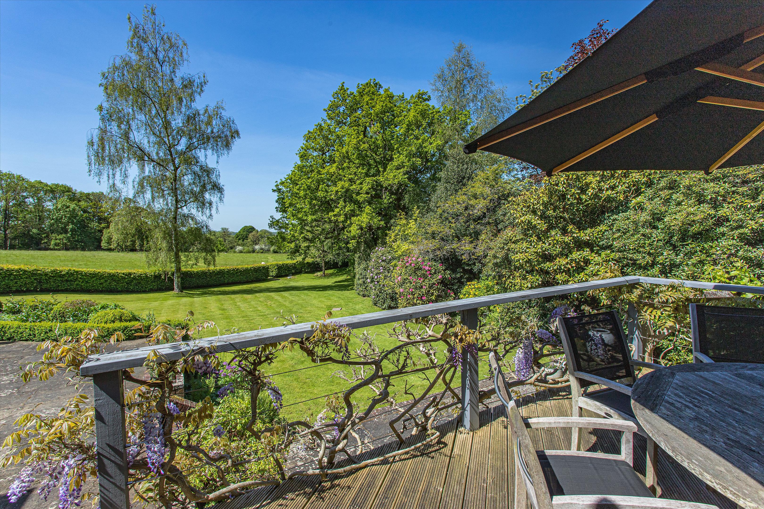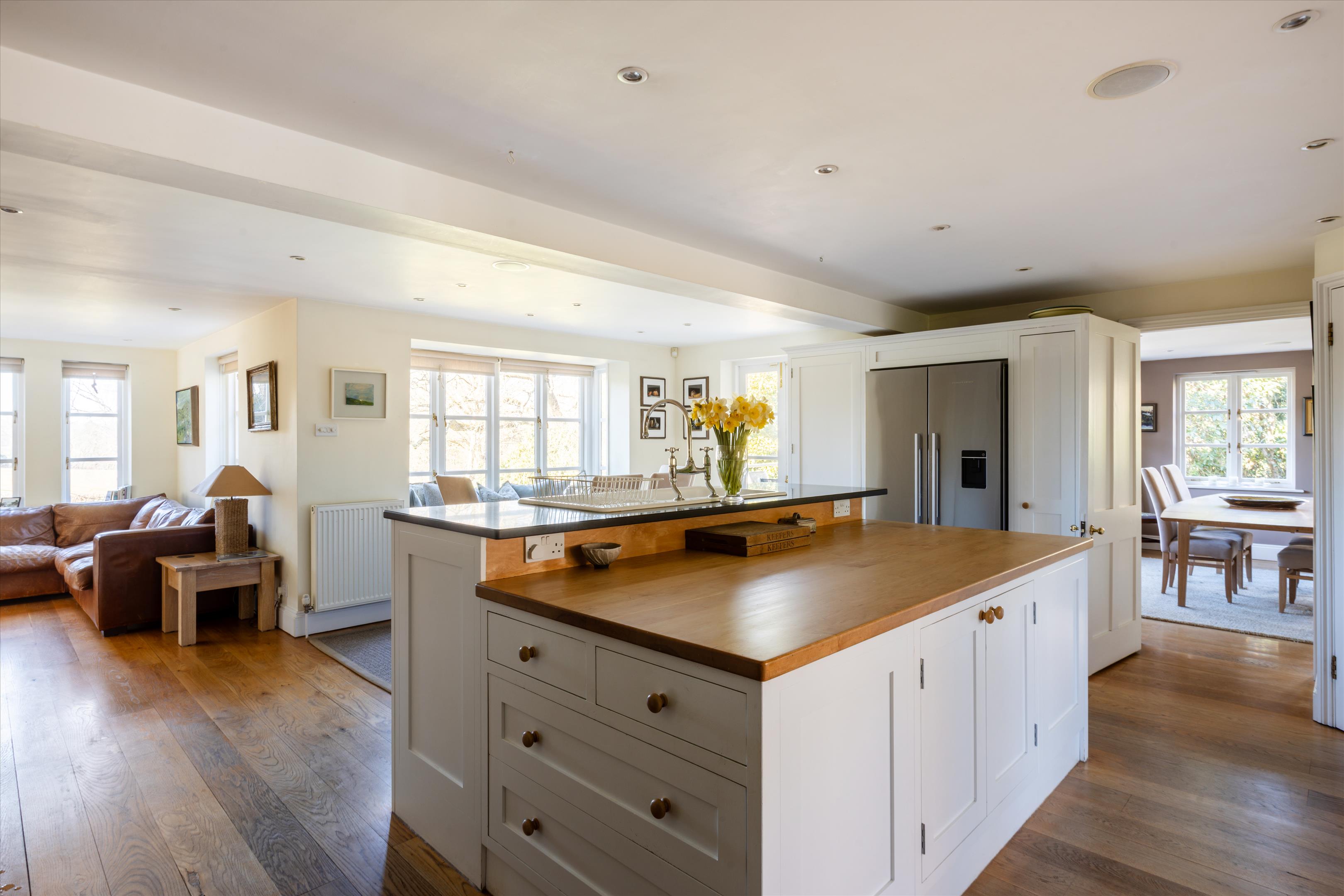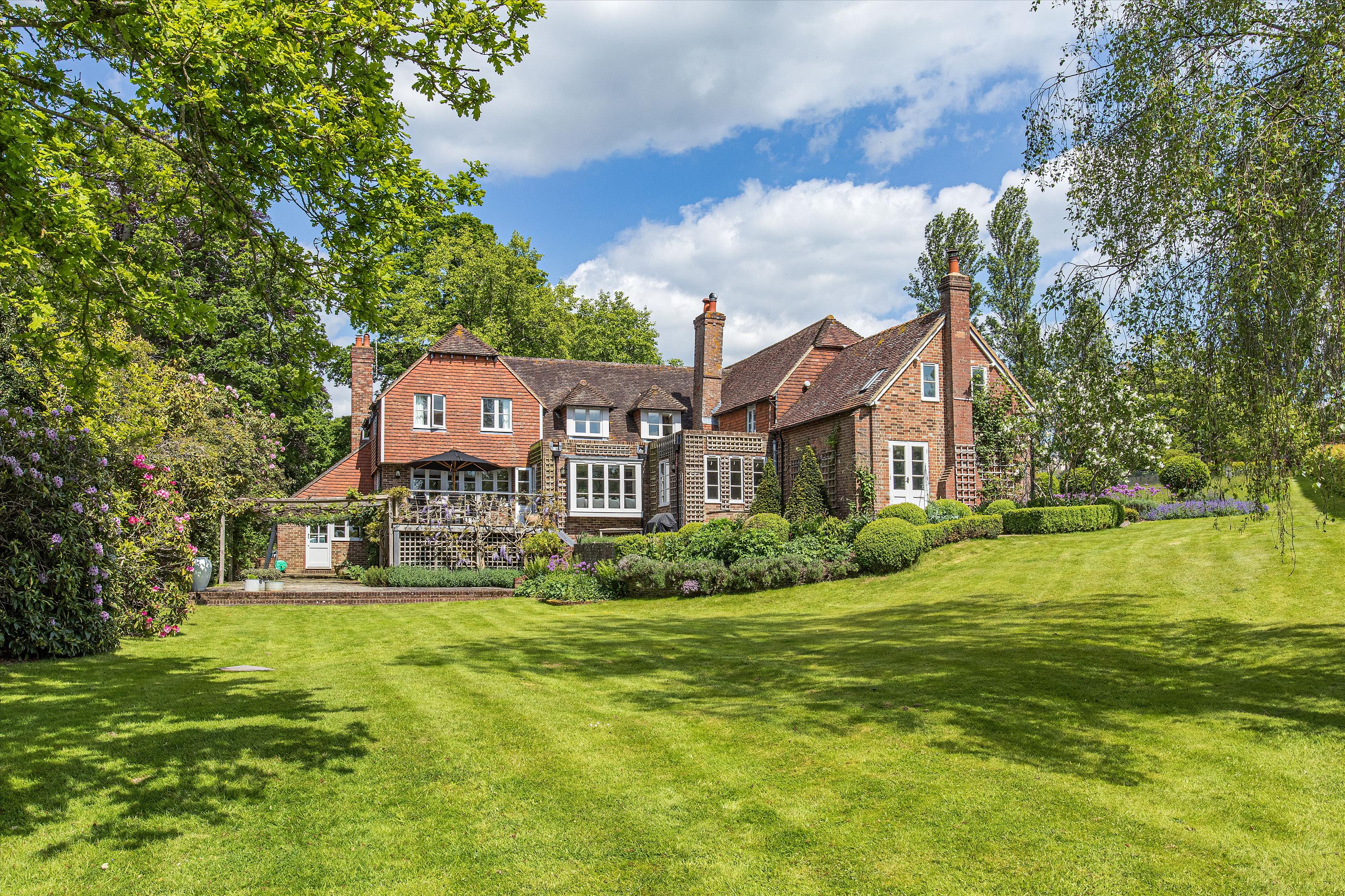 The main house offers elegant living spaces, including the light and bright entrance hall, which leads straight through to the kitchen and breakfast room, designed by Chamber Furniture. The formal reception room and library, to the left of the kitchen, sit in the oldest part of the house which dates back to 18th century and offer lovely entertaining spaces for hosting friends and family. A bespoke mezzanine, accessed via a spiral staircase, has also been added to the library to provide a fantastic office space. Adjoining the kitchen to the right, the dining room offers another versatile space for entertaining. French doors lead out to a raised terrace and seating area providing beautiful views over the gardens and fields beyond. Additionally, off the hallway, there is a games/home cinema room, stairs leading down the utility/boot room, storage and a downstairs cloakroom. Ascending upstairs, the property boasts five double bedrooms. The principal suite offers fantastic accommodation with a walk-in wardrobe, large bathroom and south facing views. The guest suite, situated in the original part of the house, comprises of fitted wardrobes, an en suite bathroom which has been finished to a high standard. Three further double bedrooms shared a well-appointed family bathroom.