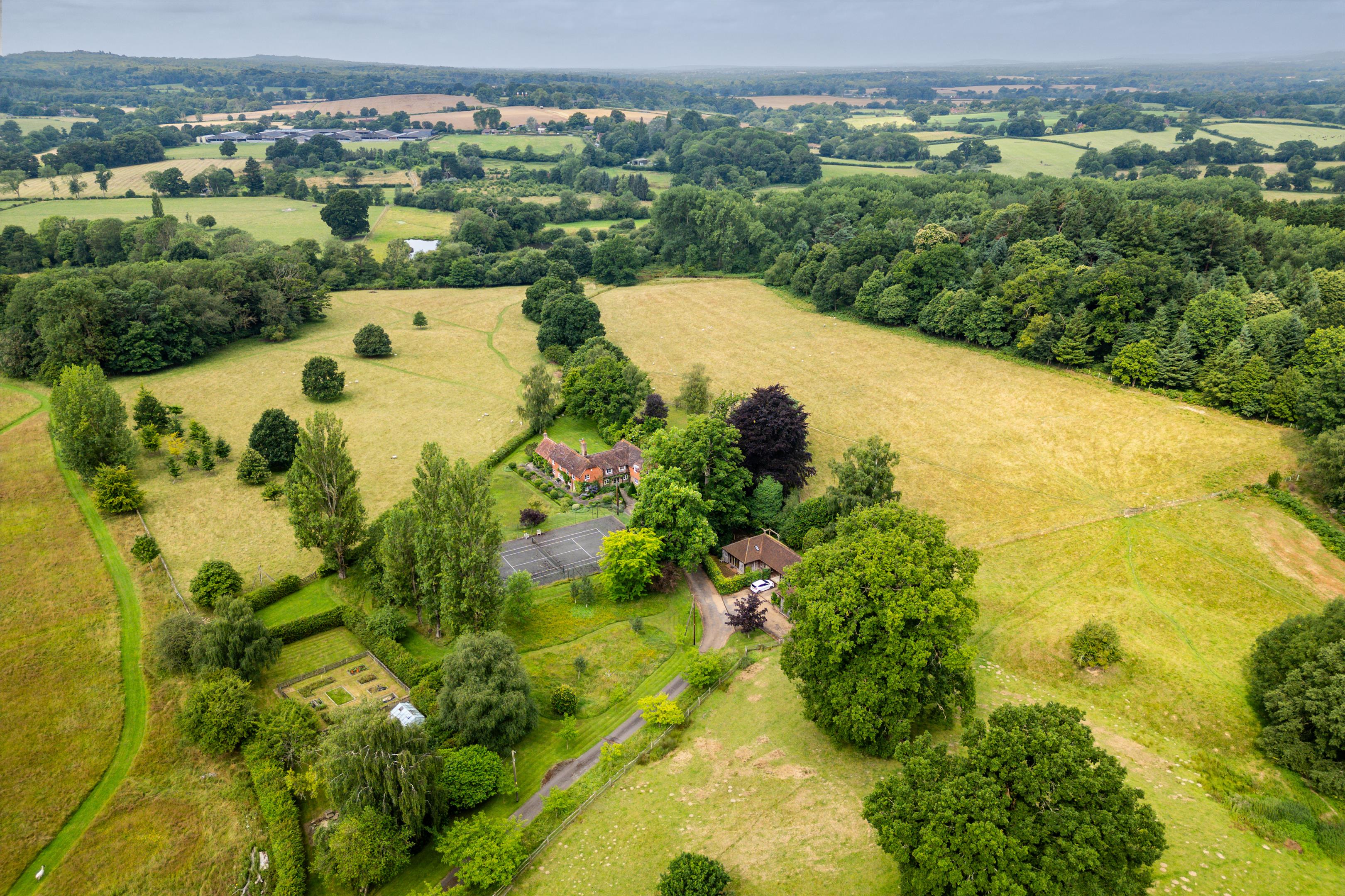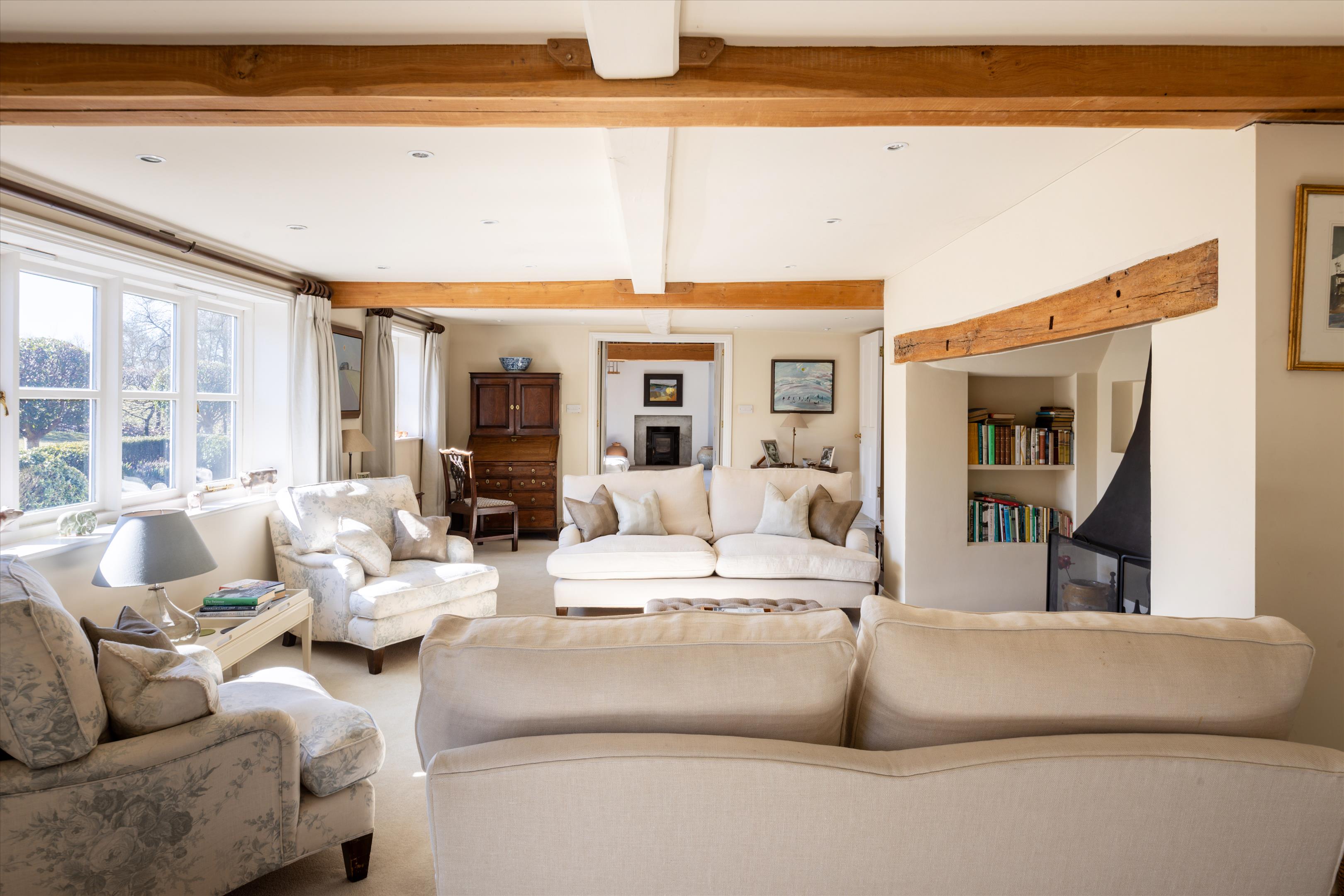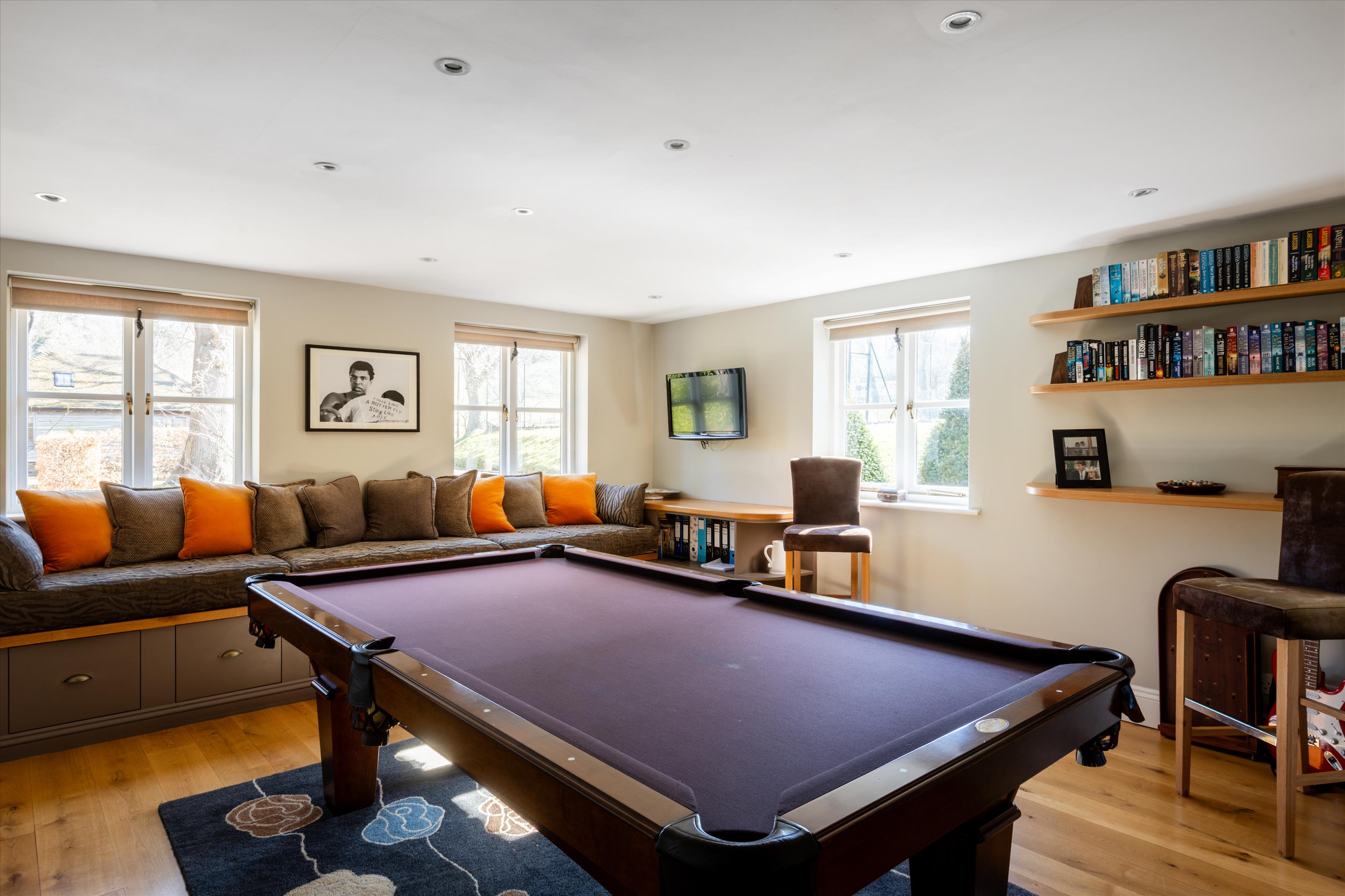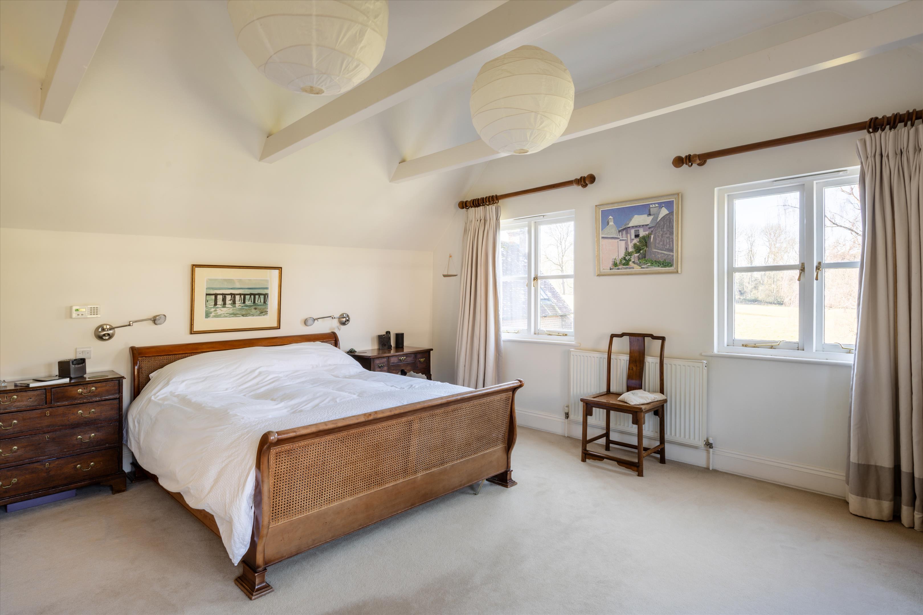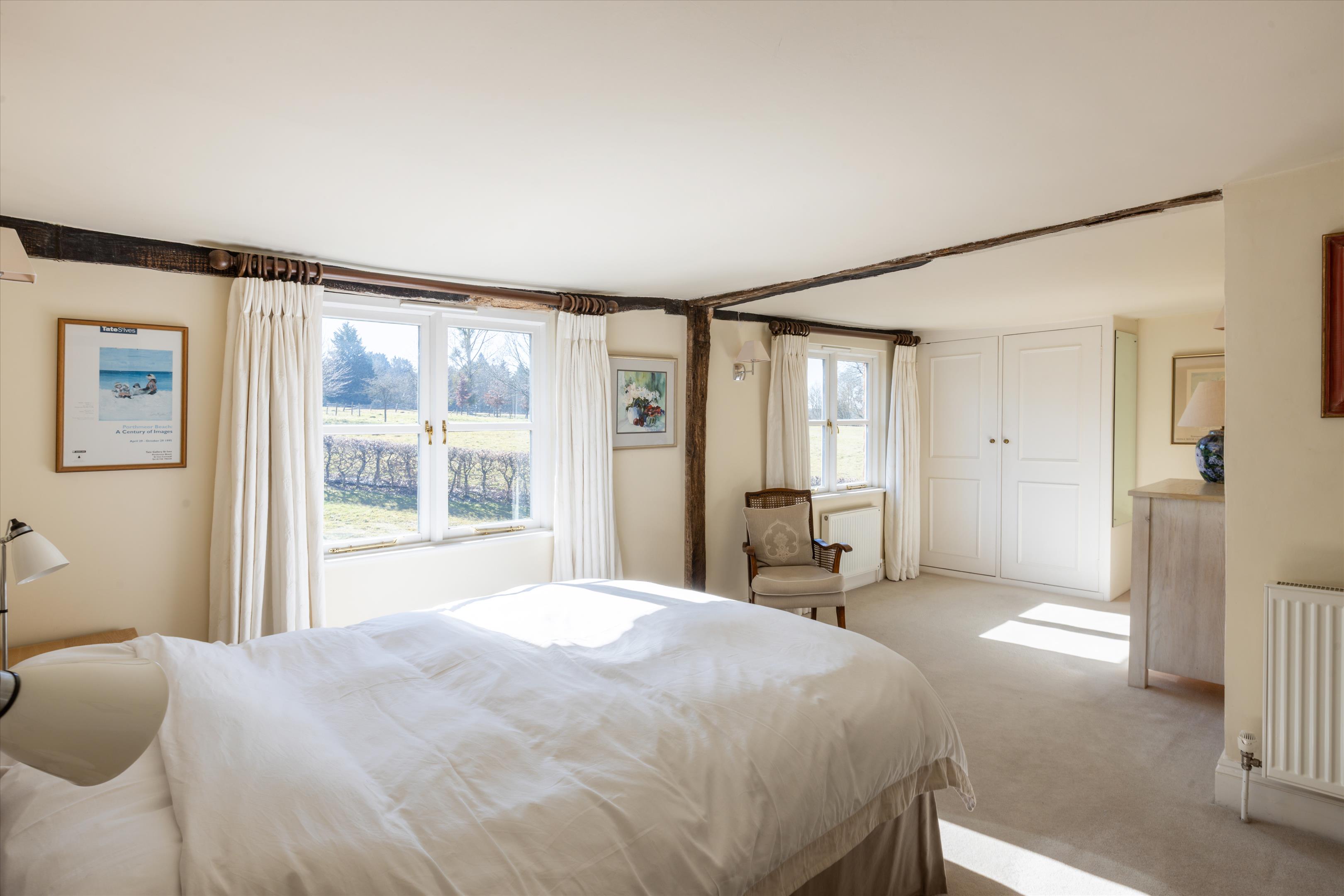 The main house offers elegant living spaces, including the light and bright entrance hall, which leads straight through to the kitchen and breakfast room, designed by Chamber Furniture. The formal reception room and library, to the left of the kitchen, sit in the oldest part of the house which dates back to 18th century and offer lovely entertaining spaces for hosting friends and family. A bespoke mezzanine, accessed via a spiral staircase, has also been added to the library to provide a fantastic office space. Adjoining the kitchen to the right, the dining room offers another versatile space for entertaining. French doors lead out to a raised terrace and seating area providing beautiful views over the gardens and fields beyond. Additionally, off the hallway, there is a games/home cinema room, stairs leading down the utility/boot room, storage and a downstairs cloakroom. Ascending upstairs, the property boasts five double bedrooms. The principal suite offers fantastic accommodation with a walk-in wardrobe, large bathroom and south facing views. The guest suite, situated in the original part of the house, comprises of fitted wardrobes, an en suite bathroom which has been finished to a high standard. Three further double bedrooms shared a well-appointed family bathroom.