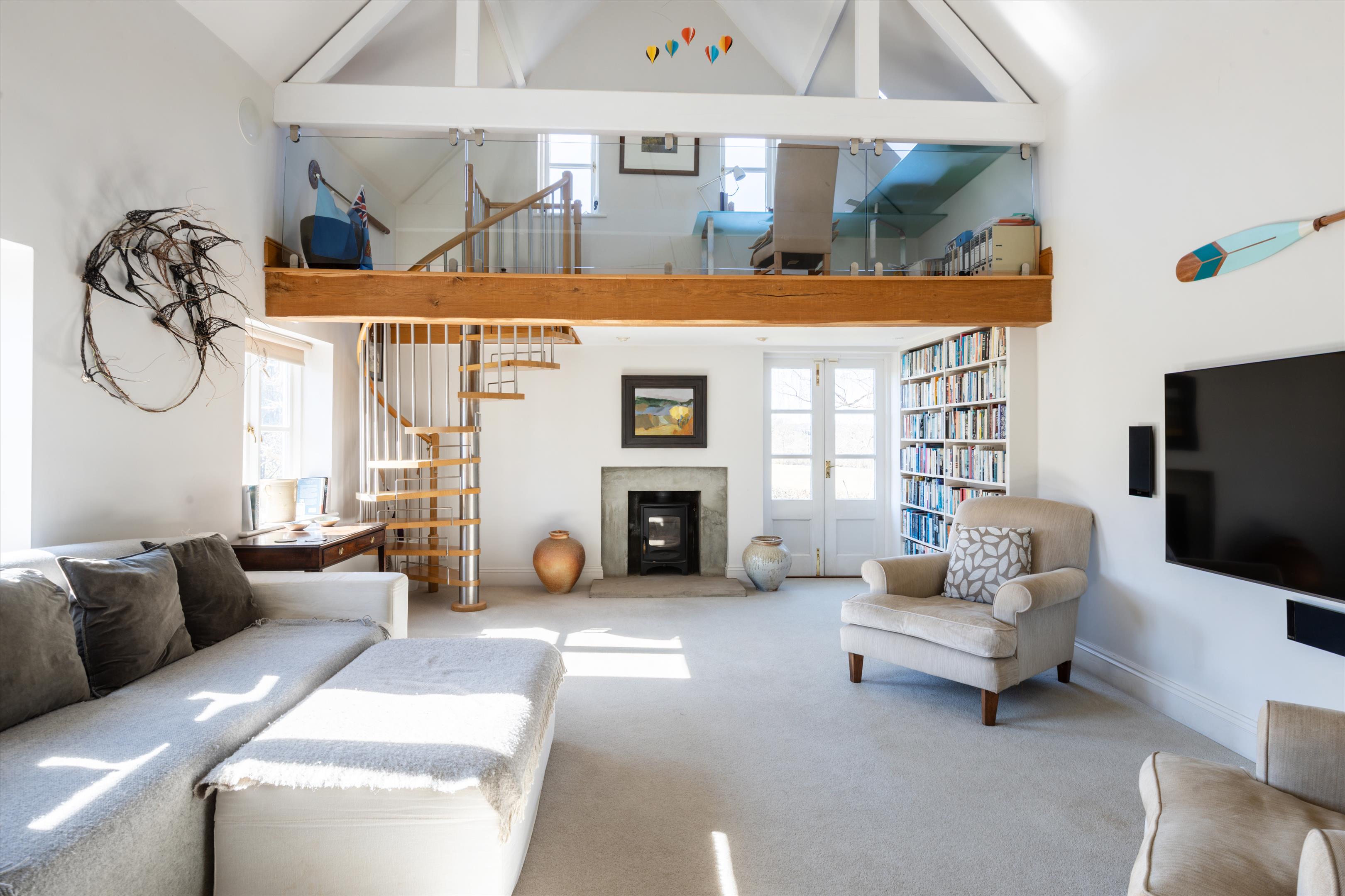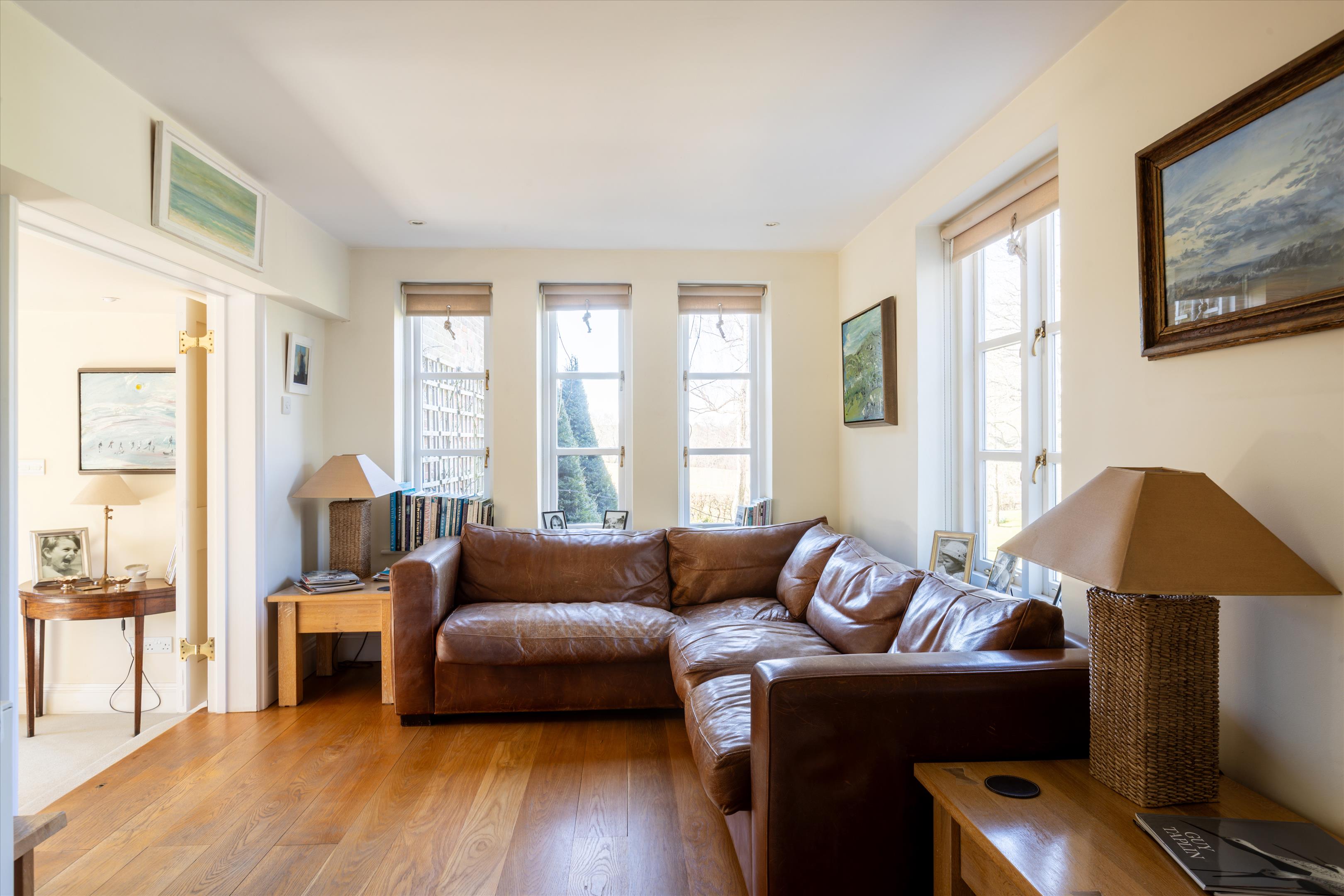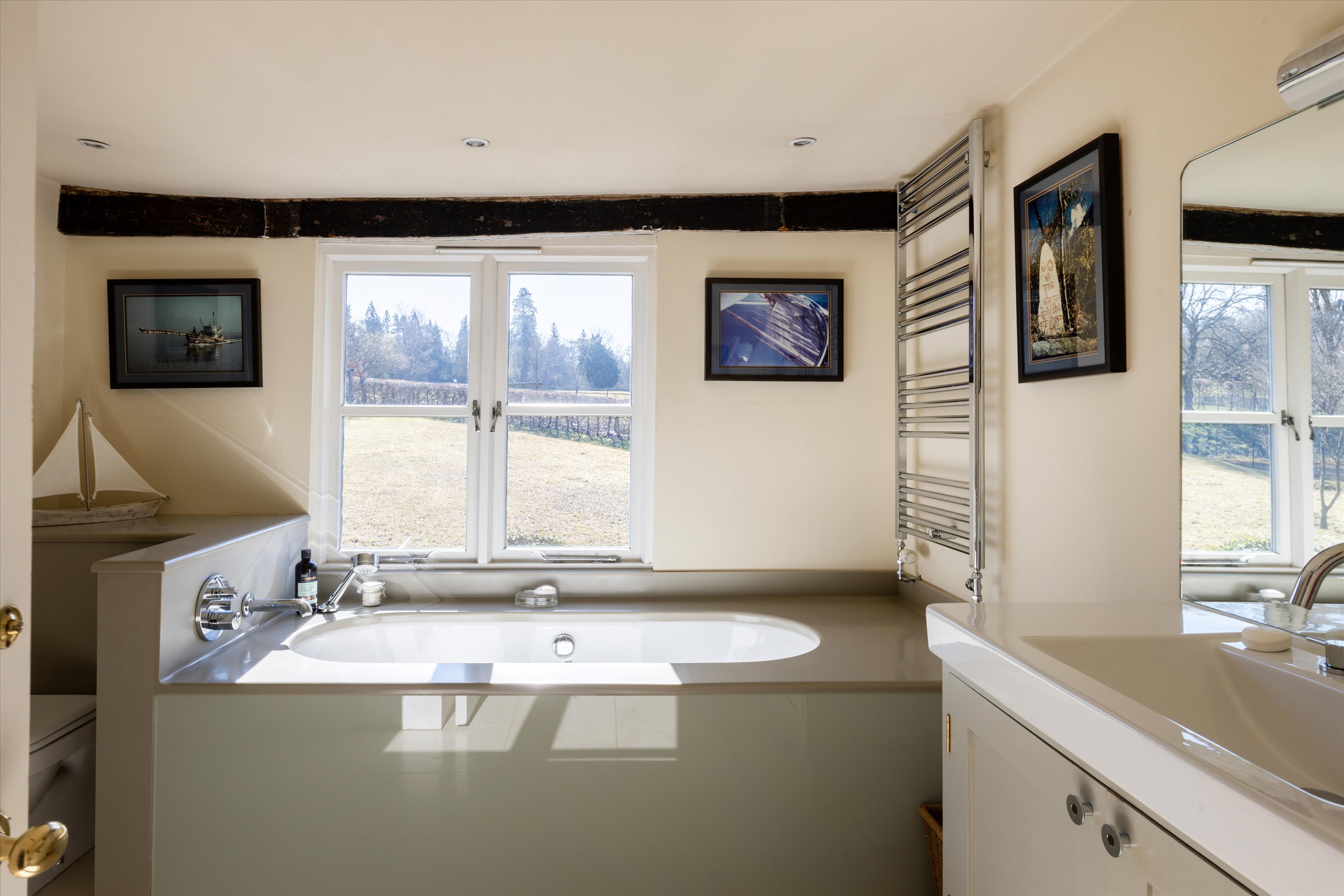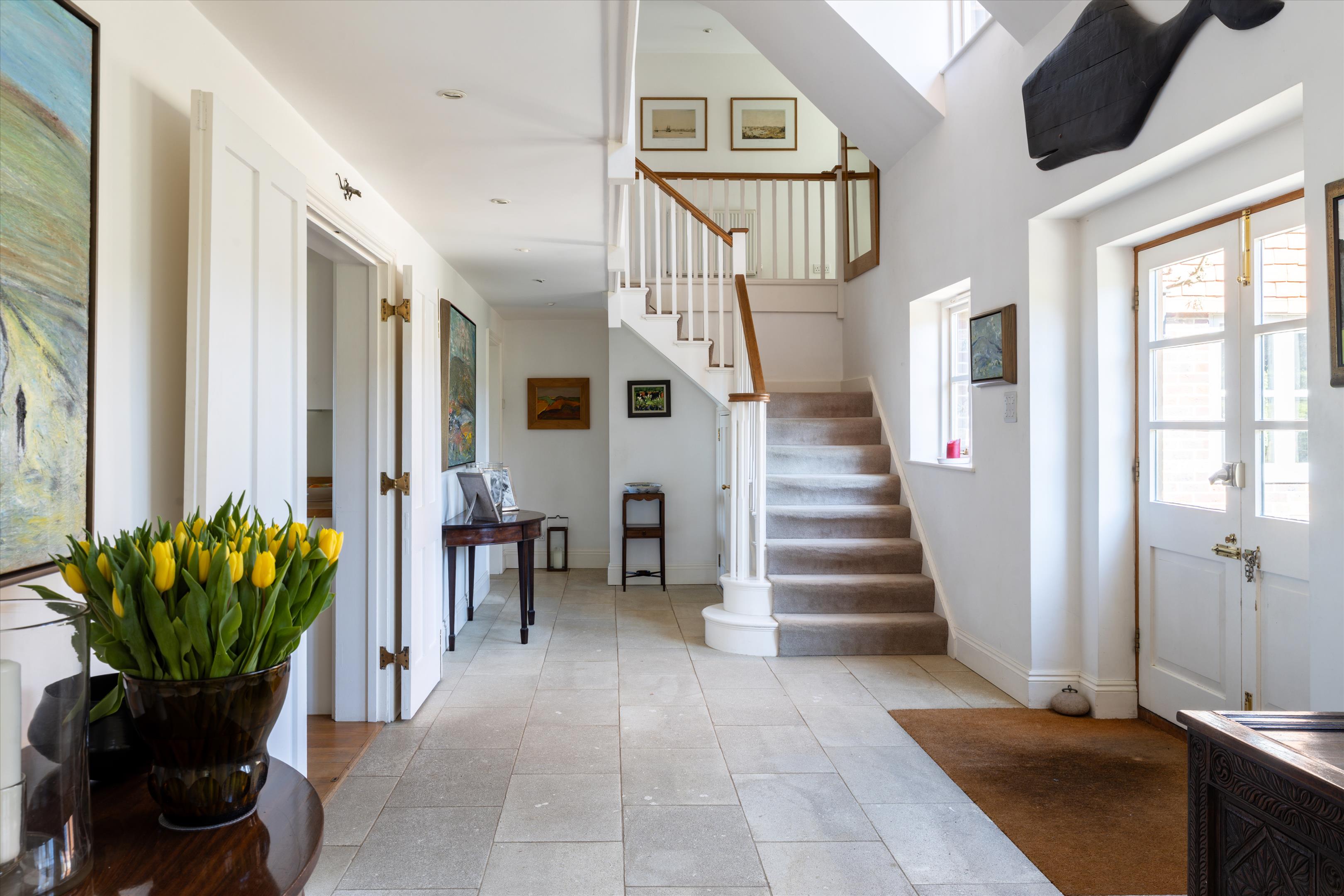 The main house offers elegant living spaces, including the light and bright entrance hall, which leads straight through to the kitchen and breakfast room, designed by Chamber Furniture. The formal reception room and library, to the left of the kitchen, sit in the oldest part of the house which dates back to 18th century and offer lovely entertaining spaces for hosting friends and family. A bespoke mezzanine, accessed via a spiral staircase, has also been added to the library to provide a fantastic office space. Adjoining the kitchen to the right, the dining room offers another versatile space for entertaining. French doors lead out to a raised terrace and seating area providing beautiful views over the gardens and fields beyond. Additionally, off the hallway, there is a games/home cinema room, stairs leading down the utility/boot room, storage and a downstairs cloakroom. Ascending upstairs, the property boasts five double bedrooms. The principal suite offers fantastic accommodation with a walk-in wardrobe, large bathroom and south facing views. The guest suite, situated in the original part of the house, comprises of fitted wardrobes, an en suite bathroom which has been finished to a high standard. Three further double bedrooms shared a well-appointed family bathroom.