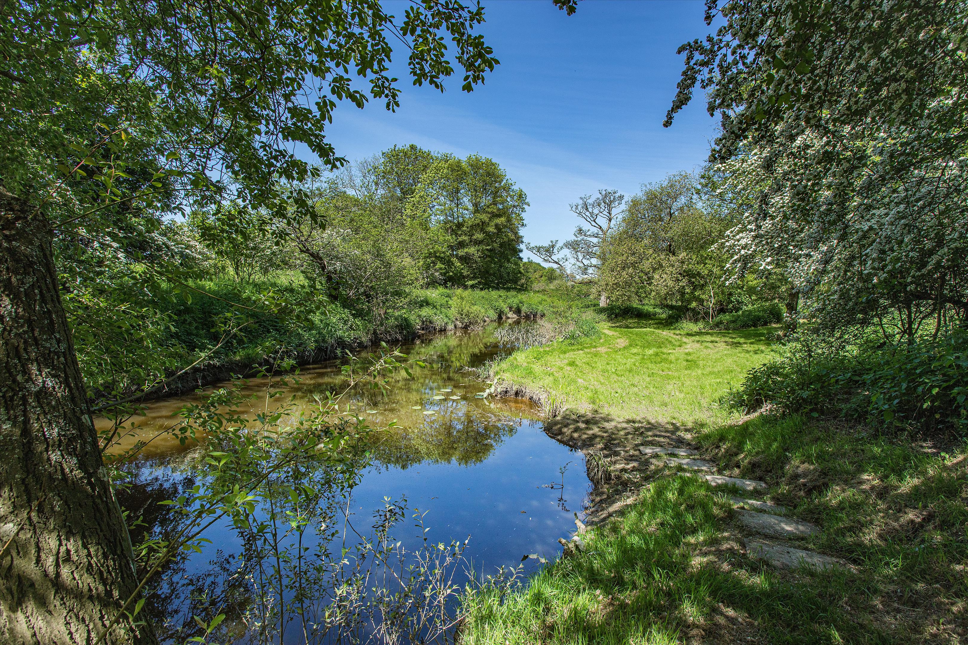 The estate's 23.4 acres features open fields, woodland, mature and well-manicured gardens, herbaceous beds, a small orchard and vegetable patch. The private river frontage on the River Eden offers endless activities including kayaking, canoeing, swimming and a lovely space to entertain friends and family. There is also a WWII pillbox by the river which adds to its charm. The property also benefits from its own tennis court.