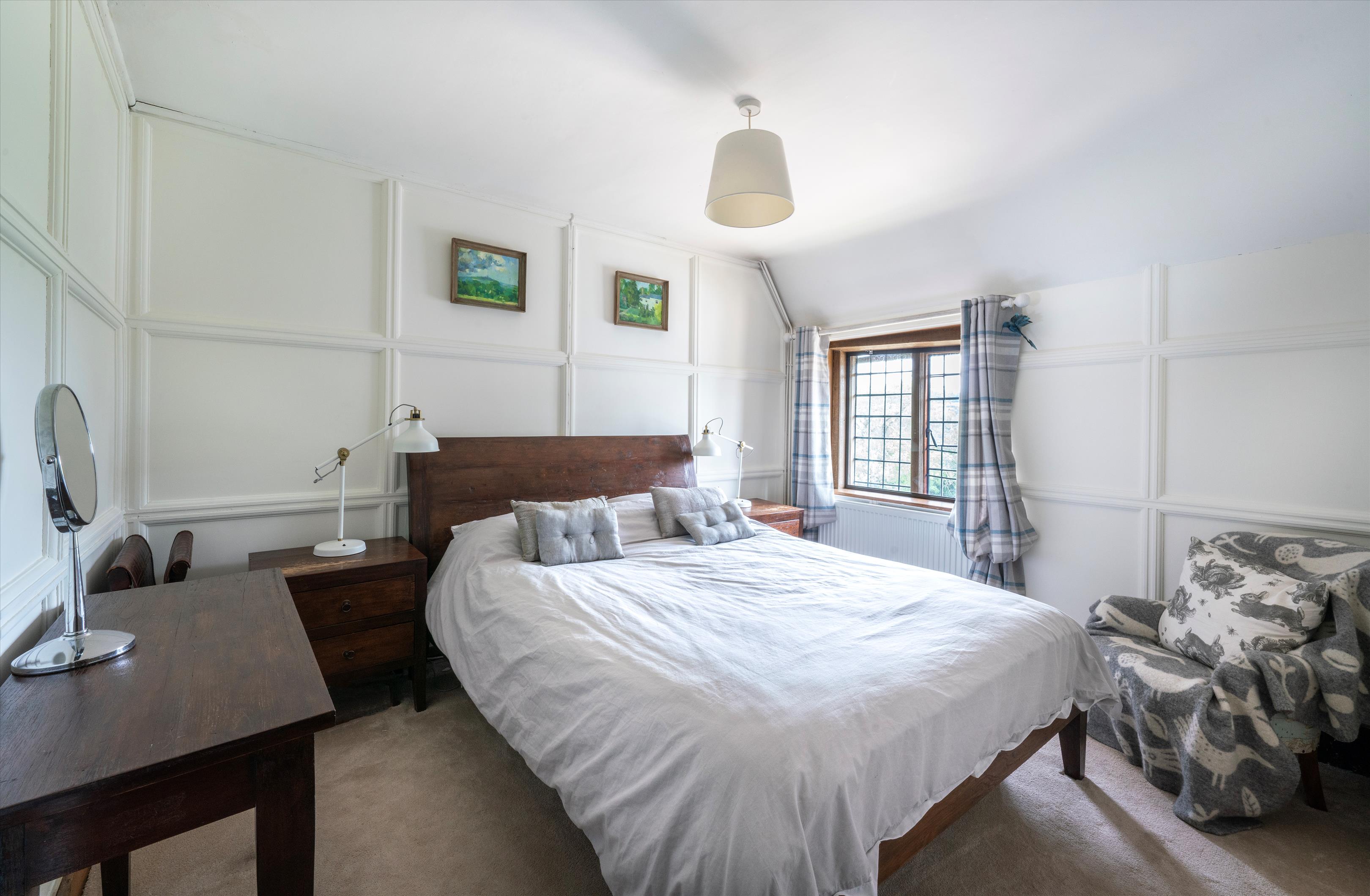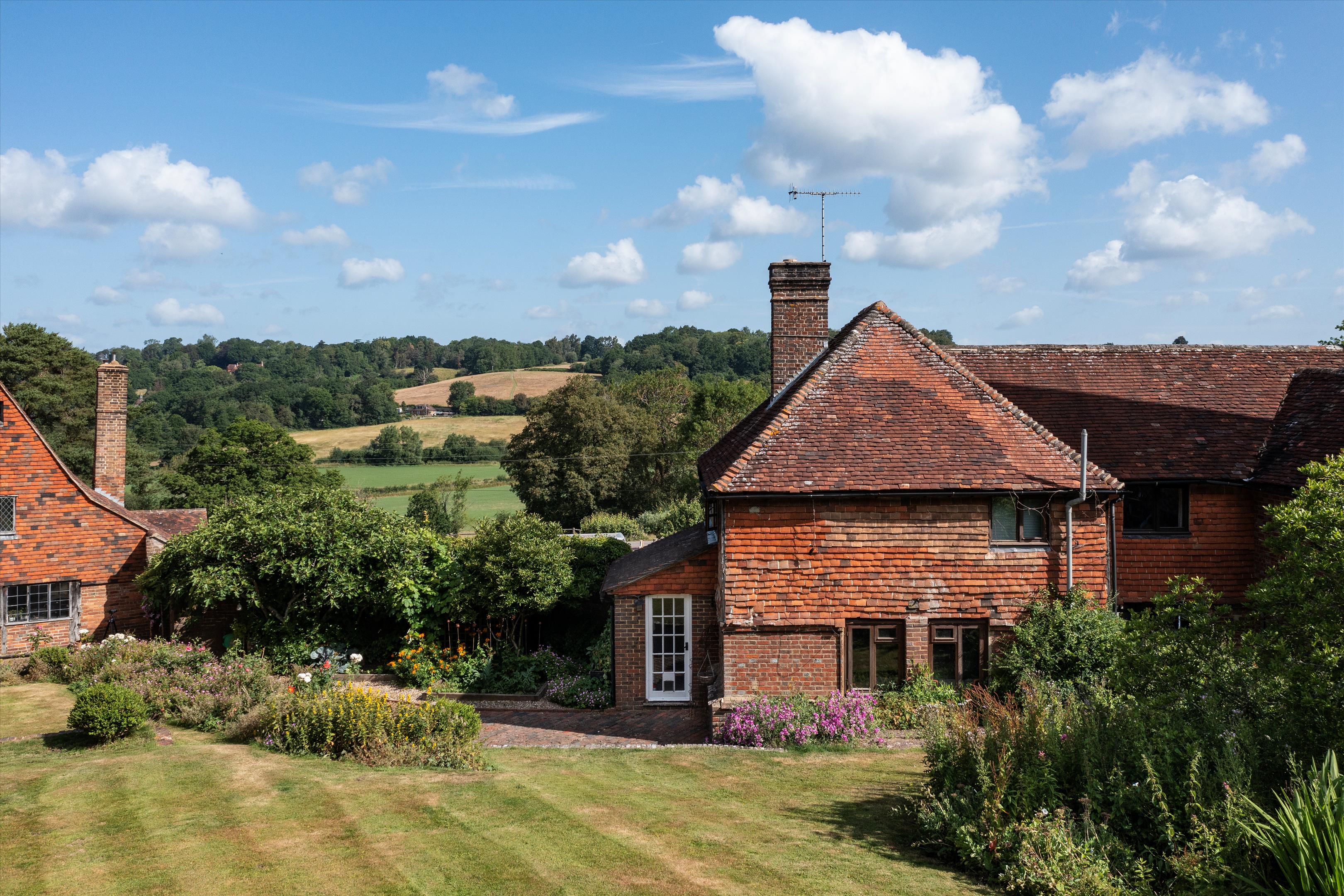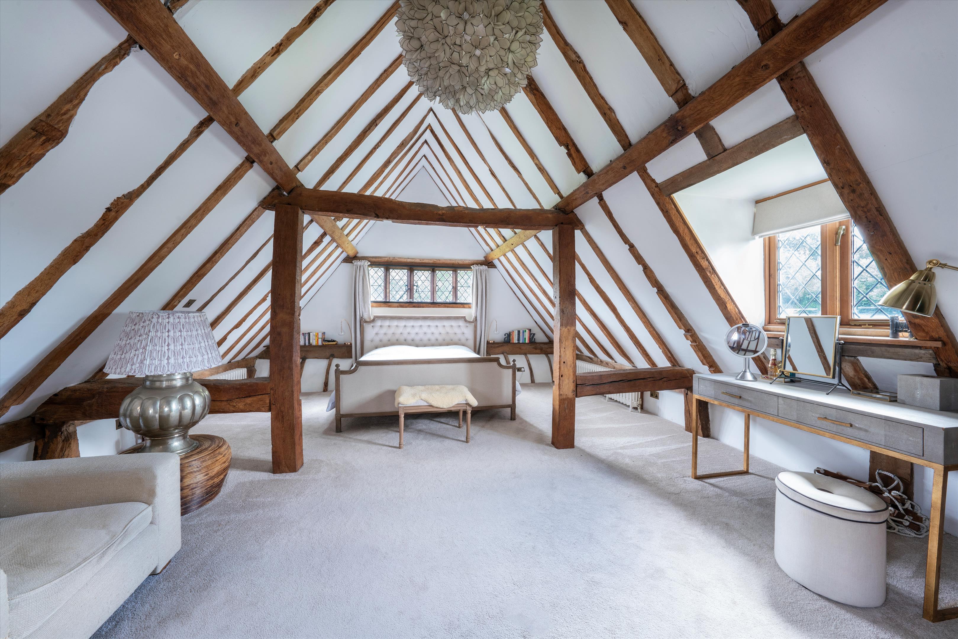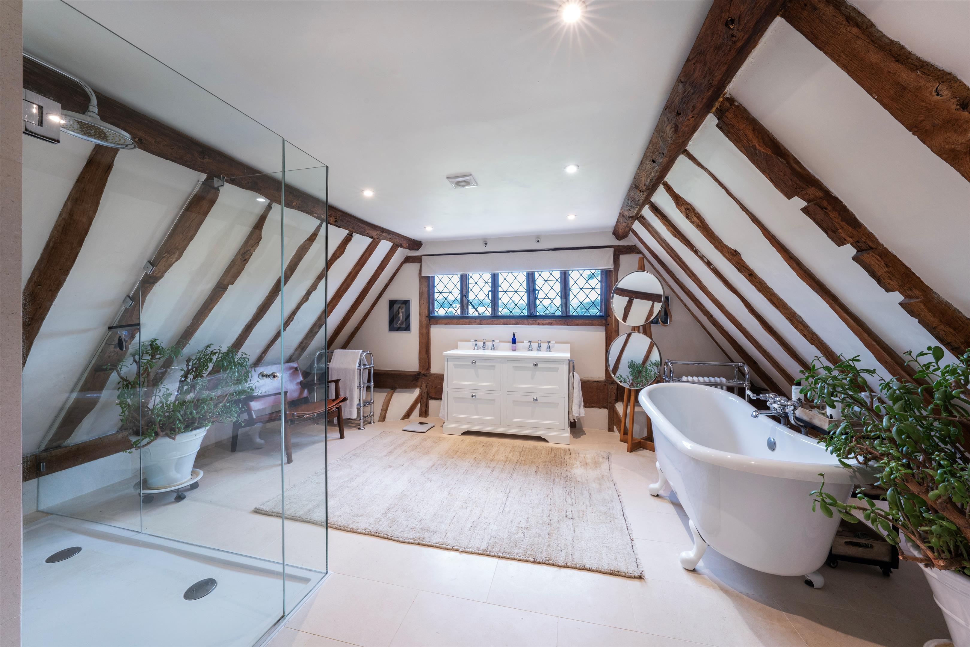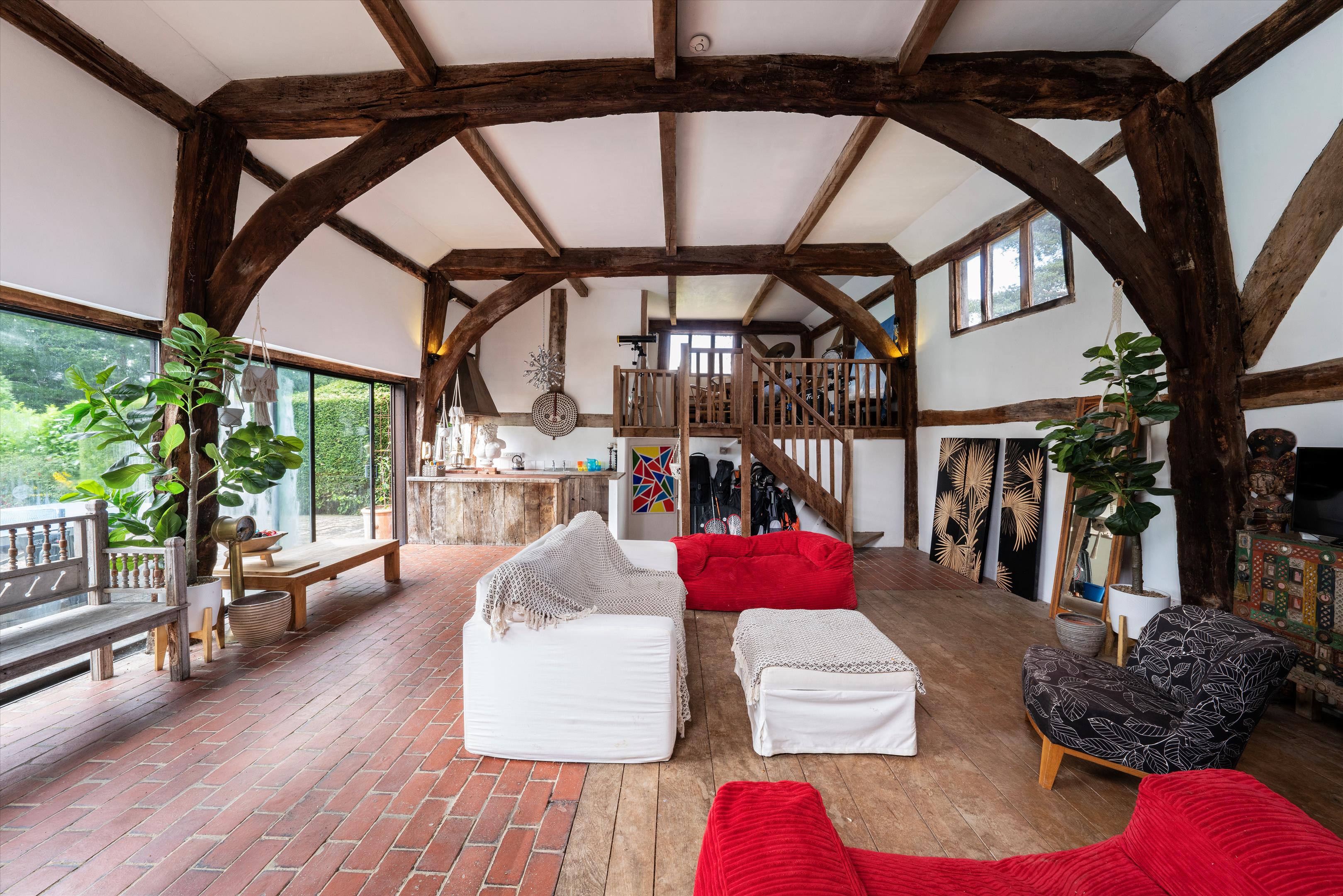 From the lower shared secondary drive, there is access to the neighbouring Oast house. Part of the barn-end of this forms the cottage to the Manor house, which enjoys parking and a garage, with a small private garden and a stunning view. The Cottage accommodation comprises three bedrooms and a bathroom upstairs, with a living room and kitchen/diner downstairs. The thatched barn is an impressive structure used for storage/garaging and with two attached loose boxes. The pool house/party barn is a wonderful double height summer entertaining area, with sliding glazed doors onto the sheltered swimming pool, enclosed by walls and hedging. Impressive, with its exposed timber frame and brick block and timber flooring, the pool house provides a kitchen and a mezzanine gallery/stage, with changing room facilities below.