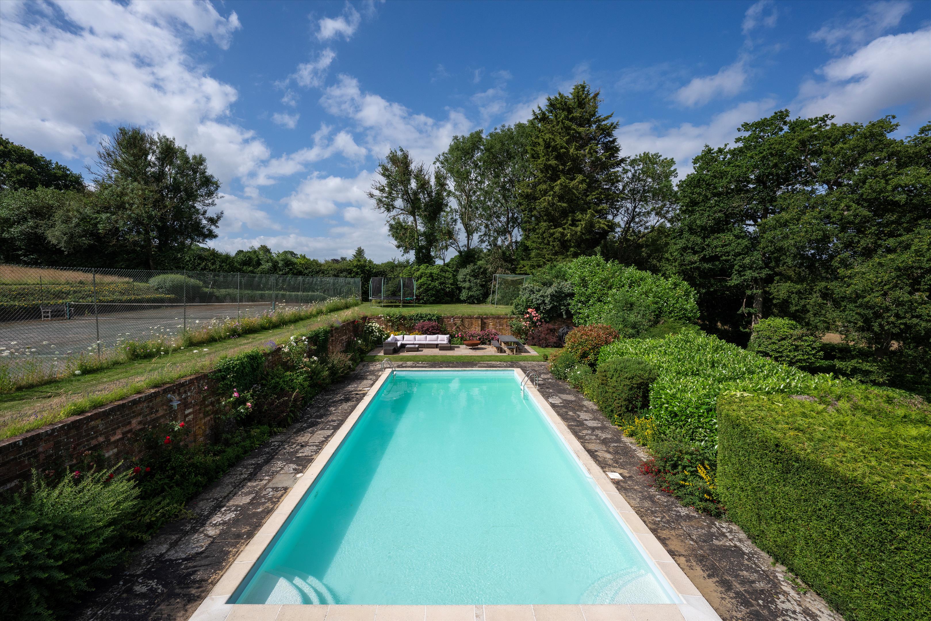 There is a tennis court on the raised land by the pool, with a wild flower meadow beyond, leading up to a further lawn, used for football goals etc.The paddock at the front stretches down to the road, with the public footpath crossing a small area as shown on the land plan. This footpath ultimately leads to the separate wood which is included within the sale. Outside, the house sits within a grouping of period buildings with parklike grounds to the front, right down to the road, including lawn and paddock and a small orchard.