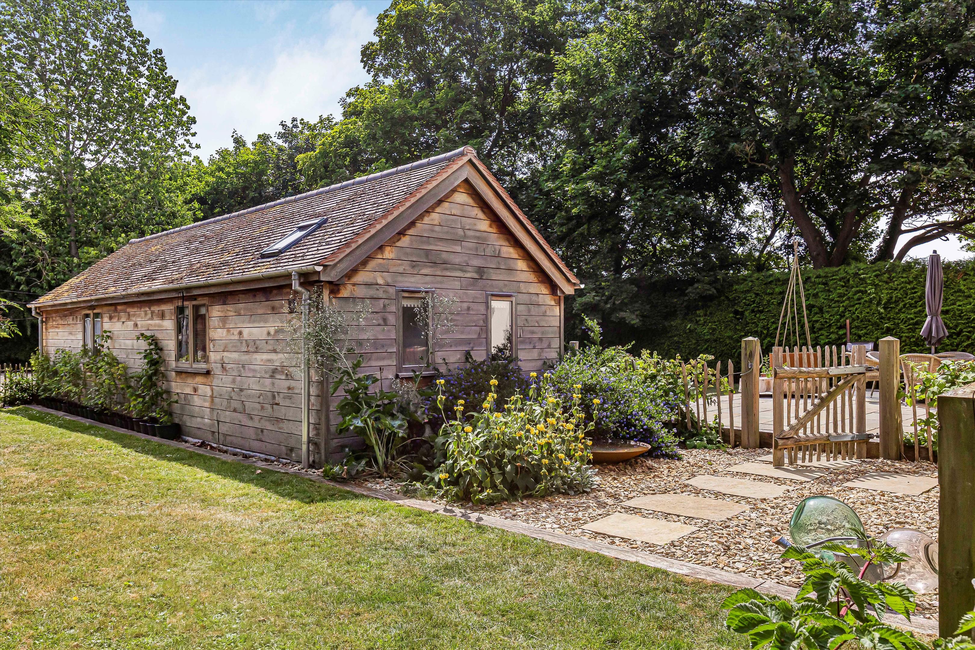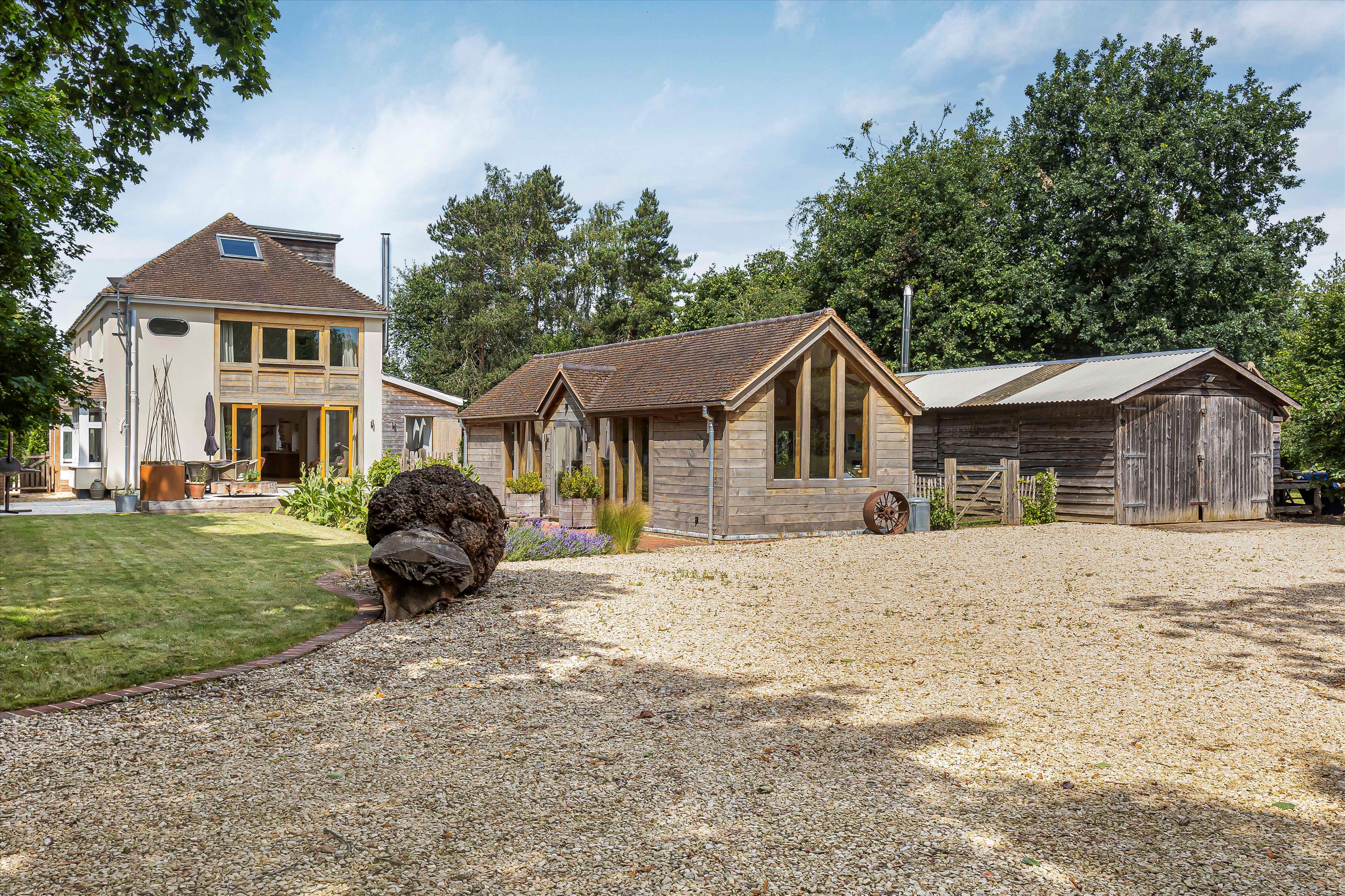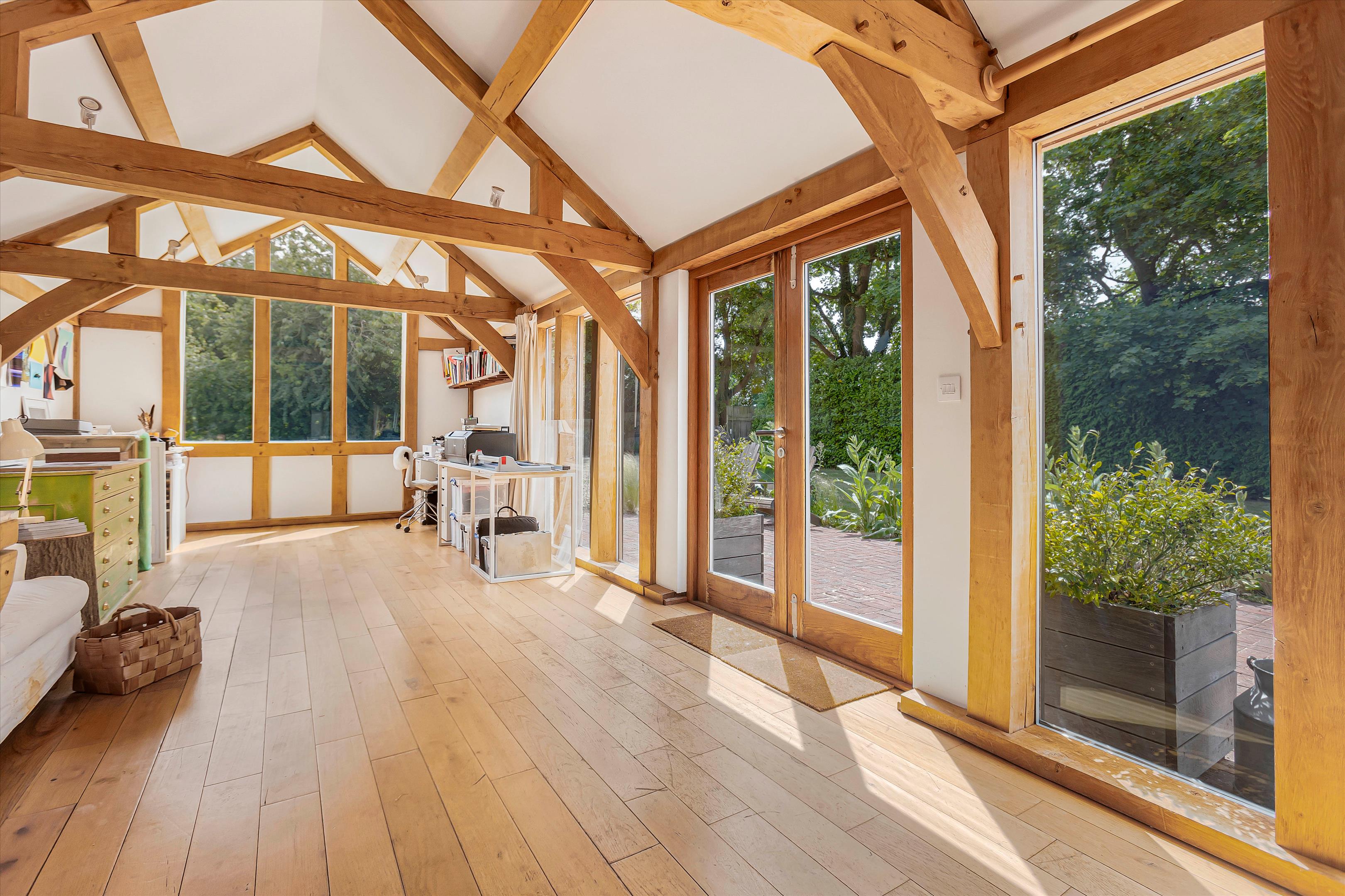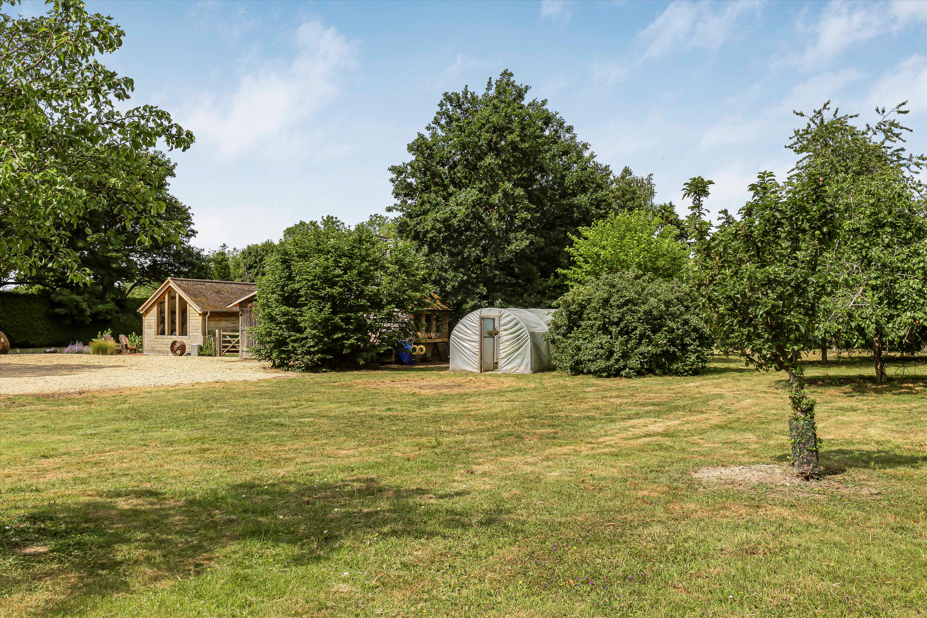 Externally, Blagrove Lodge is equally impressive. The property was converted from agricultural to residential use approximately ten years ago and has been carefully curated since. The large green oak building in the garden provides a multitude of opportunities from artists studio-office or extra living space.The garden is well-stocked and features a mature orchard with apple, quince, damson, plum, hazelnut, mulberry, pear, walnut, and cherry trees. The wider grounds have been planted under the guidance of a tree specialist, resulting in an exceptional and rare collection including Ginkgo, Wellingtonia, Cedar of Lebanon, Serbian Spruce, Lombardy Poplar, Scots Pine, Holm Oak, and Persian Ironwood, among many others.