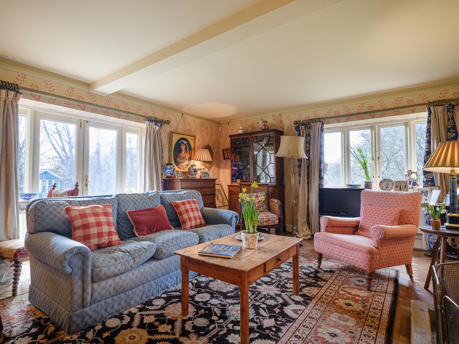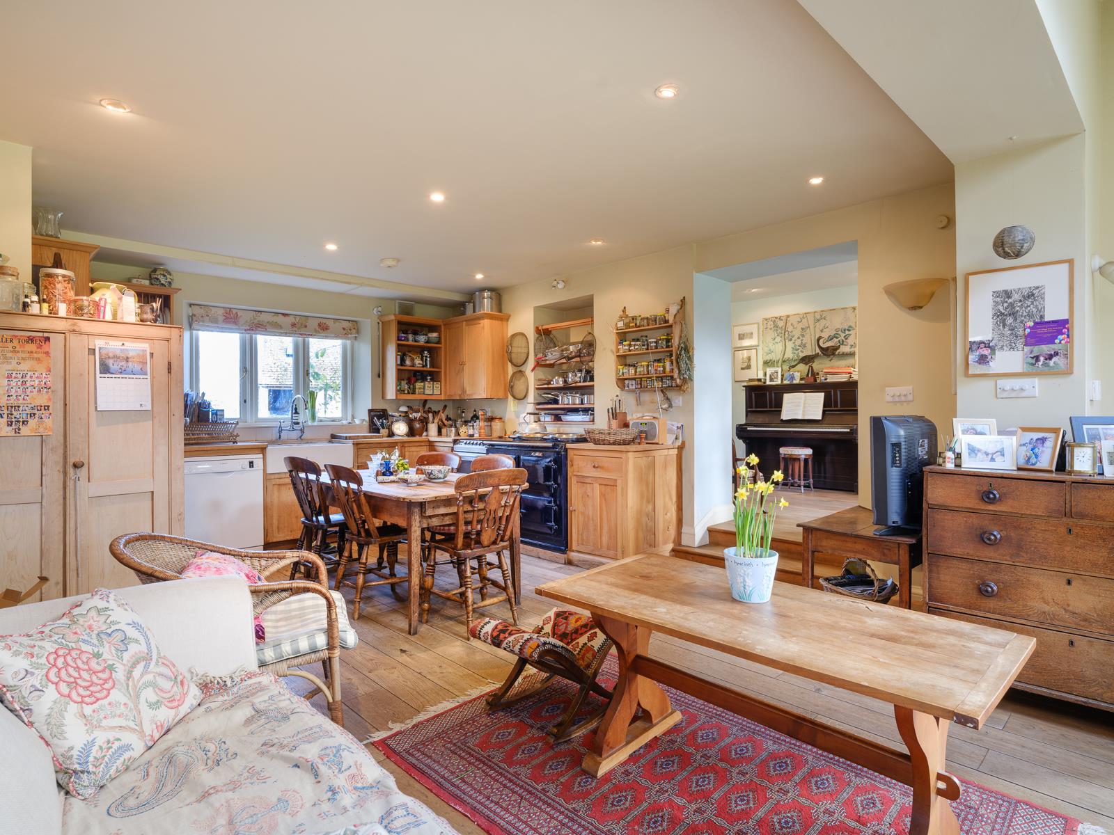 The ground floor comprises an entrance hall, a spacious open plan fully fitted kitchen and family living area with an electric Aga, underfloor heating and a well-crafted built in larder cupboard. There is also a useful utility room off the kitchen which leads out to the front of the house.