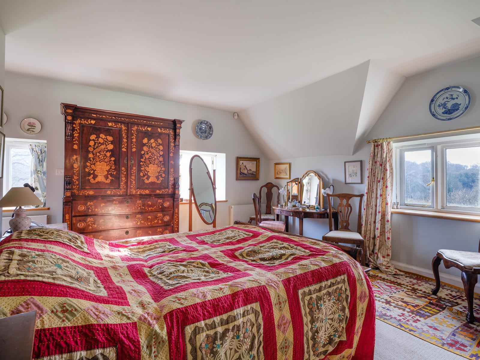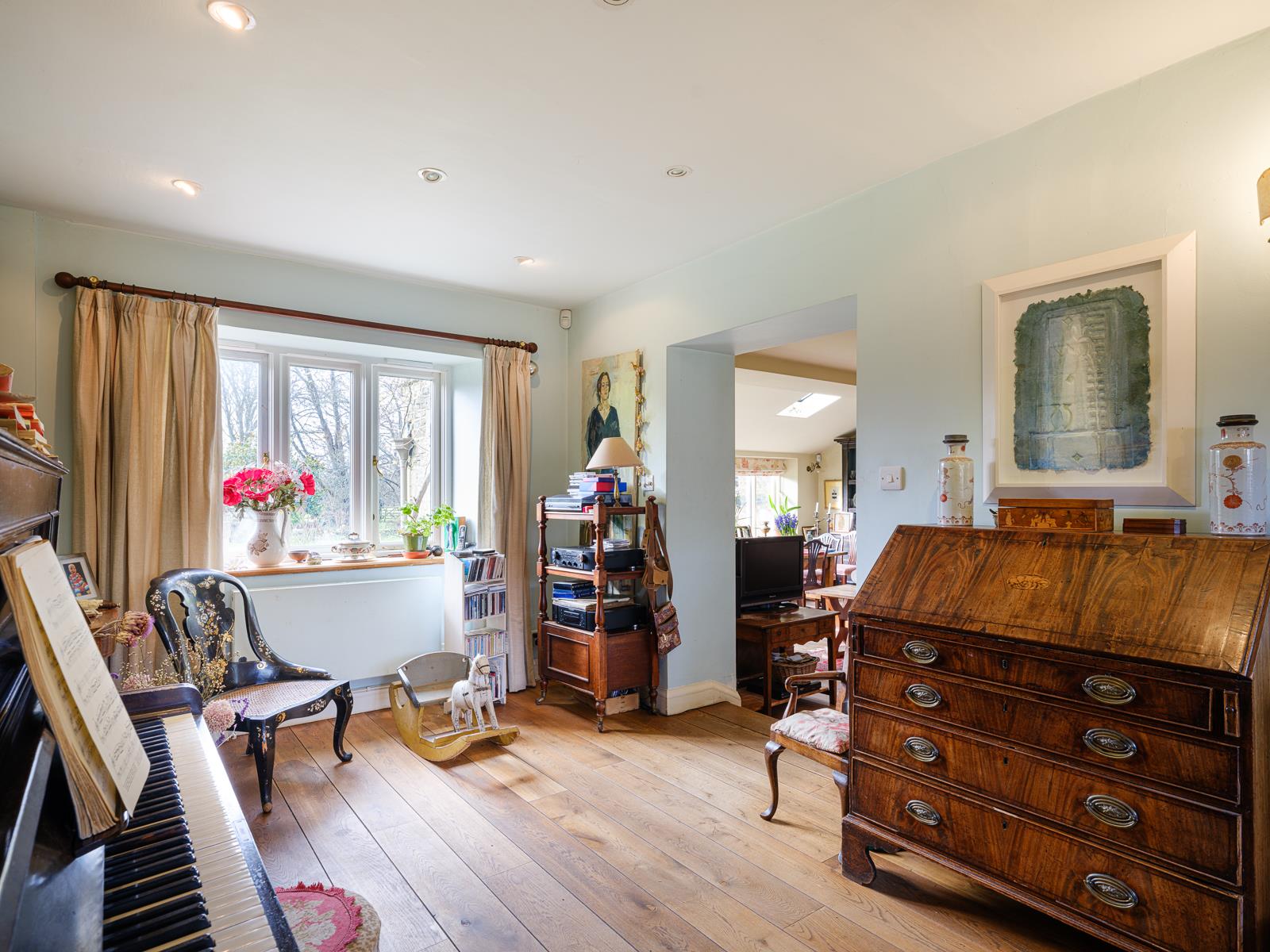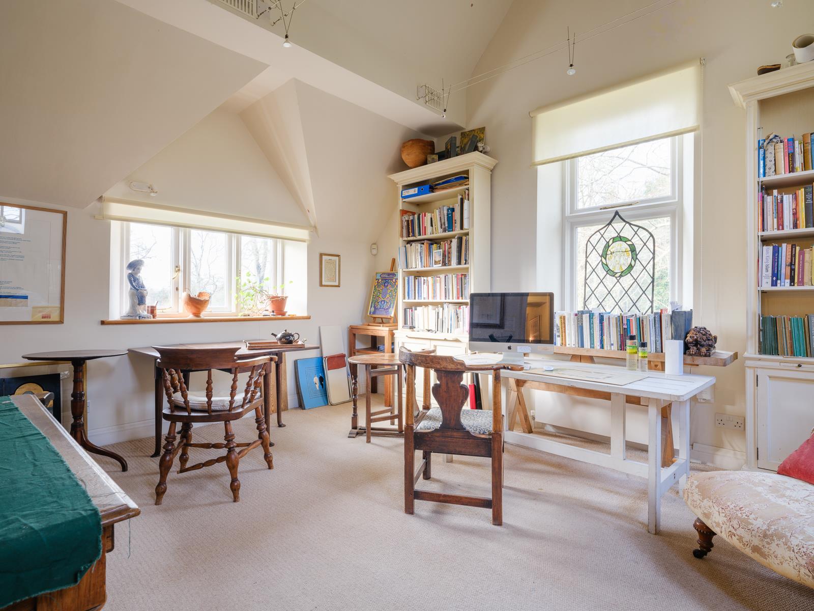 There is a dining room, a study and an inviting sitting room with dual aspects and an open fire giving a real sense of cosiness. The fourth side of the room is taken up by a beautiful walnut, arts and craft bookcase which could be available to purchase under separate negotiation.