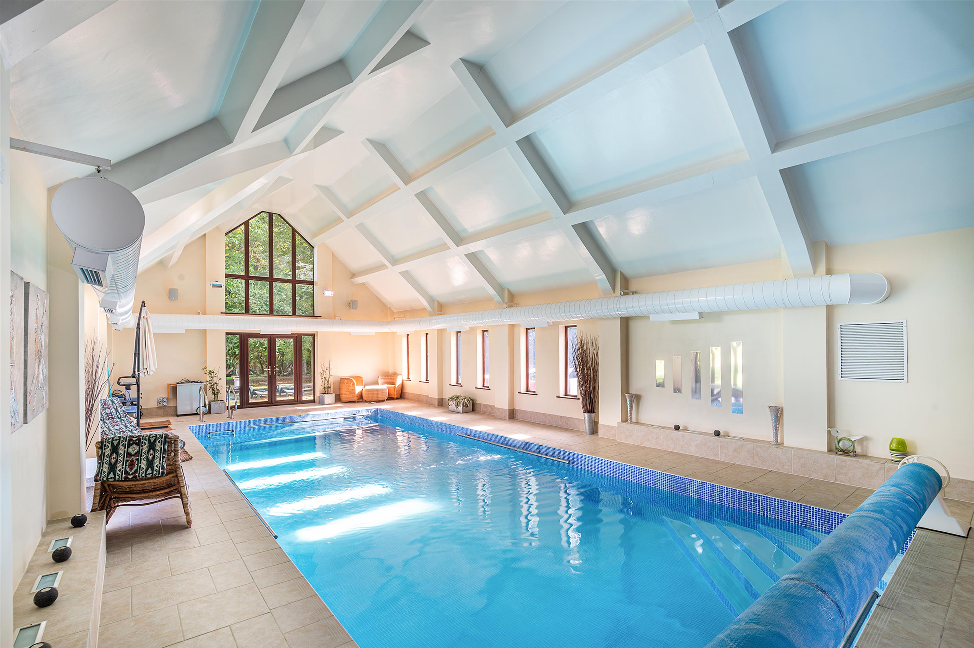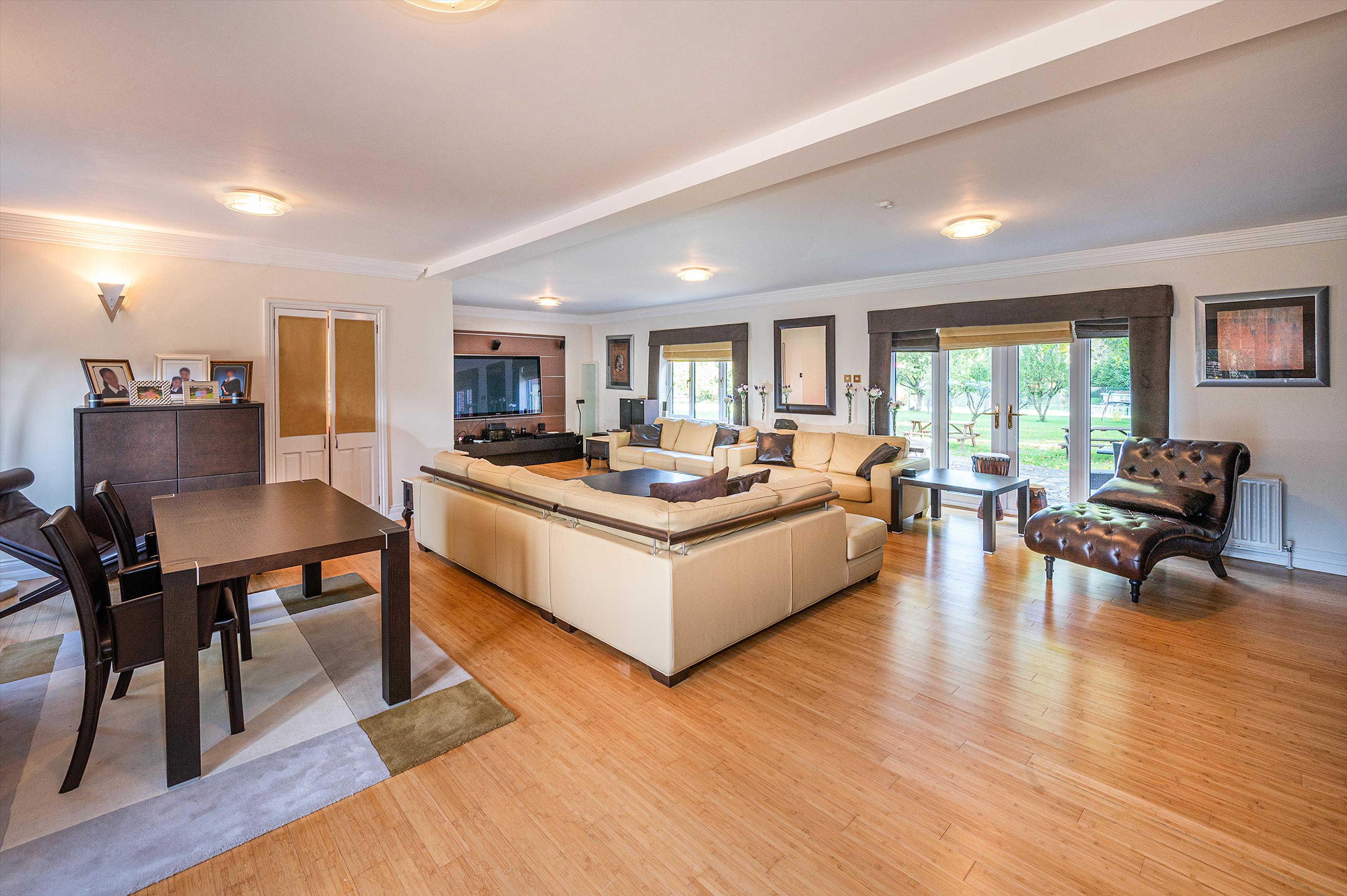The reception hall, with elegant parquet flooring, leads to a range of impressive reception rooms, including a formal dining room, a double-aspect sitting room with feature fireplace, a well-equipped kitchen/breakfast room with central island and integrated appliances, opening onto a bright conservatory, and a study. The first-floor drawing room provides a striking open-plan space for dining, sitting, and entertaining, while the ground floor also offers a snooker room with garden access and a luxurious leisure suite with heated swimming pool, sauna, and gym. The main house combines stylish and versatile living spaces designed for both family life and entertaining.