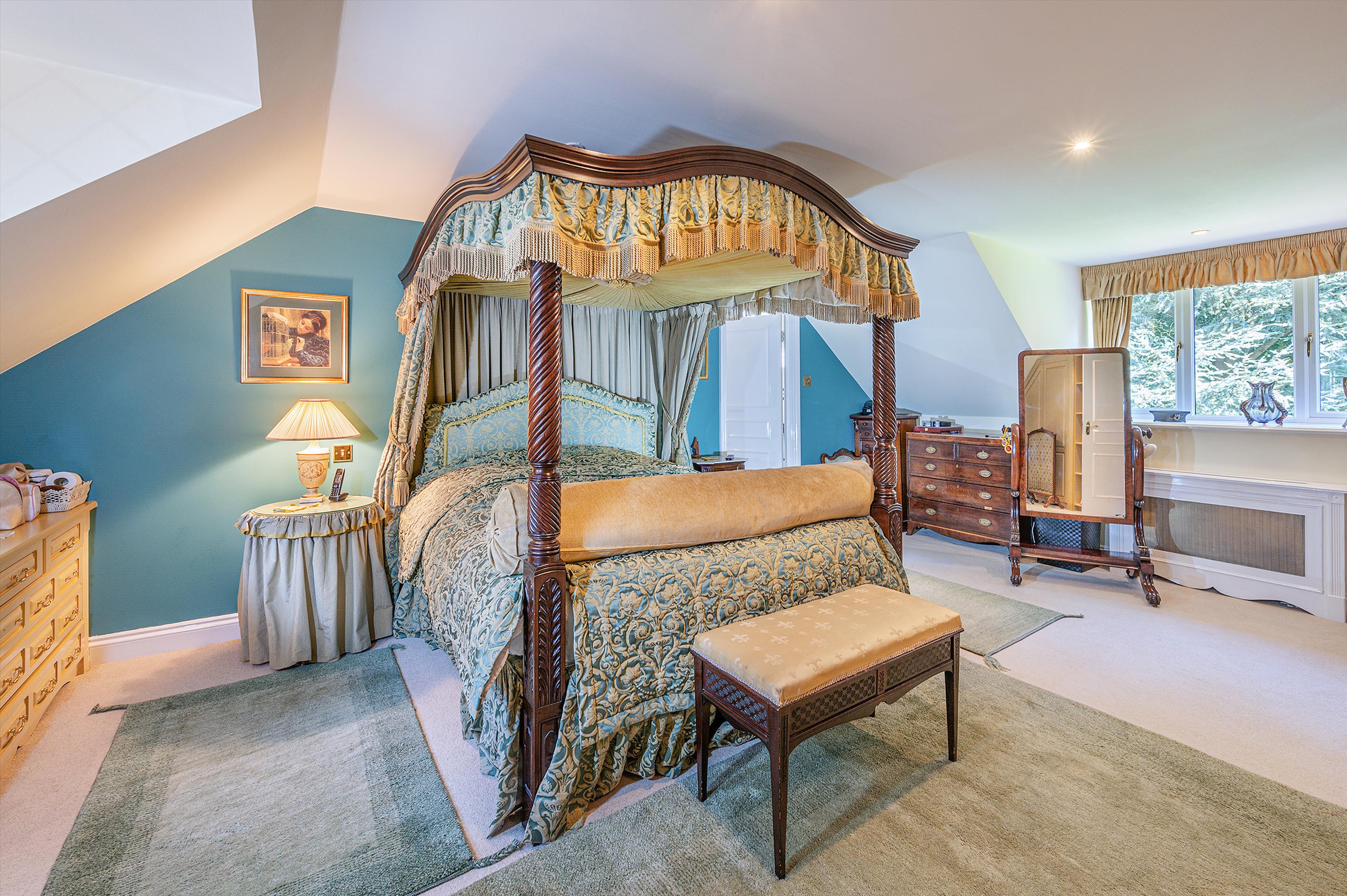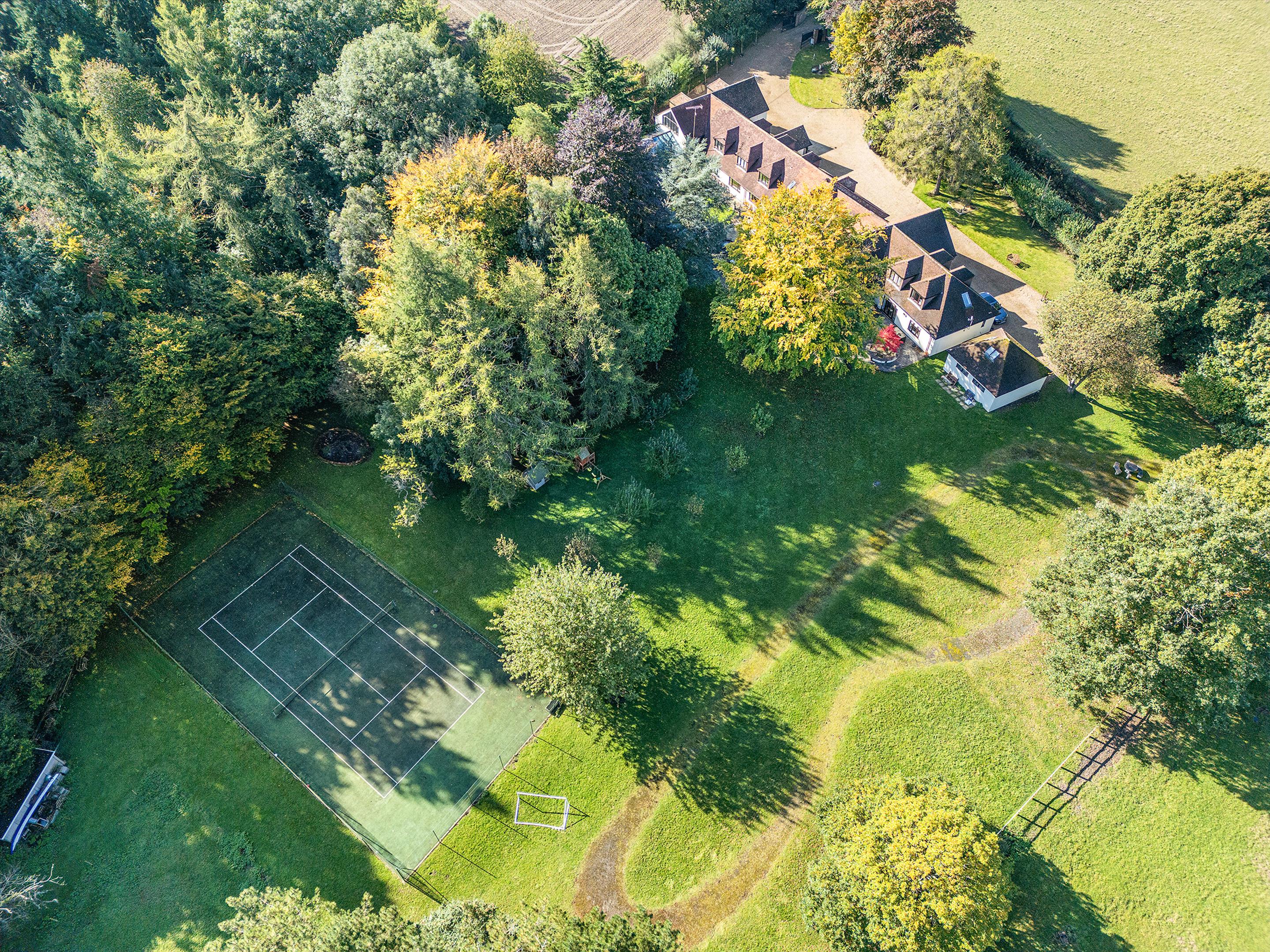 Outside, Heathwood is approached through secure electric gates that open onto a sweeping driveway, providing ample parking and access to a spacious double garage. The magnificent grounds extend to around 6.1 acres and have been thoughtfully designed to combine formal landscaped gardens with open lawns, established planting, and areas of natural beauty. A private tennis court offers excellent recreational space, while enchanting stretches of woodland create a wonderful sense of privacy and seclusion. The gardens provide a variety of settings for relaxation and entertaining, from sunlit terraces to shaded pathways. In addition to its charm and character, the property also embraces modern efficiency, benefiting from a ground source heat pump and solar panels, which enhance its sustainability and reduce environmental impact.