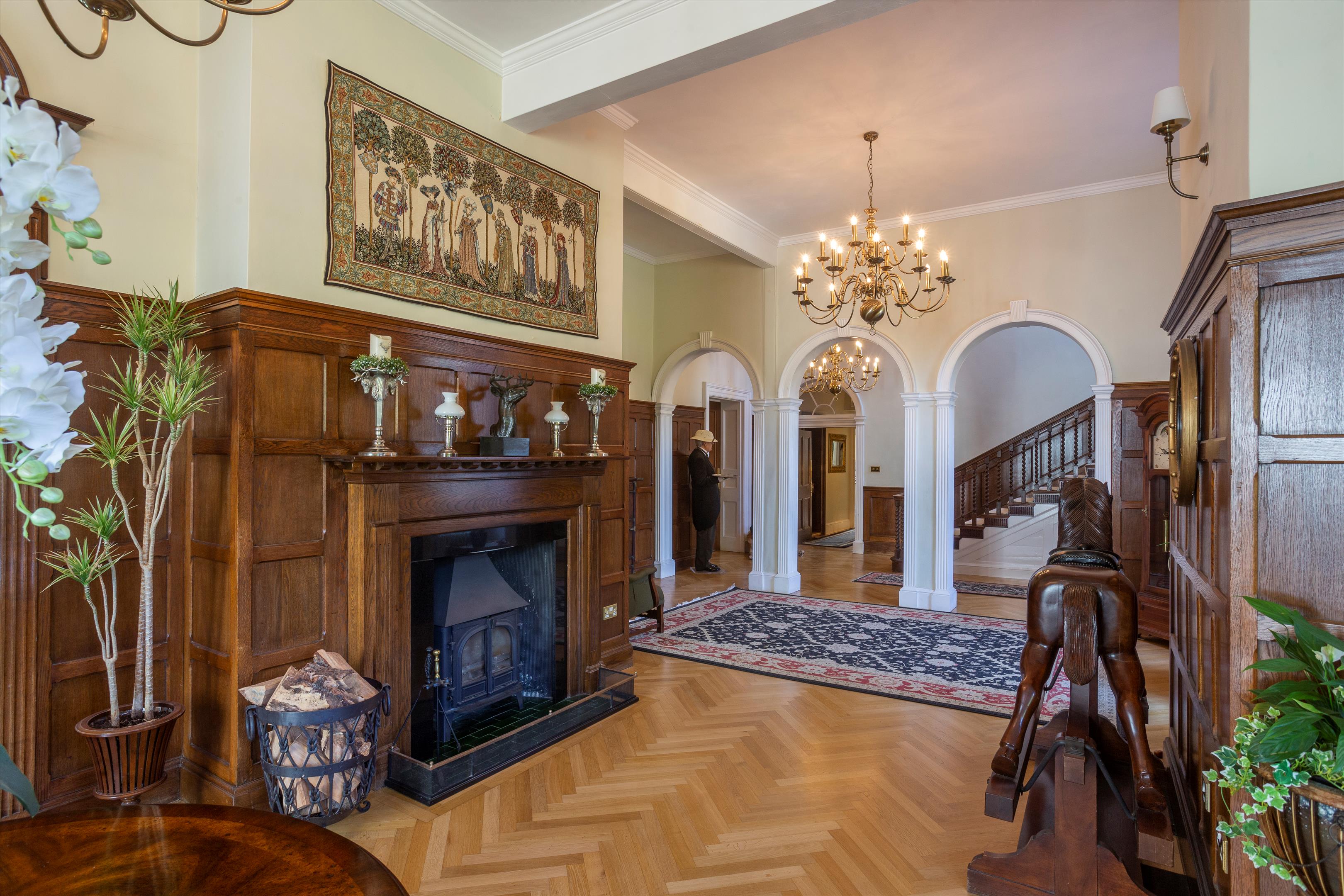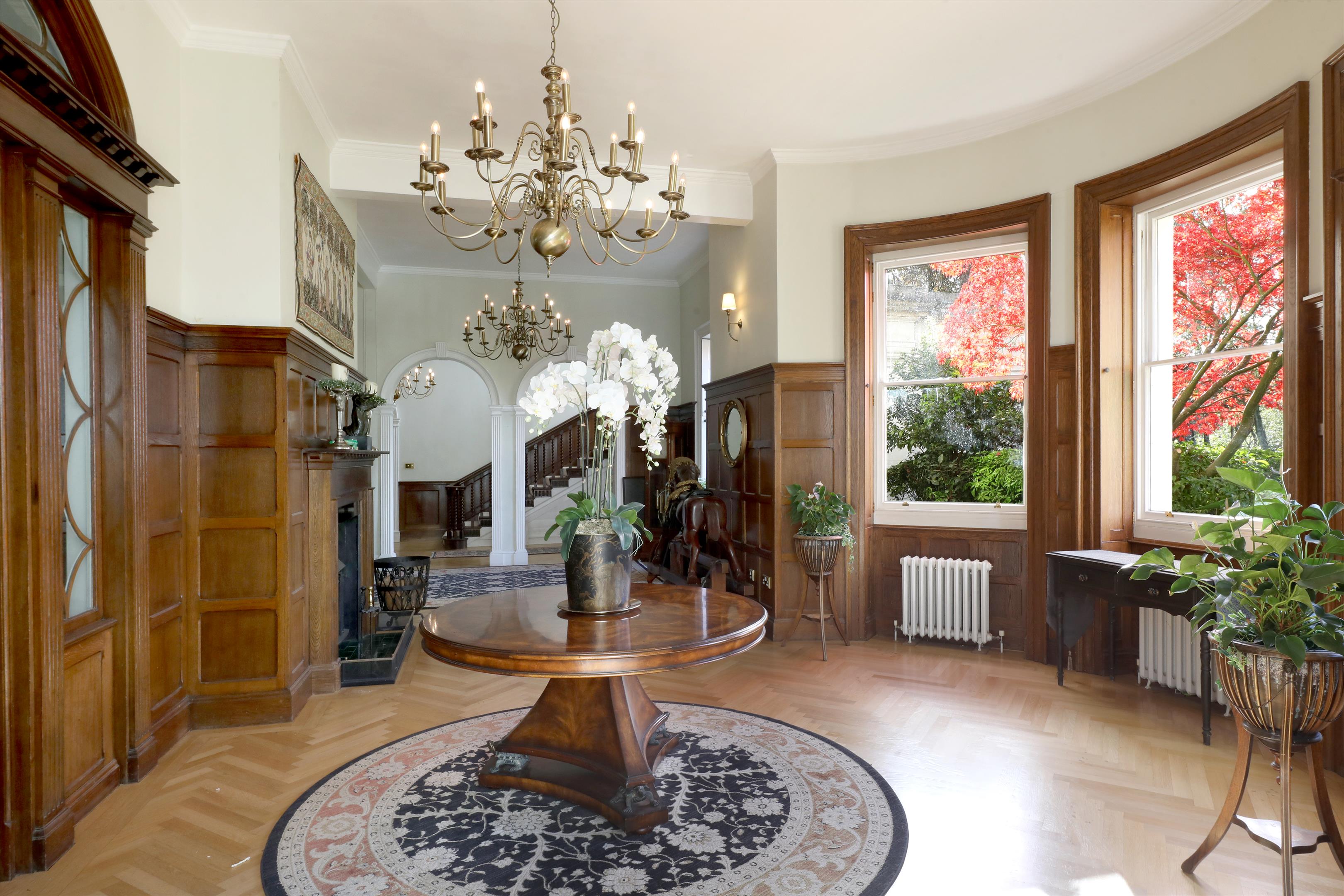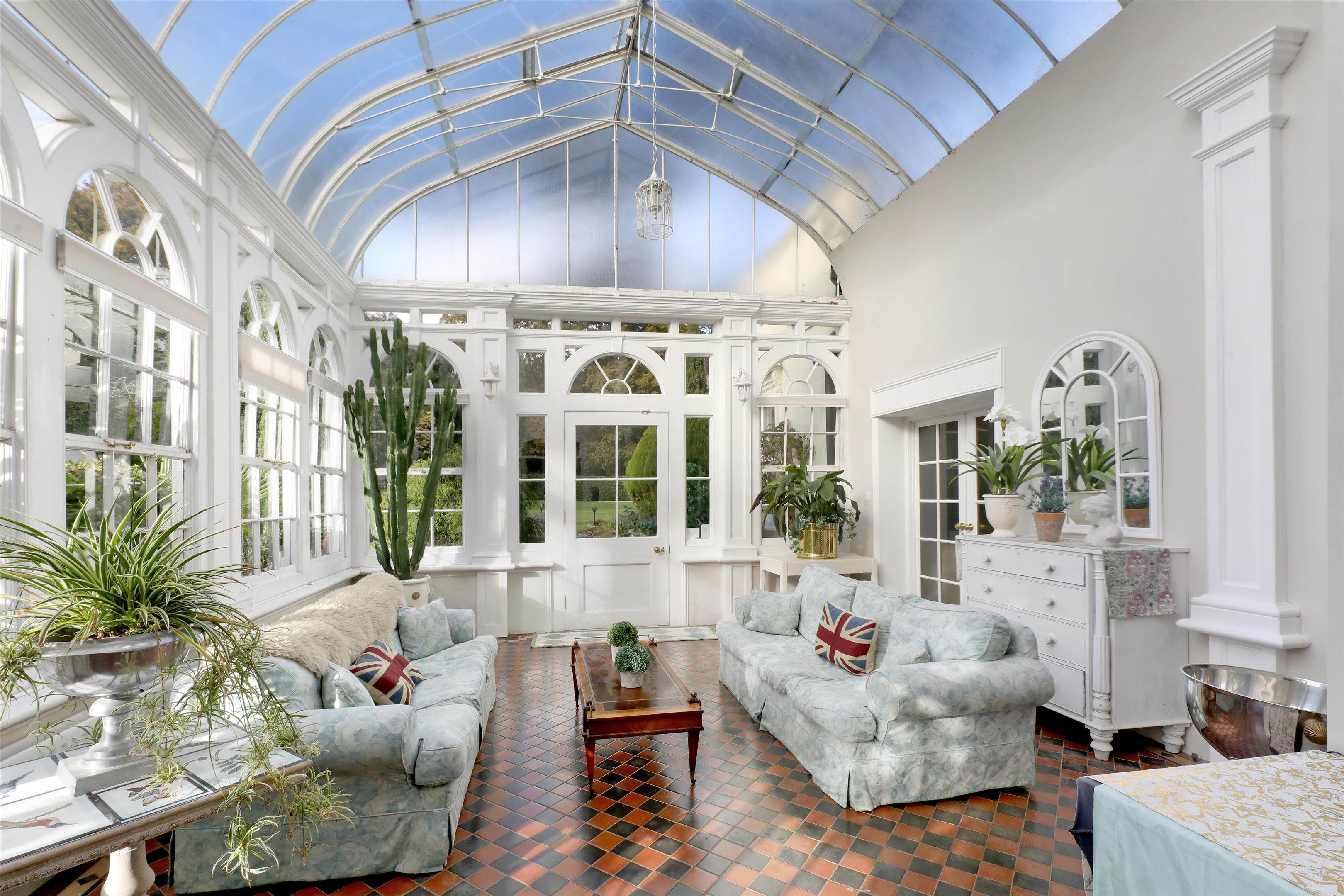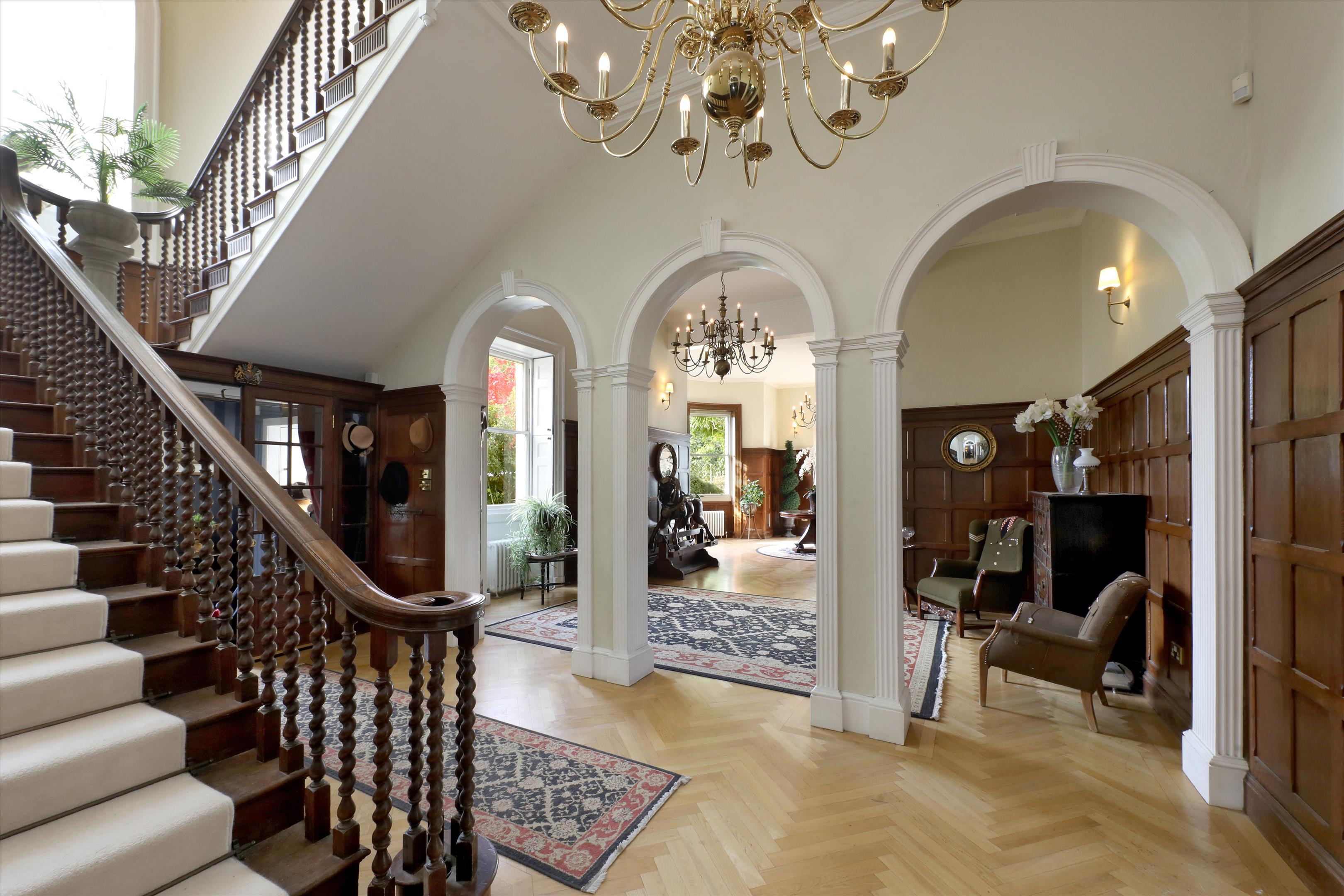 The house its self sits beautifully in its grounds with formal gardens to the East and a wild flower meadow to the West. Extending to around 9,935 square feet, the main house is arranged over three floors with the majority of the accommodation on ground and first floor, but with additional space in the lower ground. On entry via an impressive stone column portico there is a grand reception hall giving access to the rest of the extensive receptions rooms which includes a large kitchen / breakfast room with bay window, dining room, drawing room, sitting room, snug / library and a stunning glazed orangery of a Victorian style. In keeping with the characteristics of a property from this period all of the rooms have excellent ceiling heights and an abundance of natural light served by the large sash windows overlooking the gardens. There is also exquisite original detailing in the ceiling plasterwork, beautiful original fire places, wall panelling and wonderful wooden flooring.