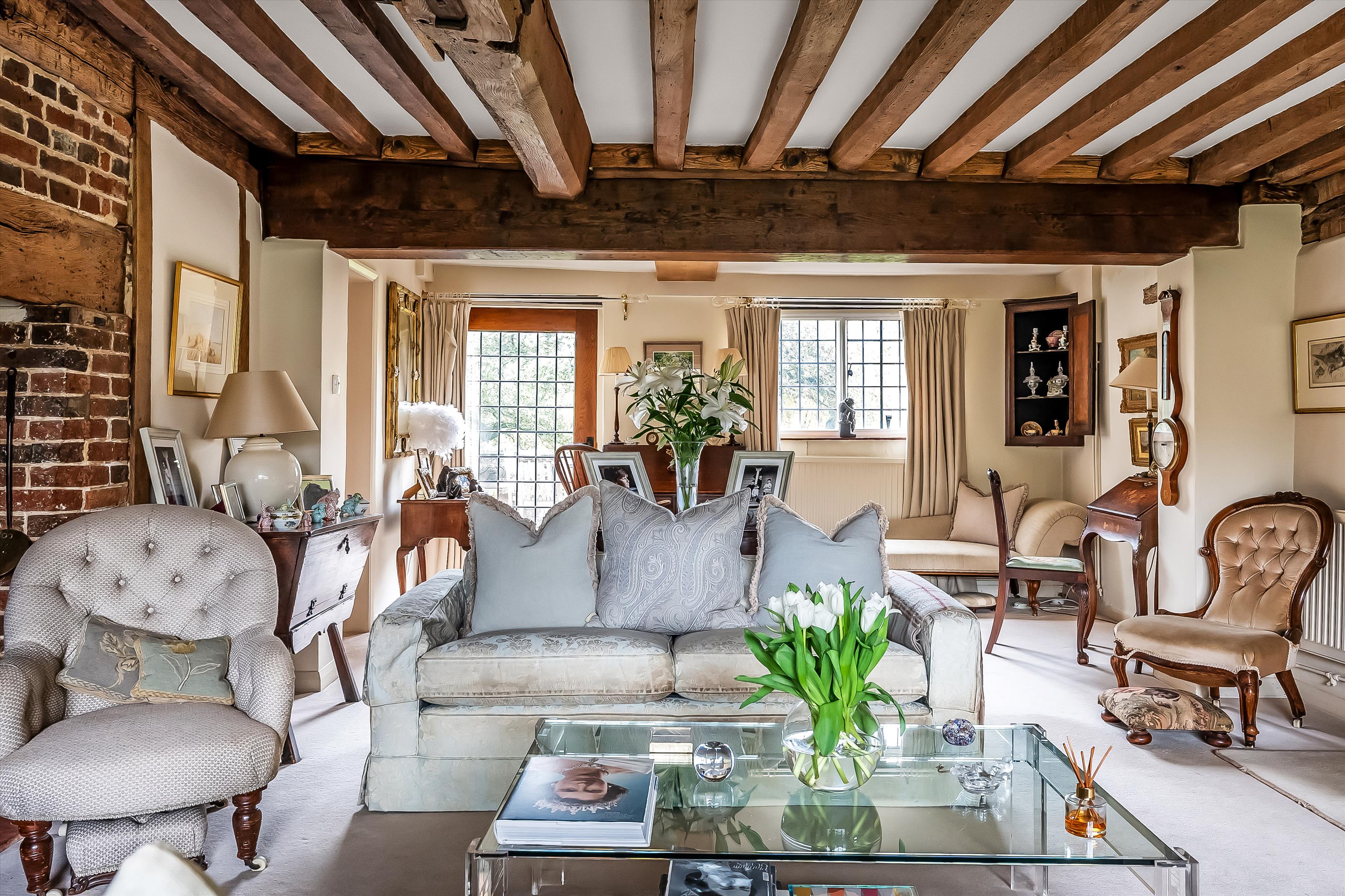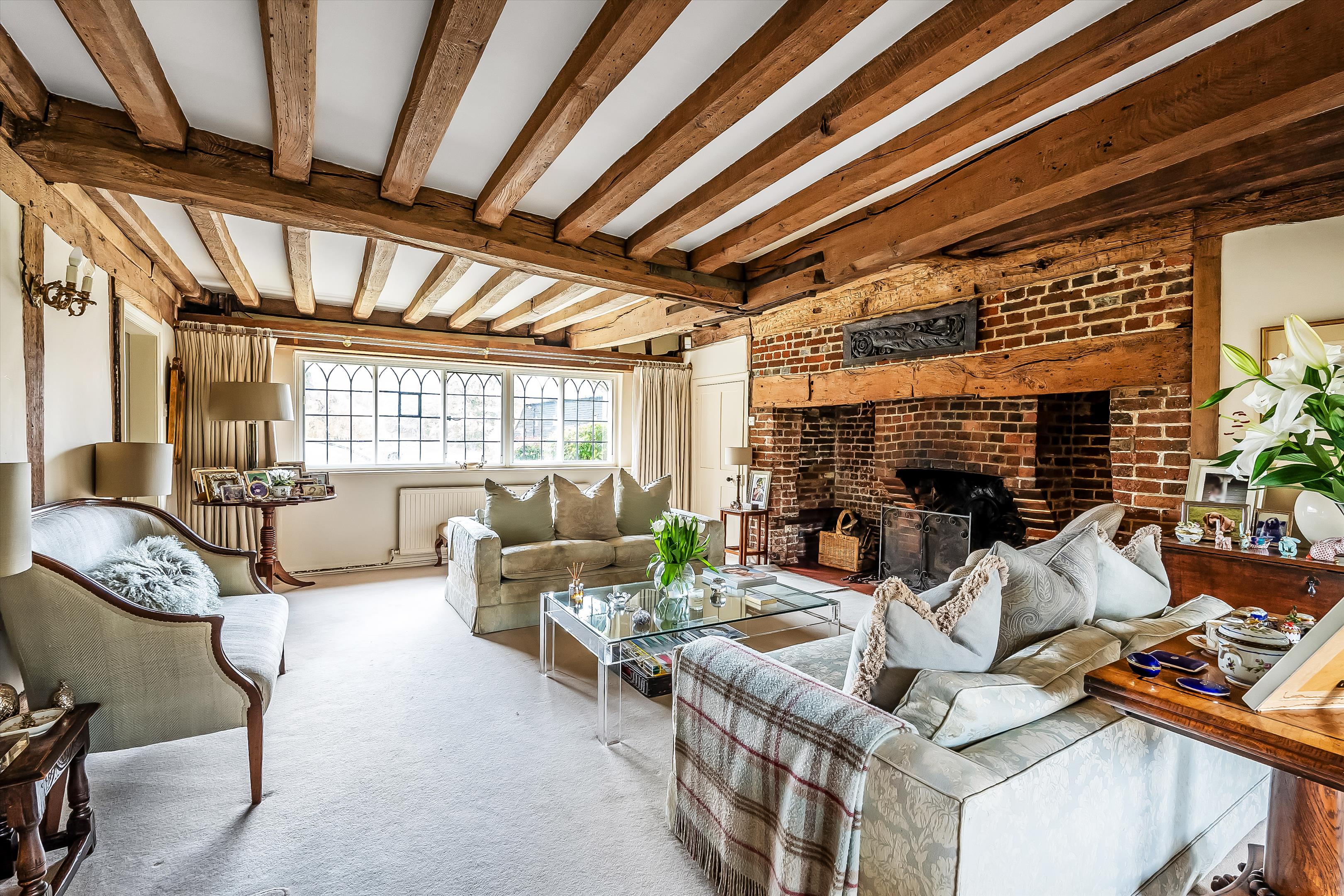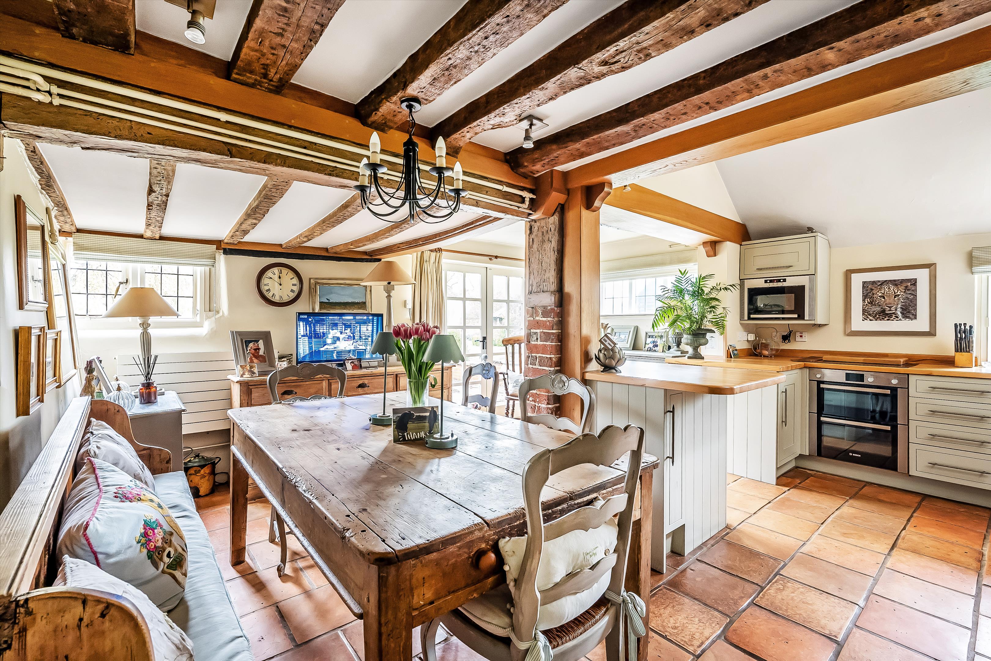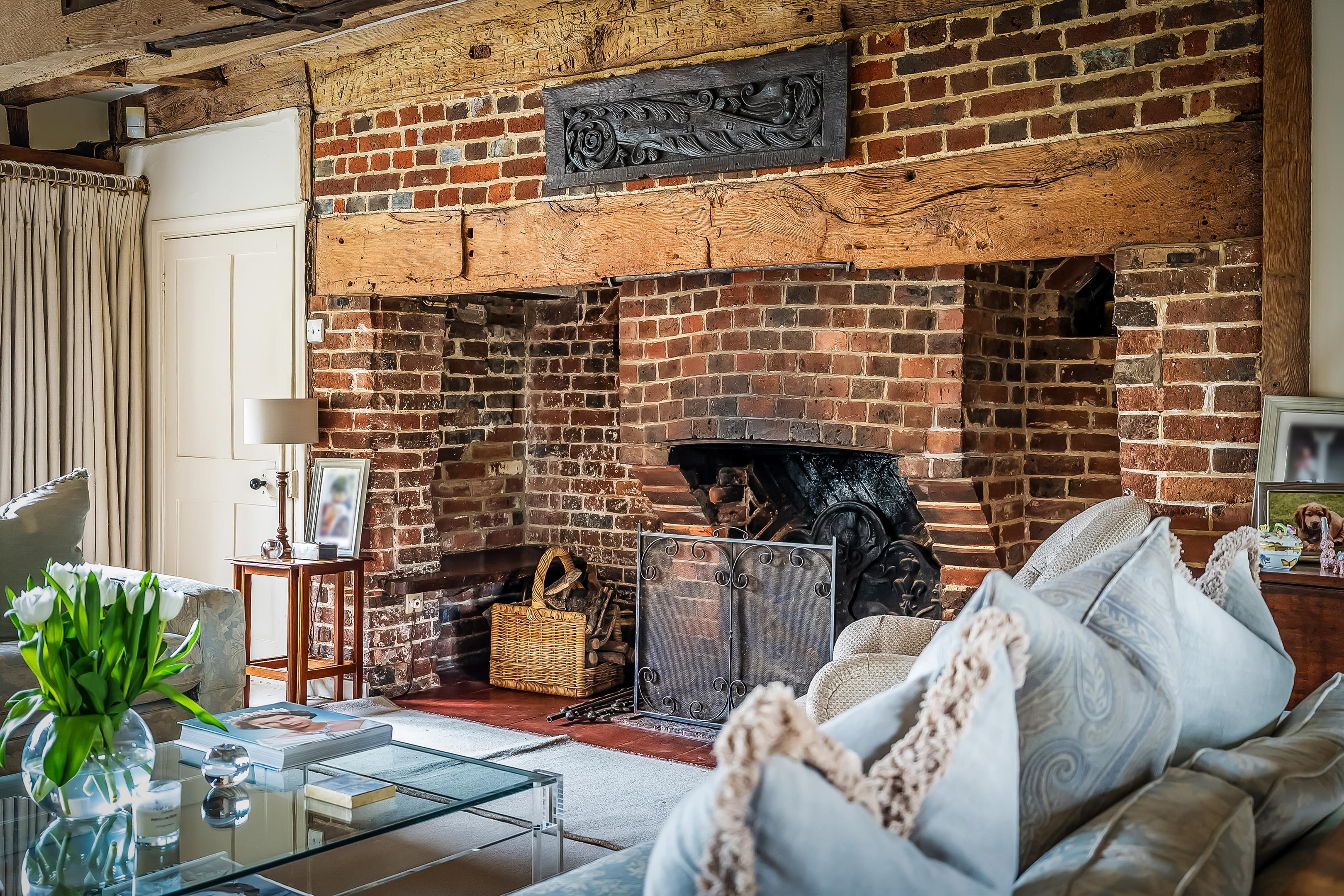 The property showcases wonderful period features, including a red-brick inglenook fireplace and original exposed beams throughout.