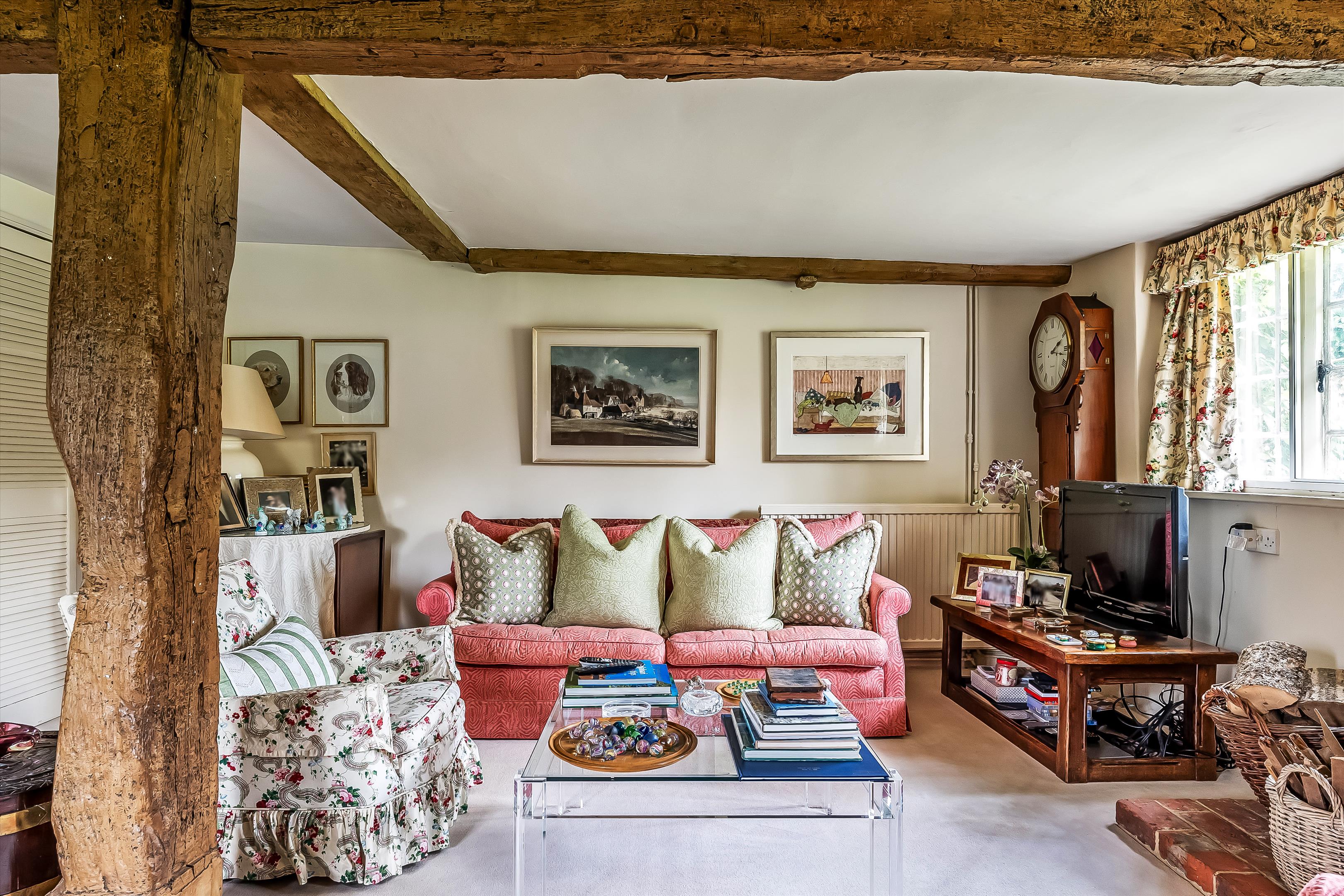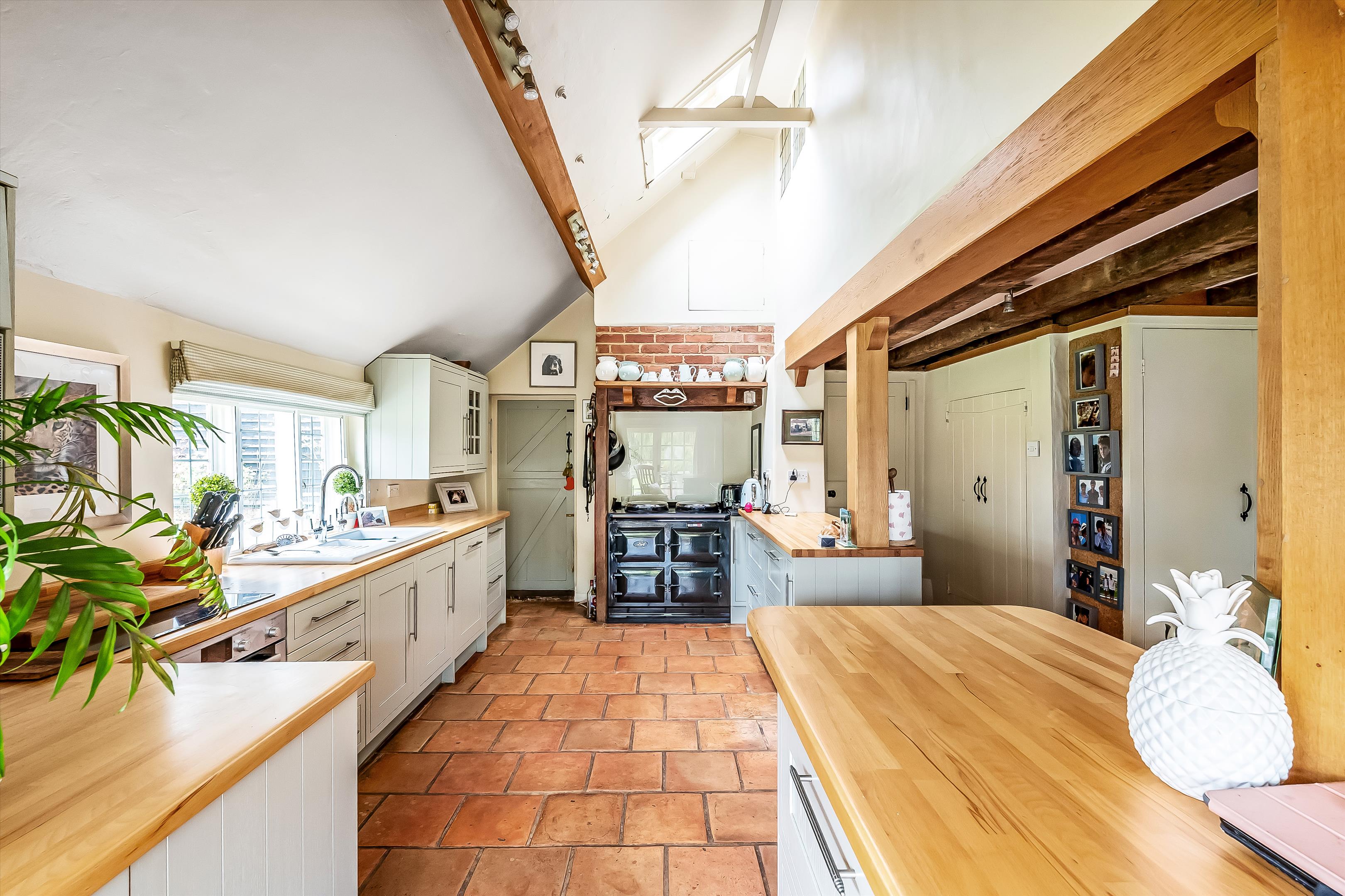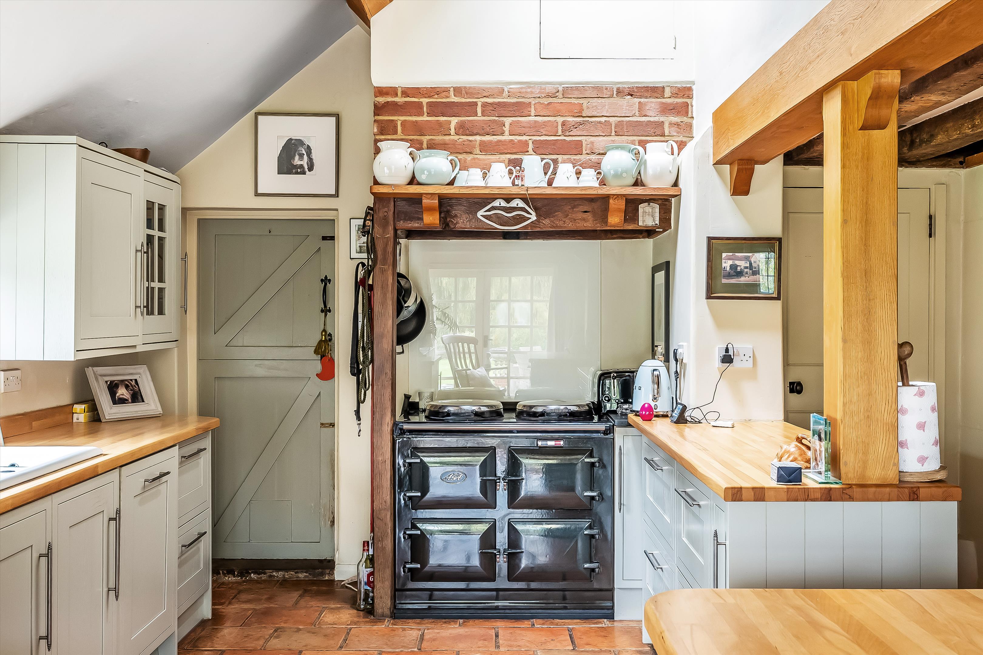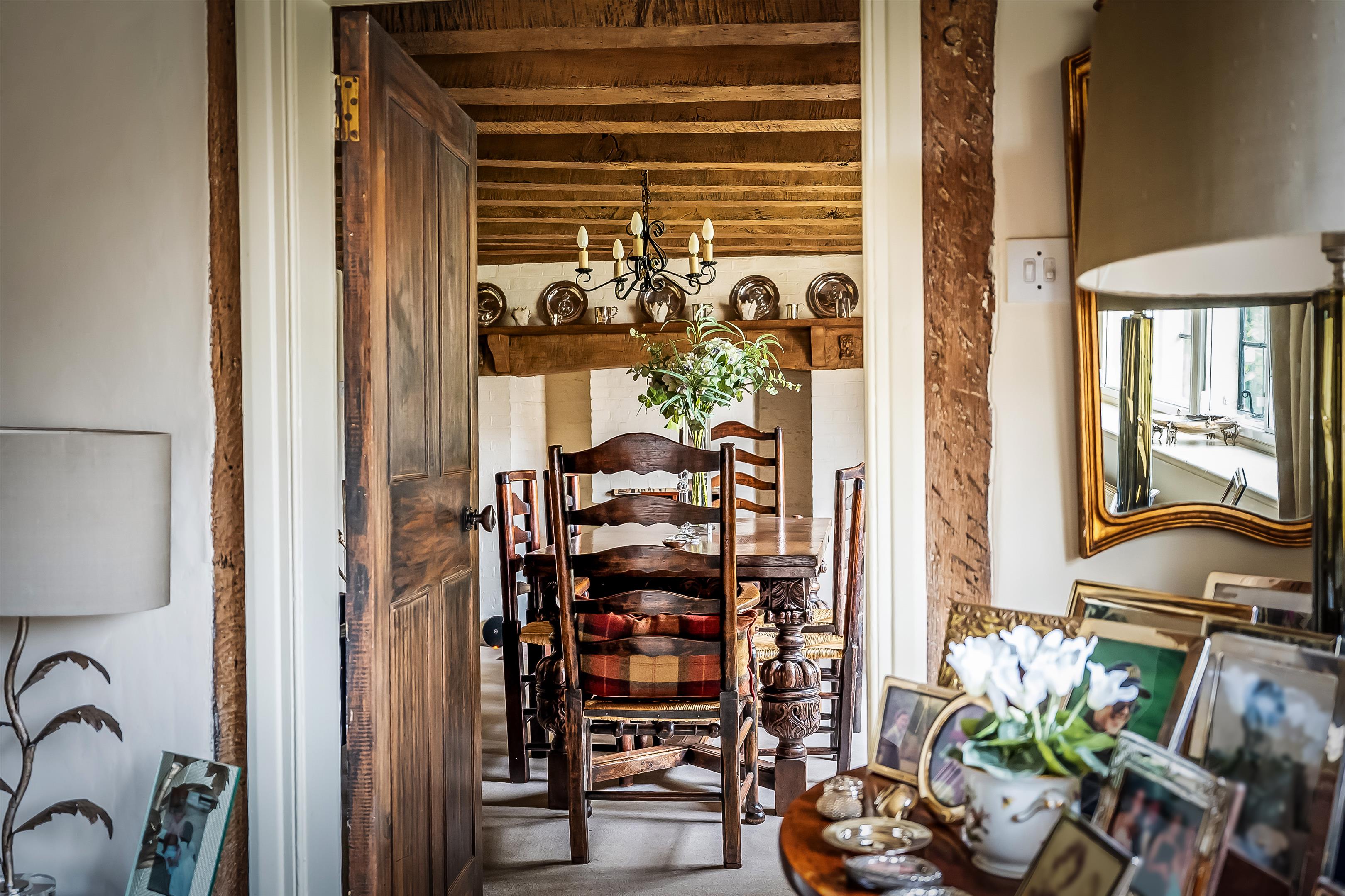 The property showcases wonderful period features, including a red-brick inglenook fireplace and original exposed beams throughout.