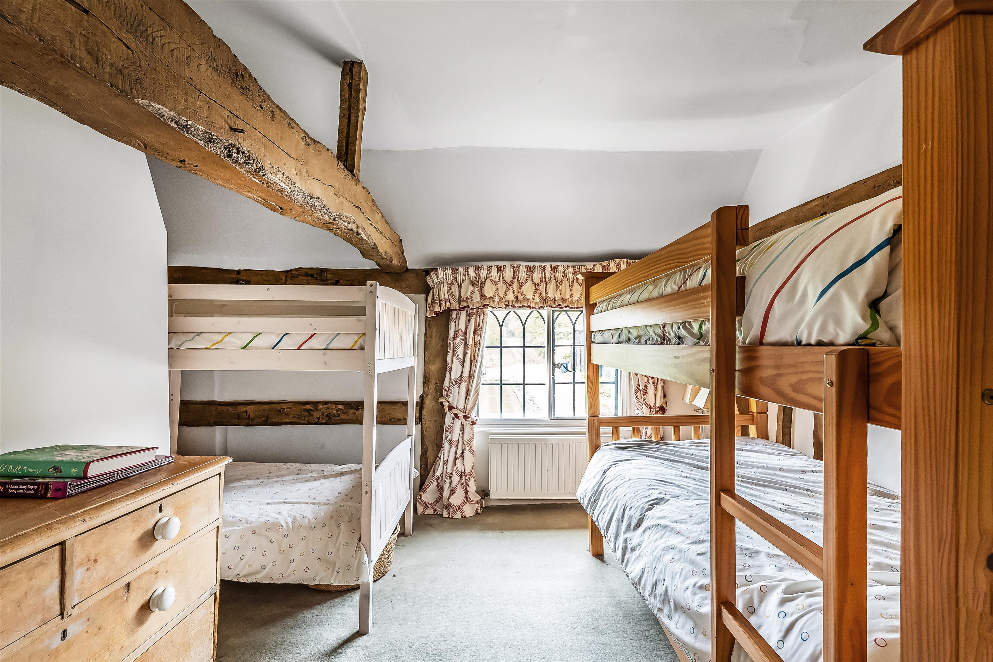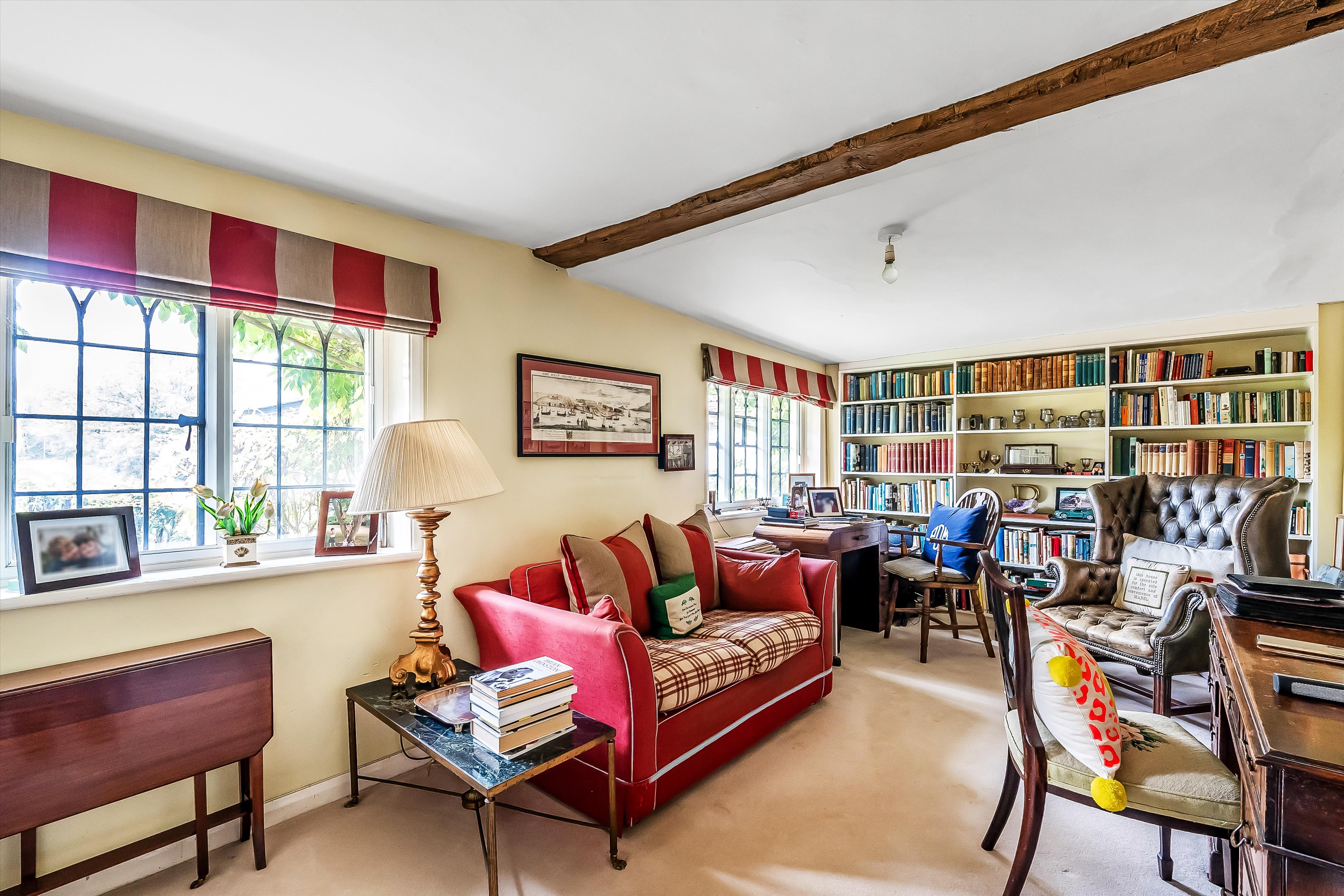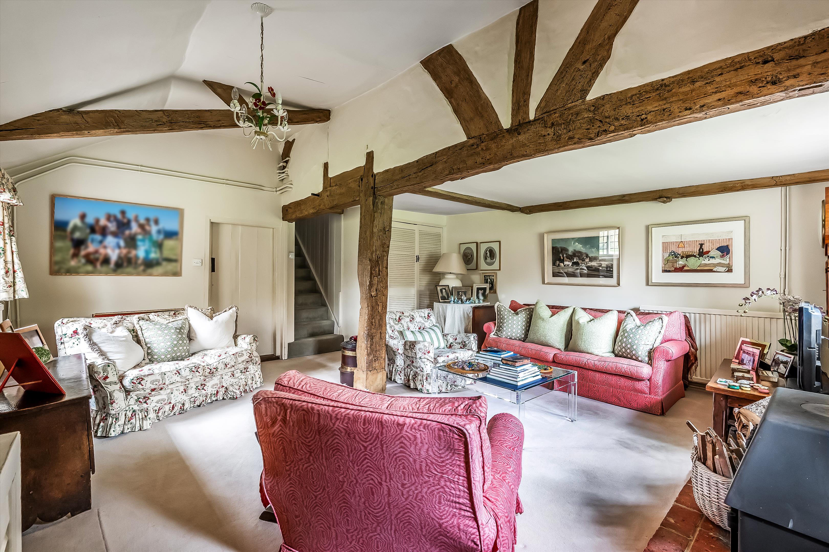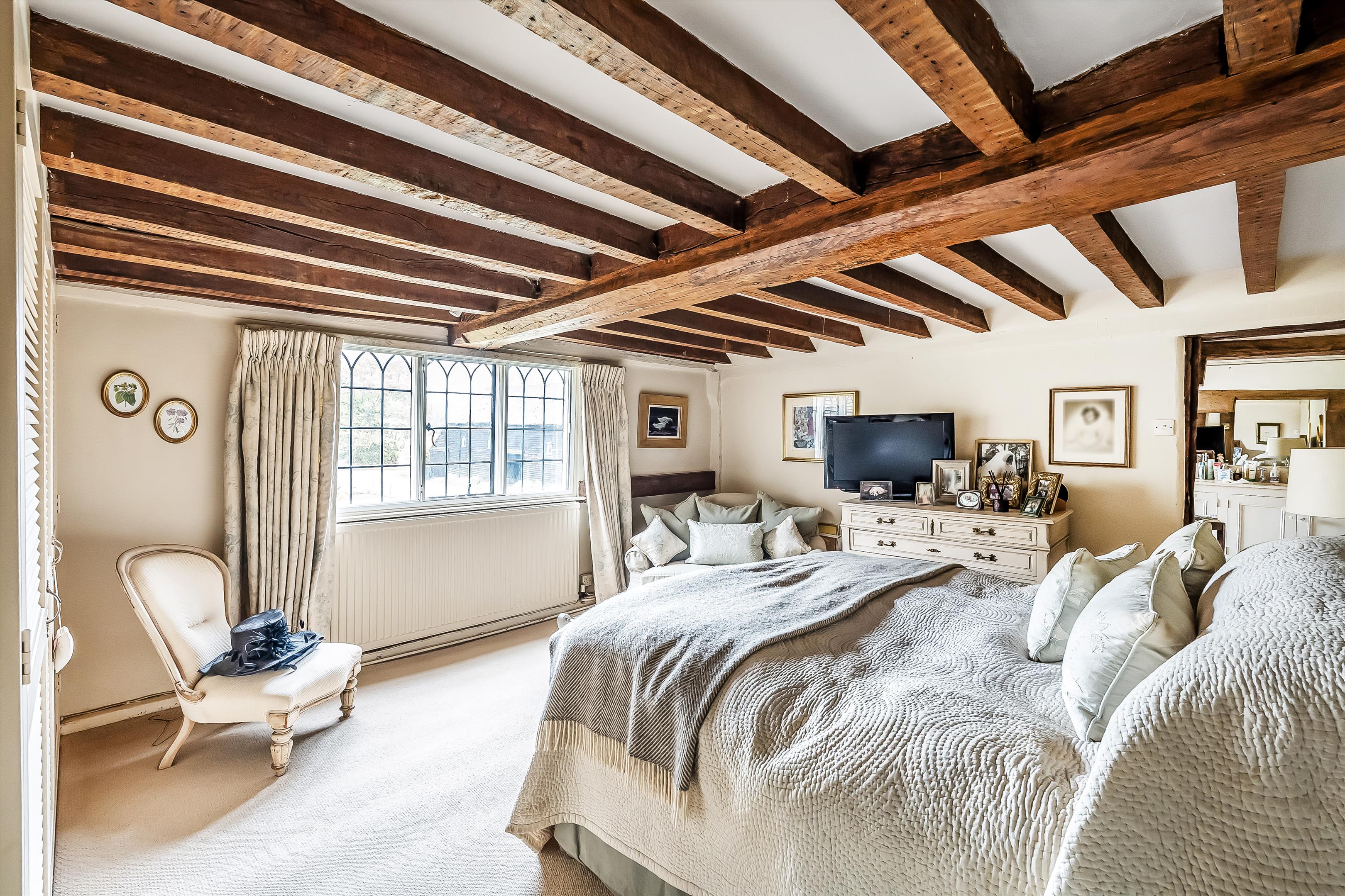 The property showcases wonderful period features, including a red-brick inglenook fireplace and original exposed beams throughout.